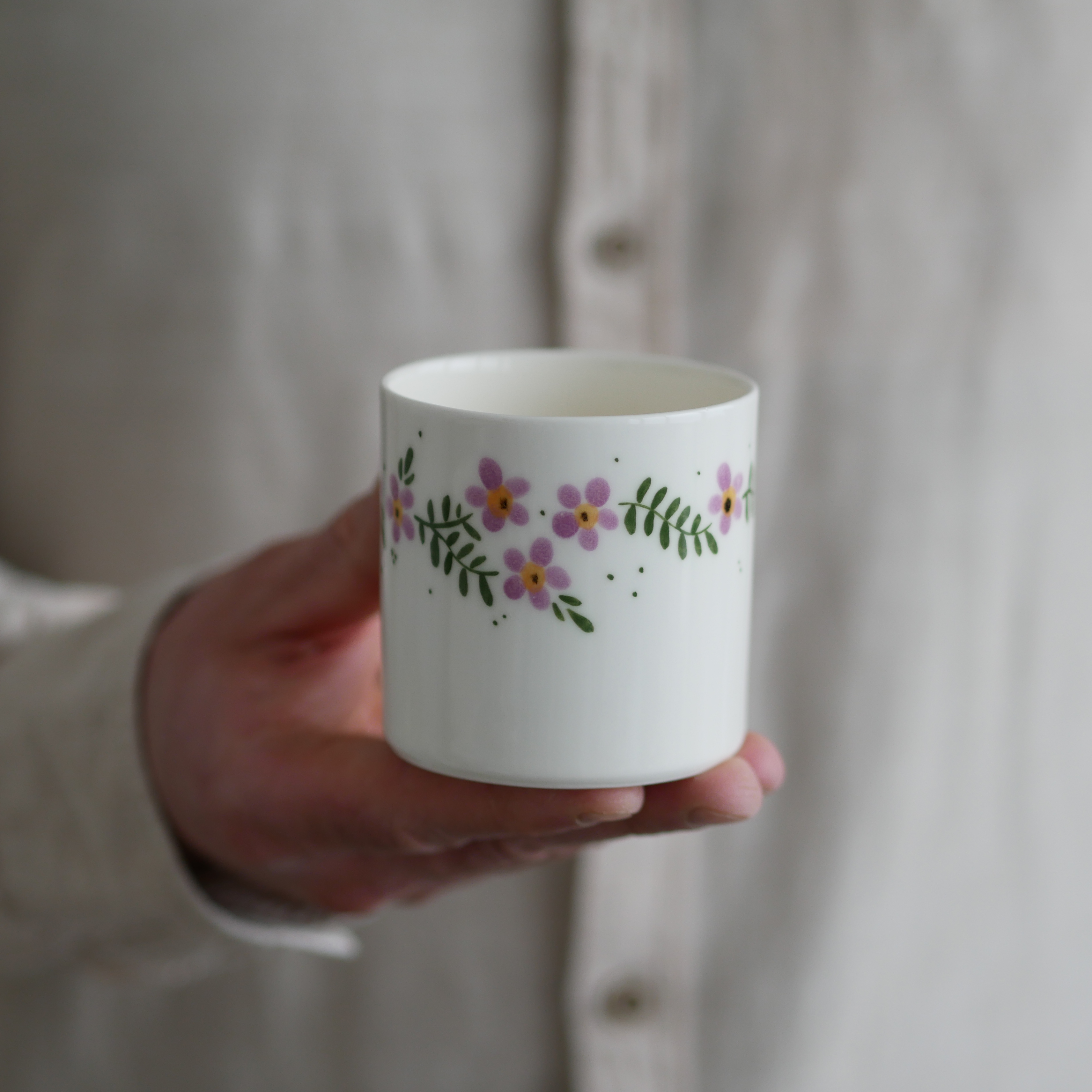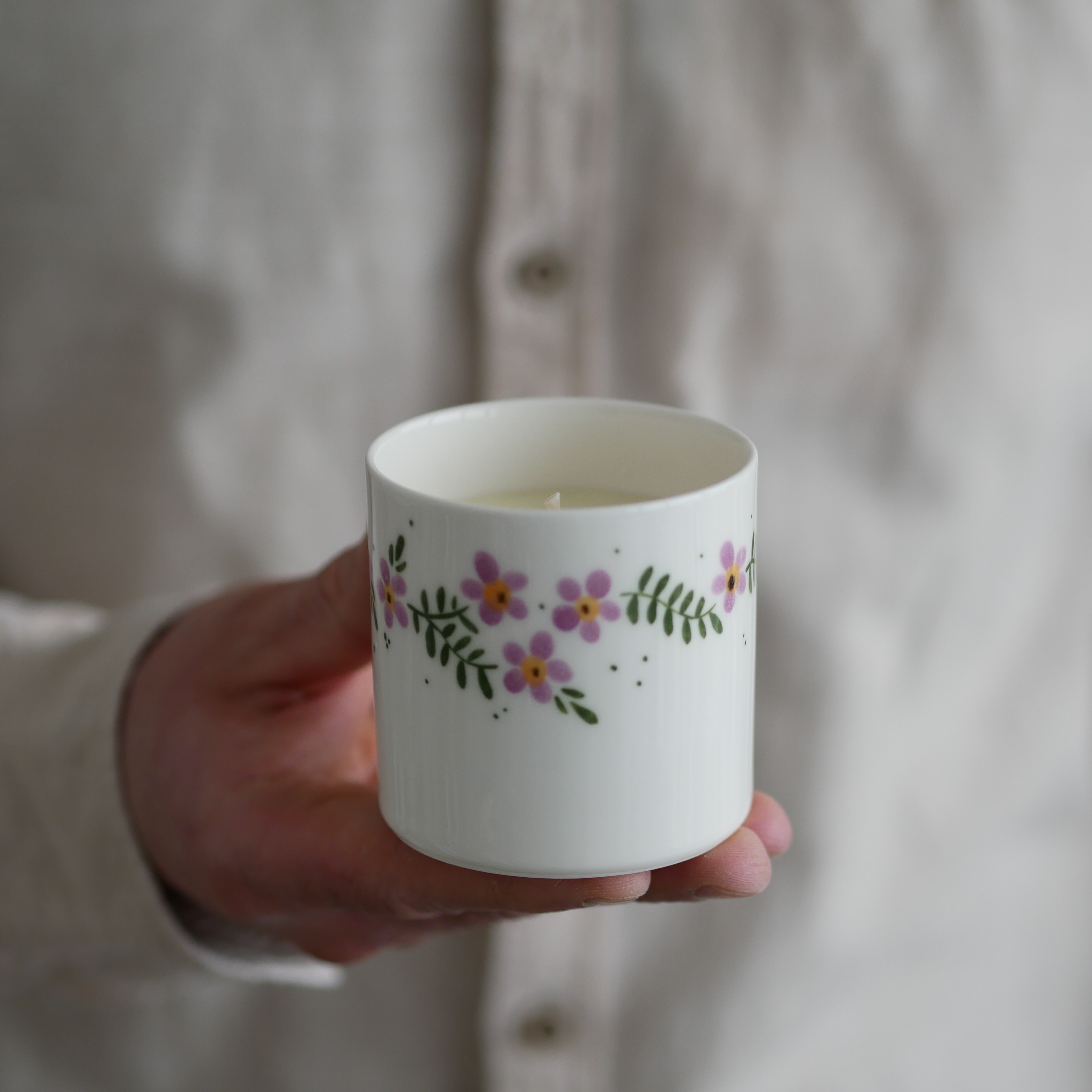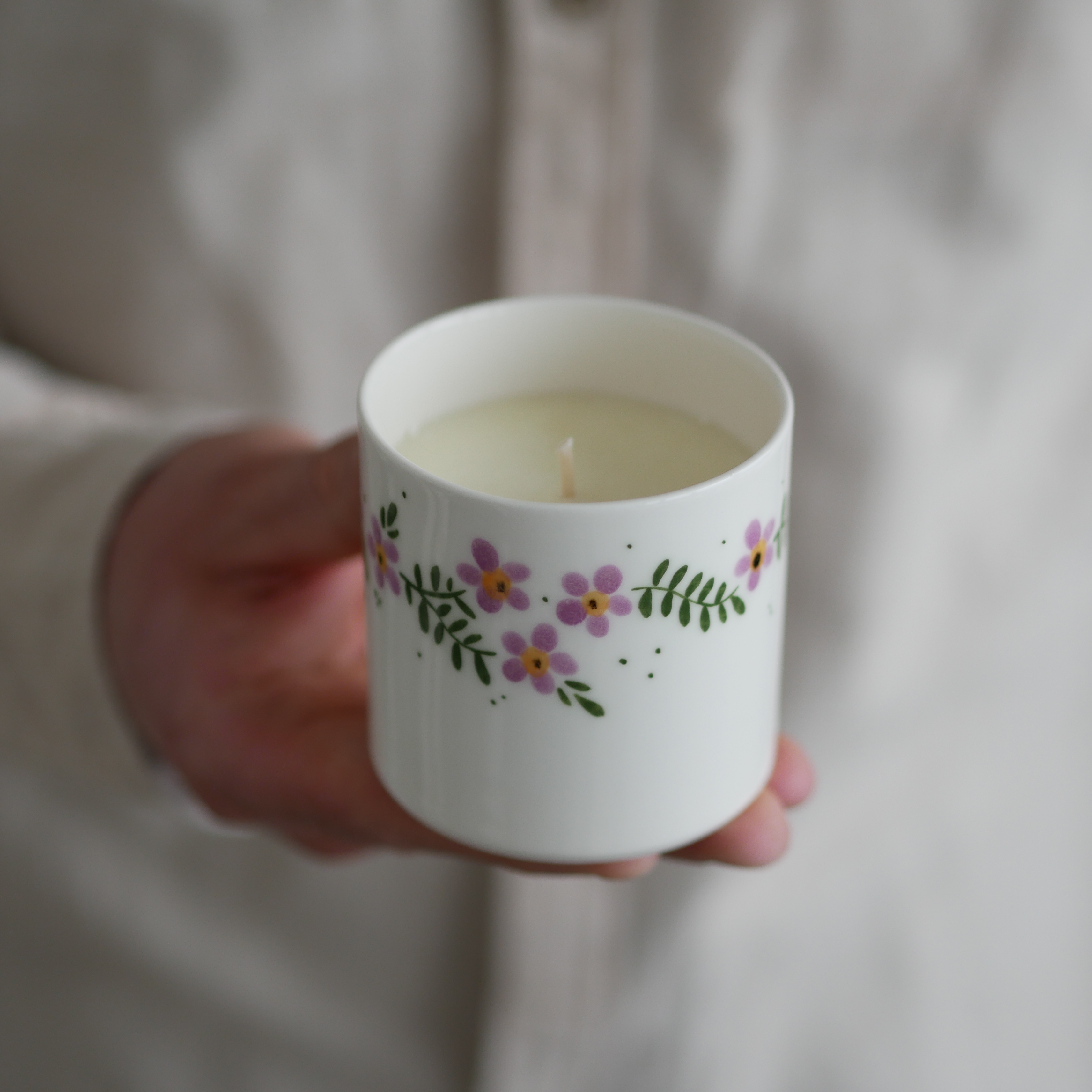 Zapach CHAMPAGNE BUBBLES zamknięty w porcelanowej osłonce w fioletowe kwiaty wiejskie.