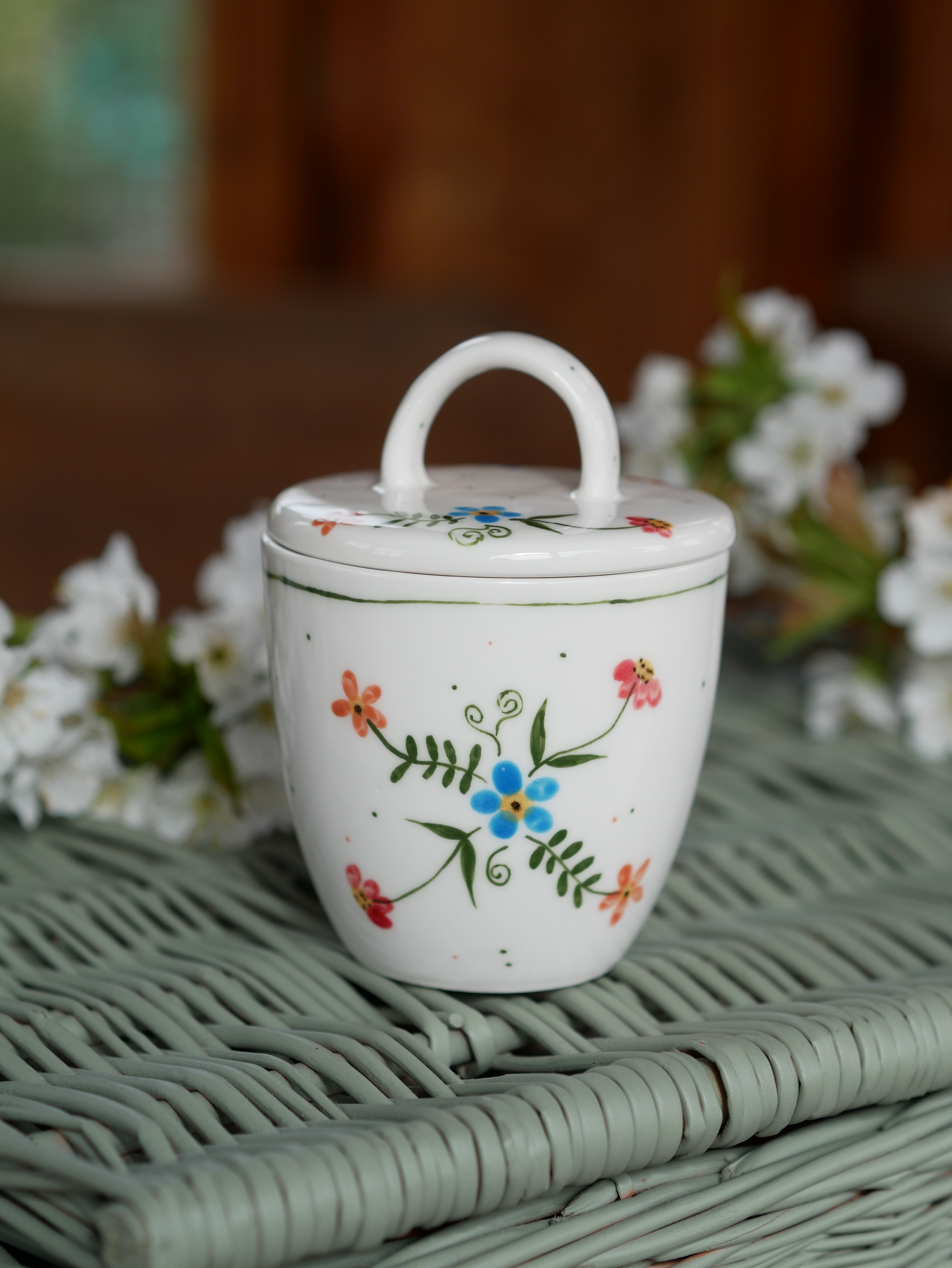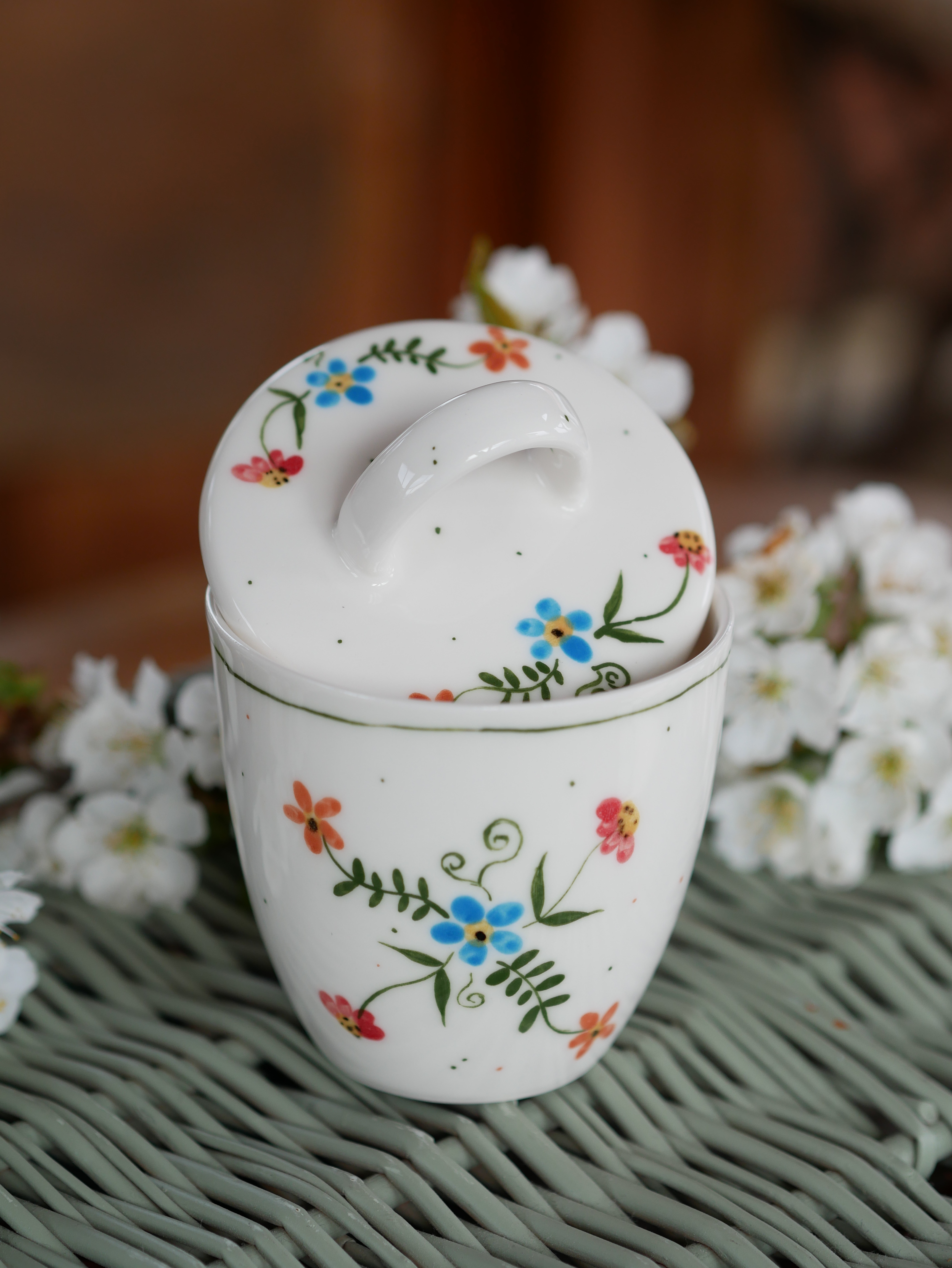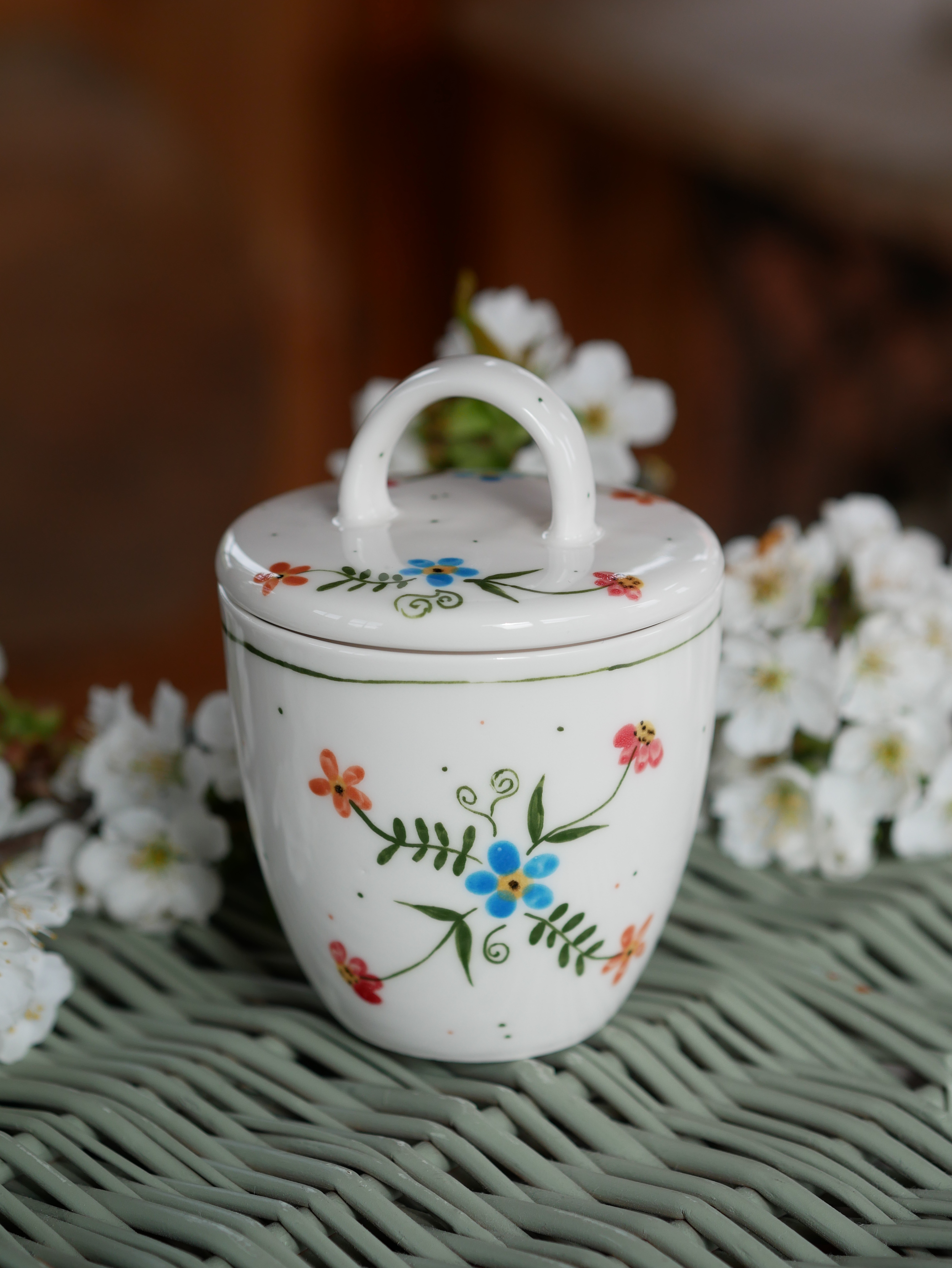 Kwiaty maluję ręcznie, dlatego na każdym kubku wzór będzie wyglądać inaczej - zdjęcie poglądowe.