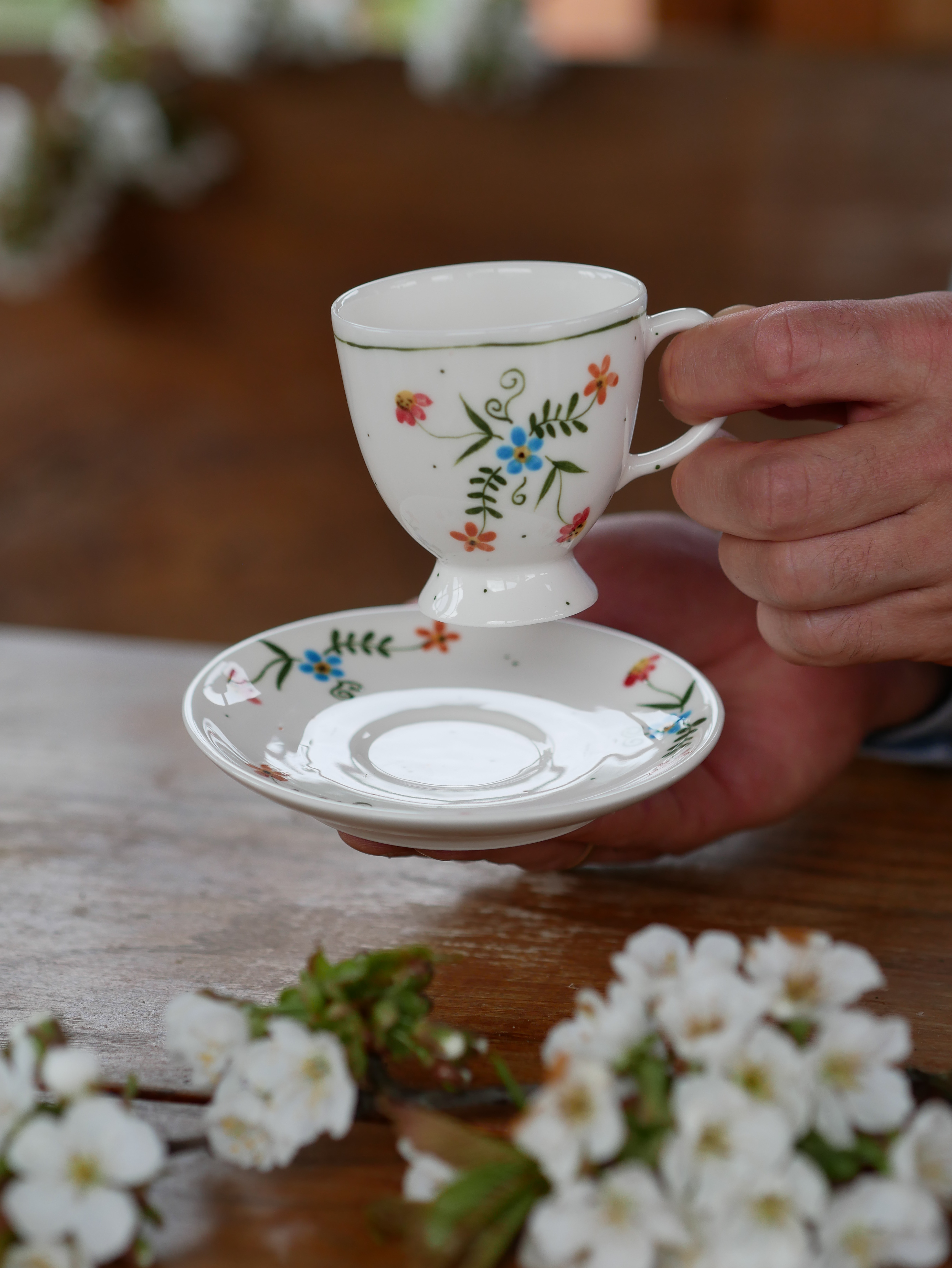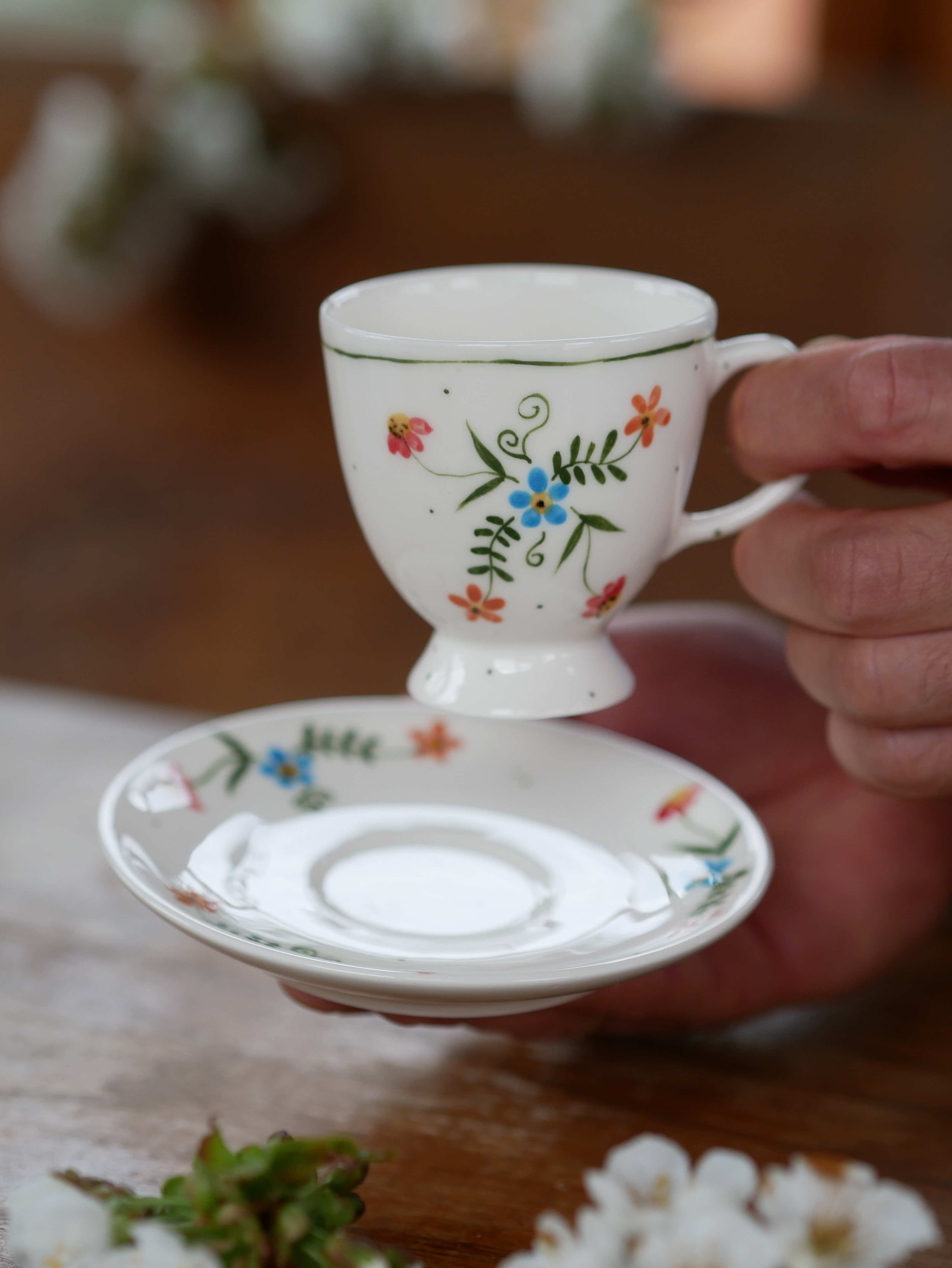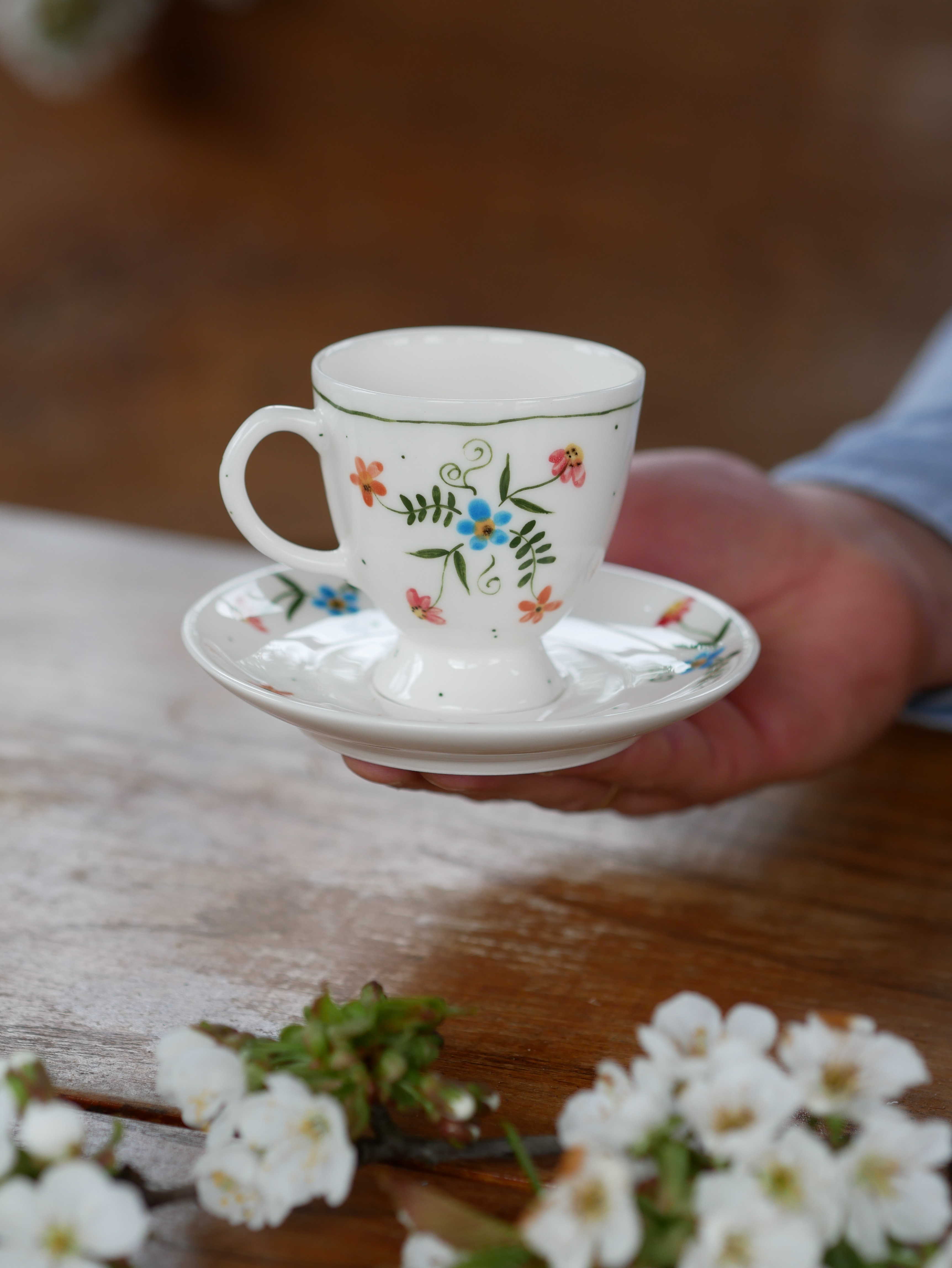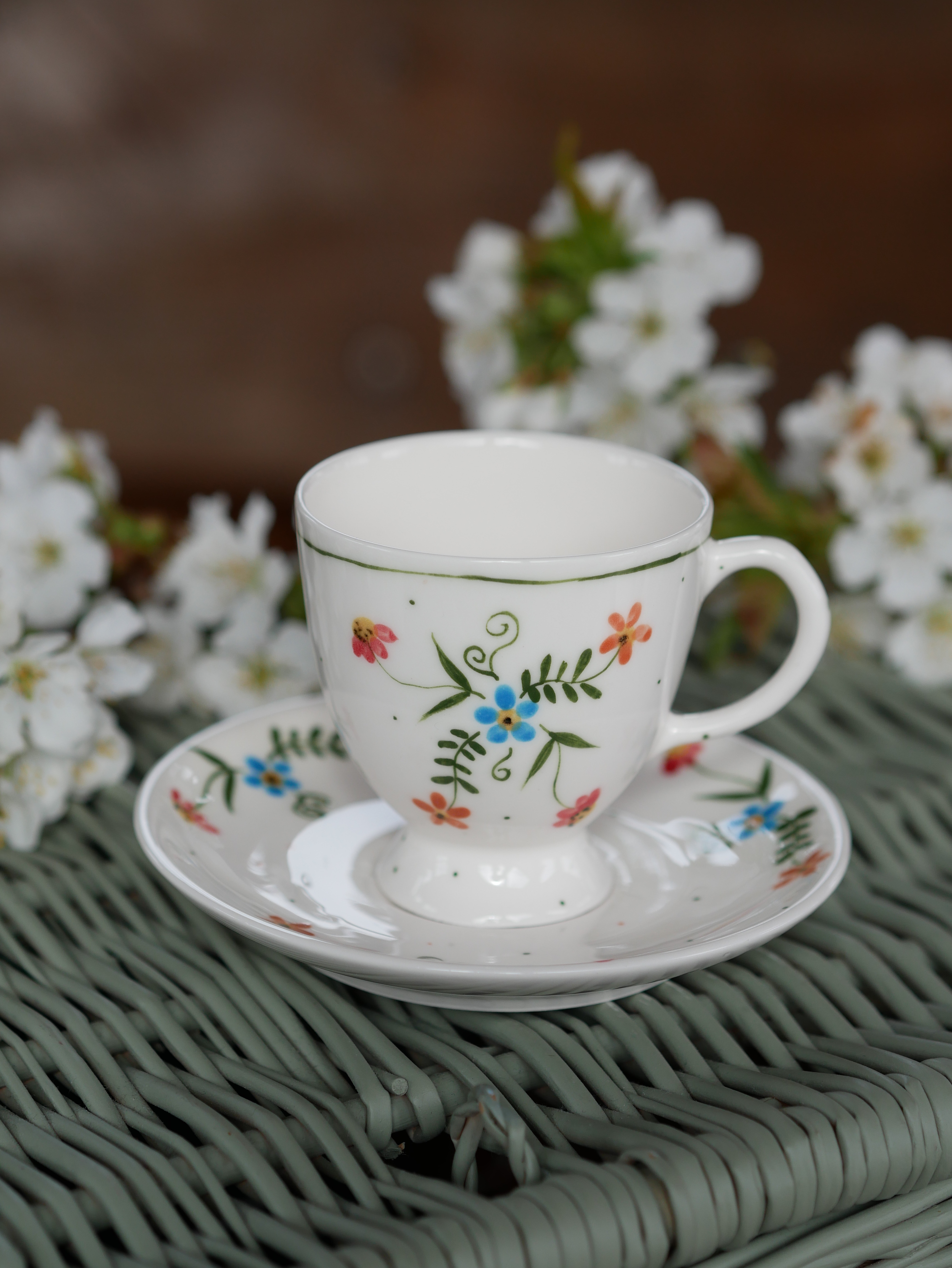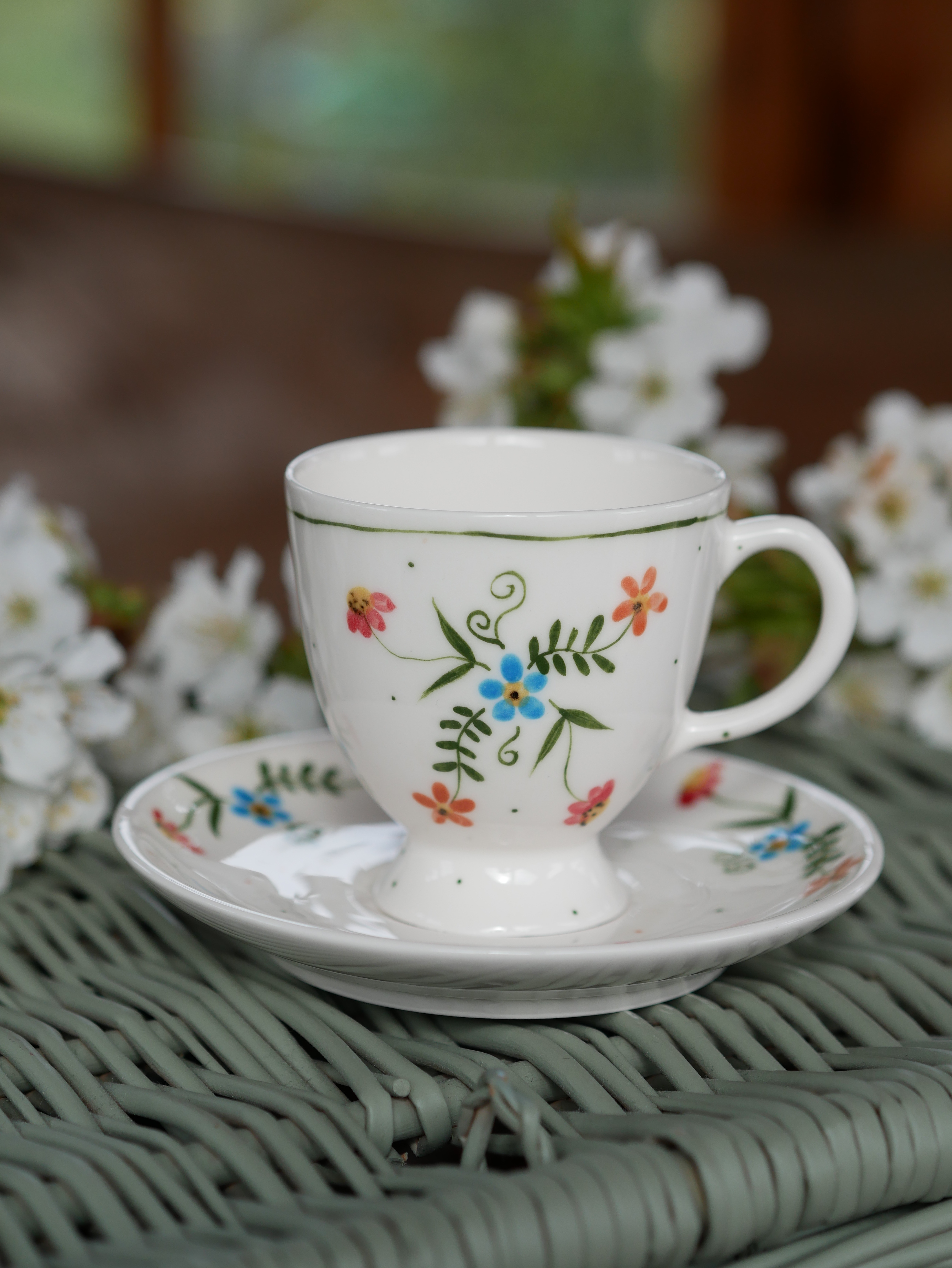 Filiżanka 110ml na nóżce wiejska opowieść z białym uszkiem + talerzyk