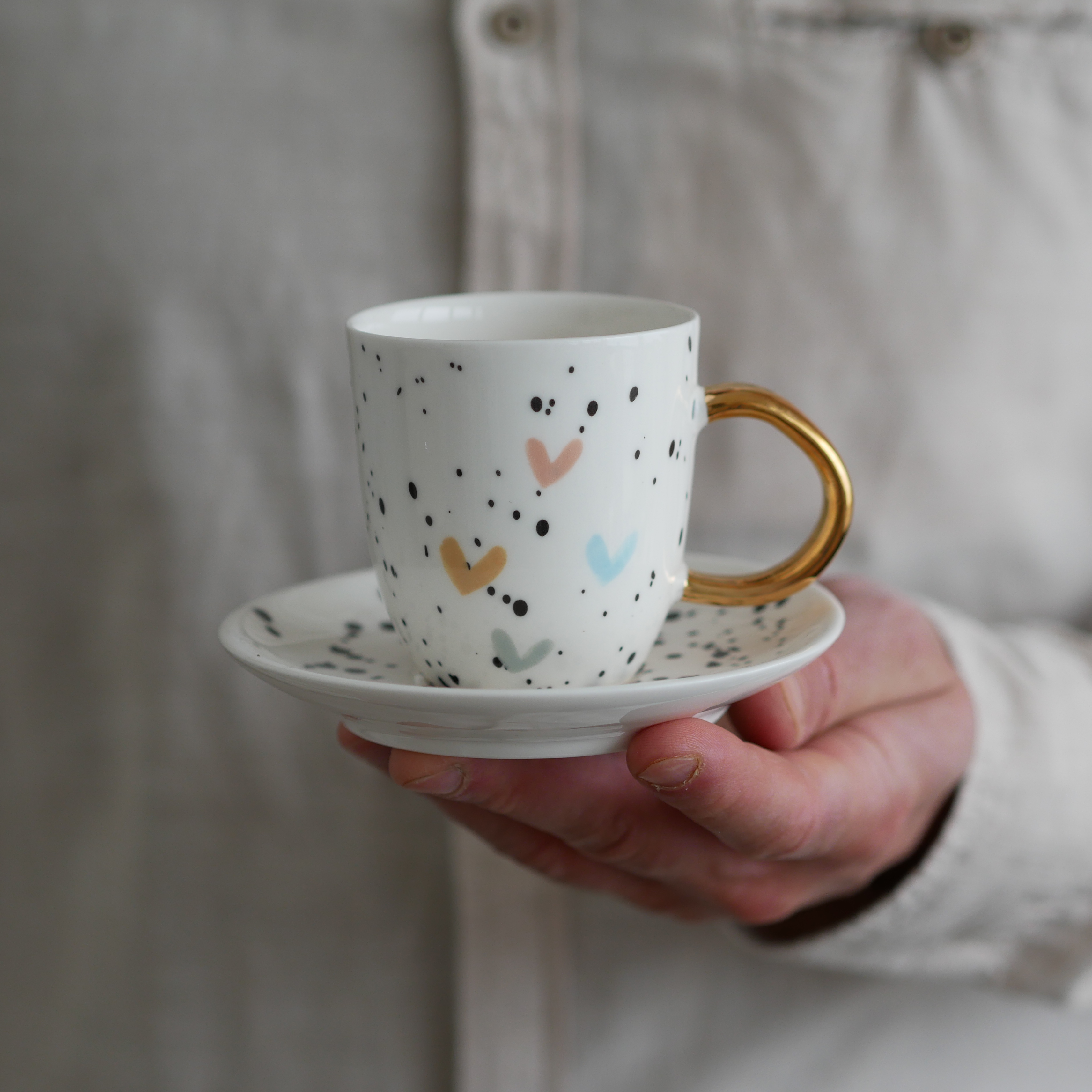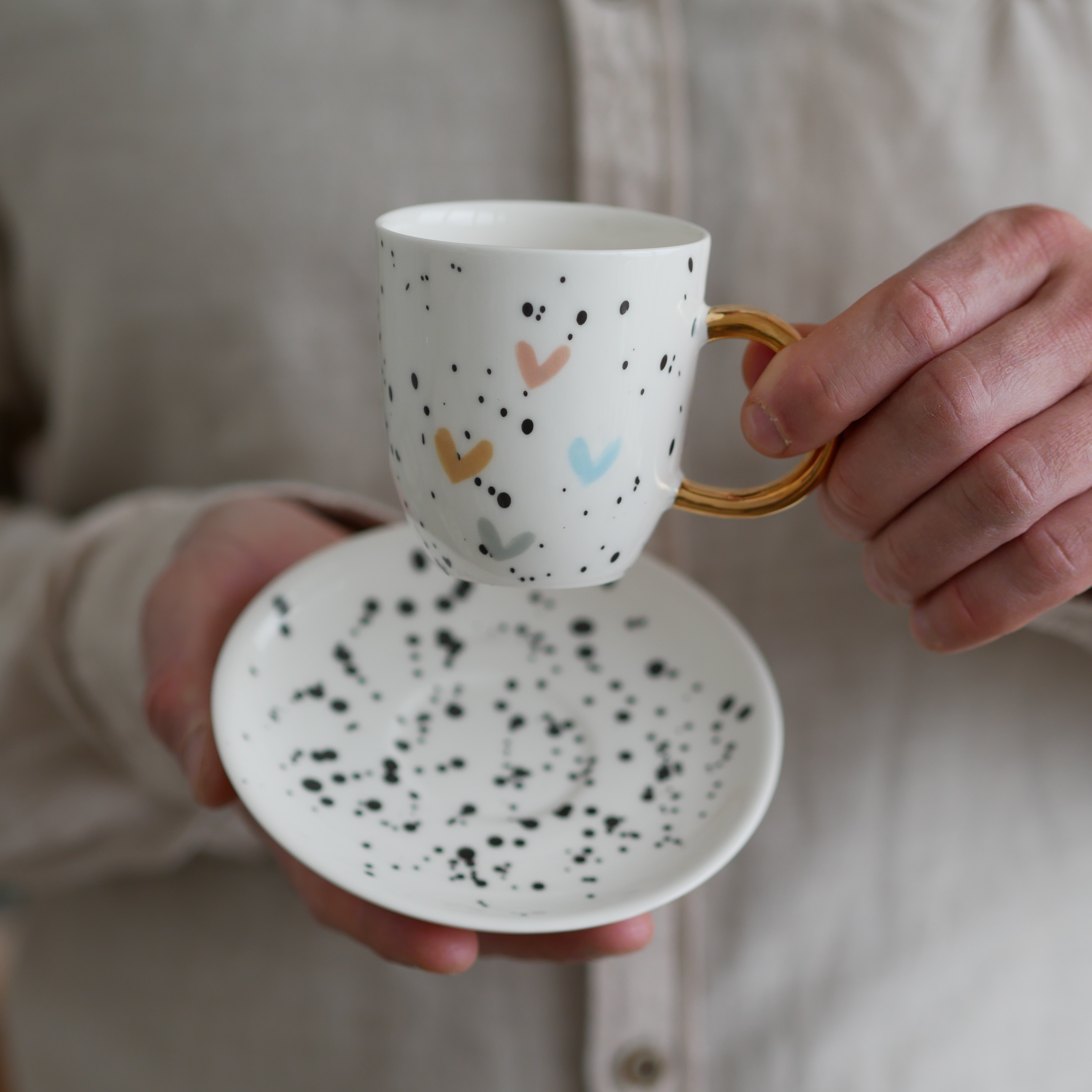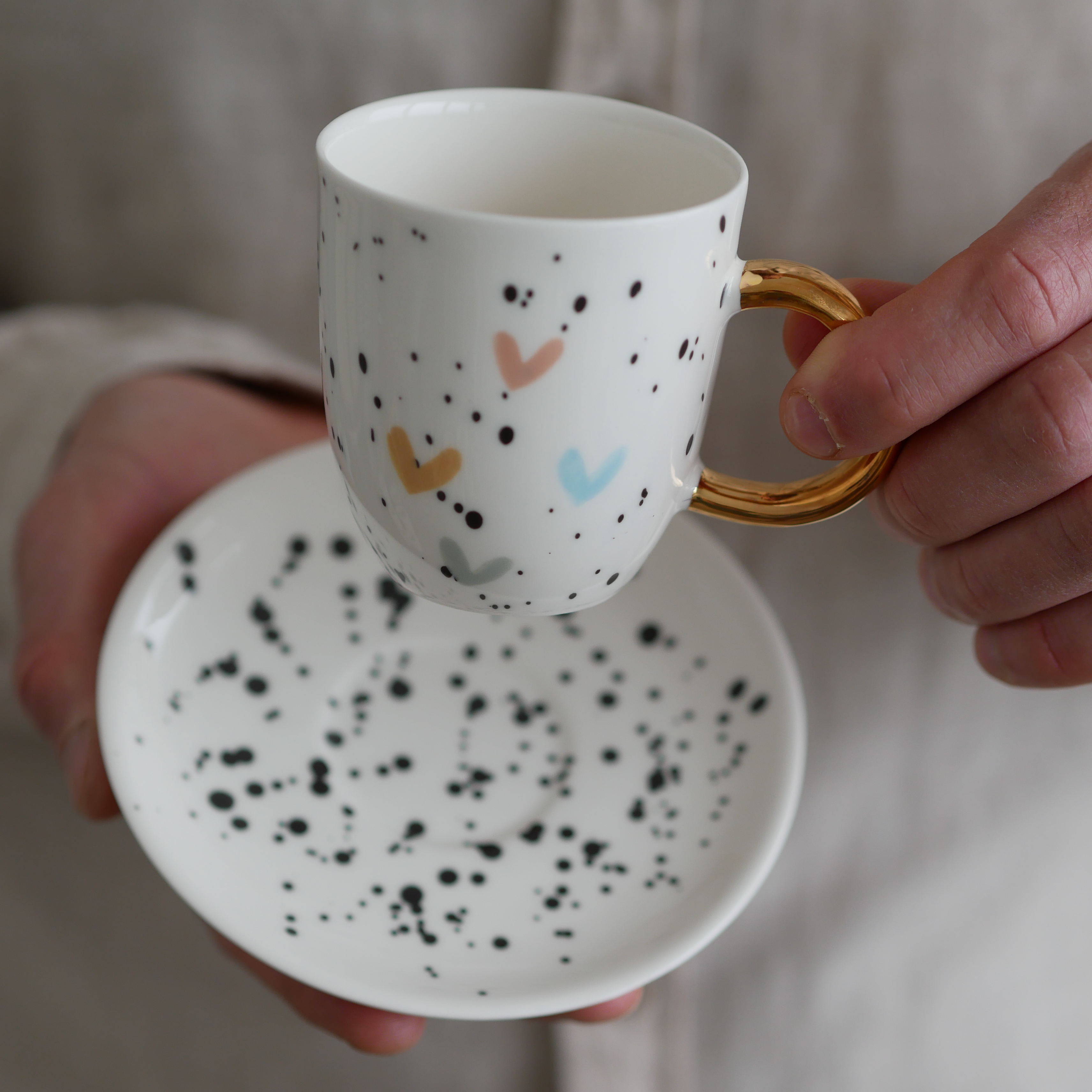 Mała filiżanka w czarne kropki z kolorowymi serduszkami i złotym uszkiem + talerzyk.