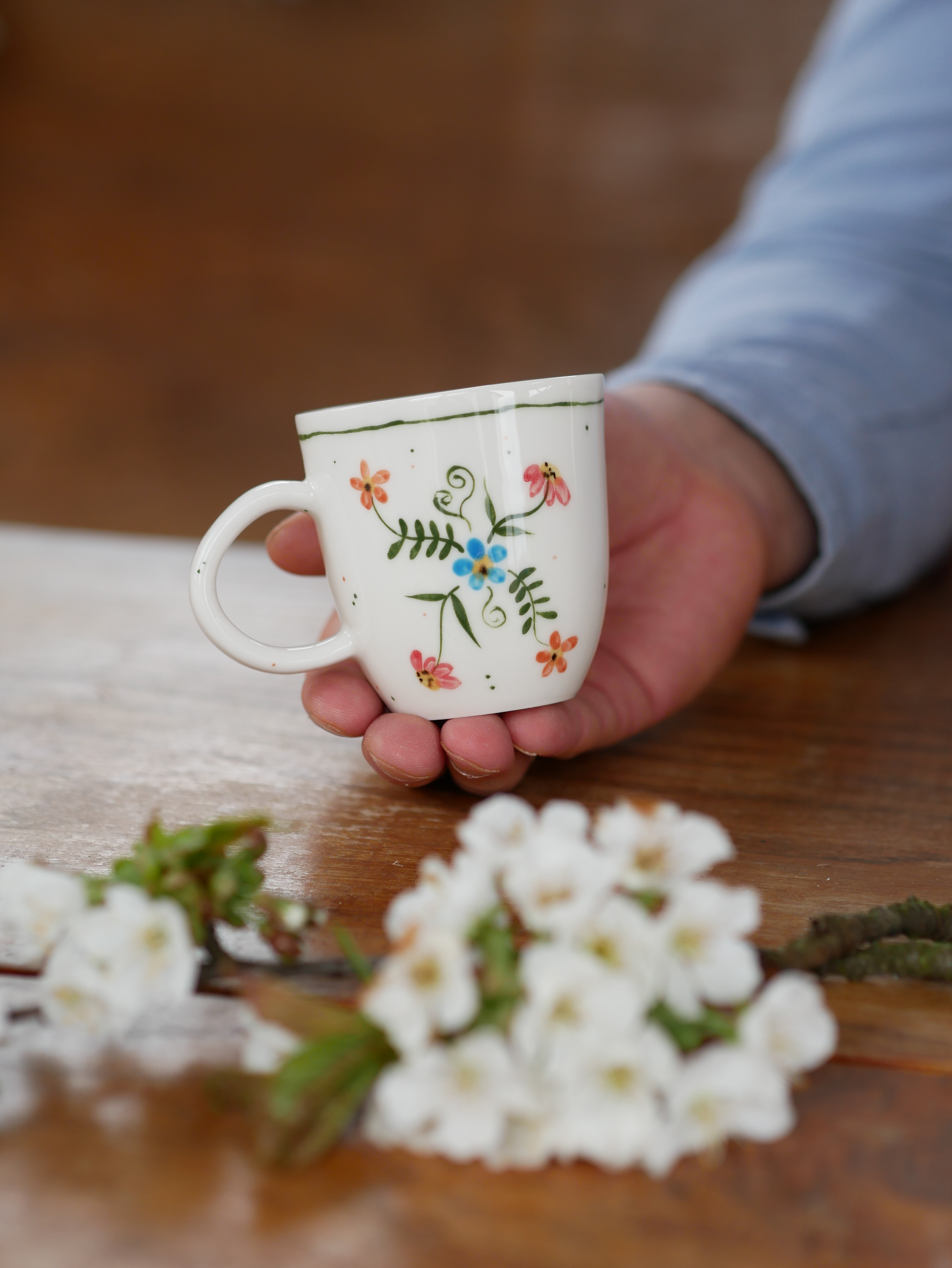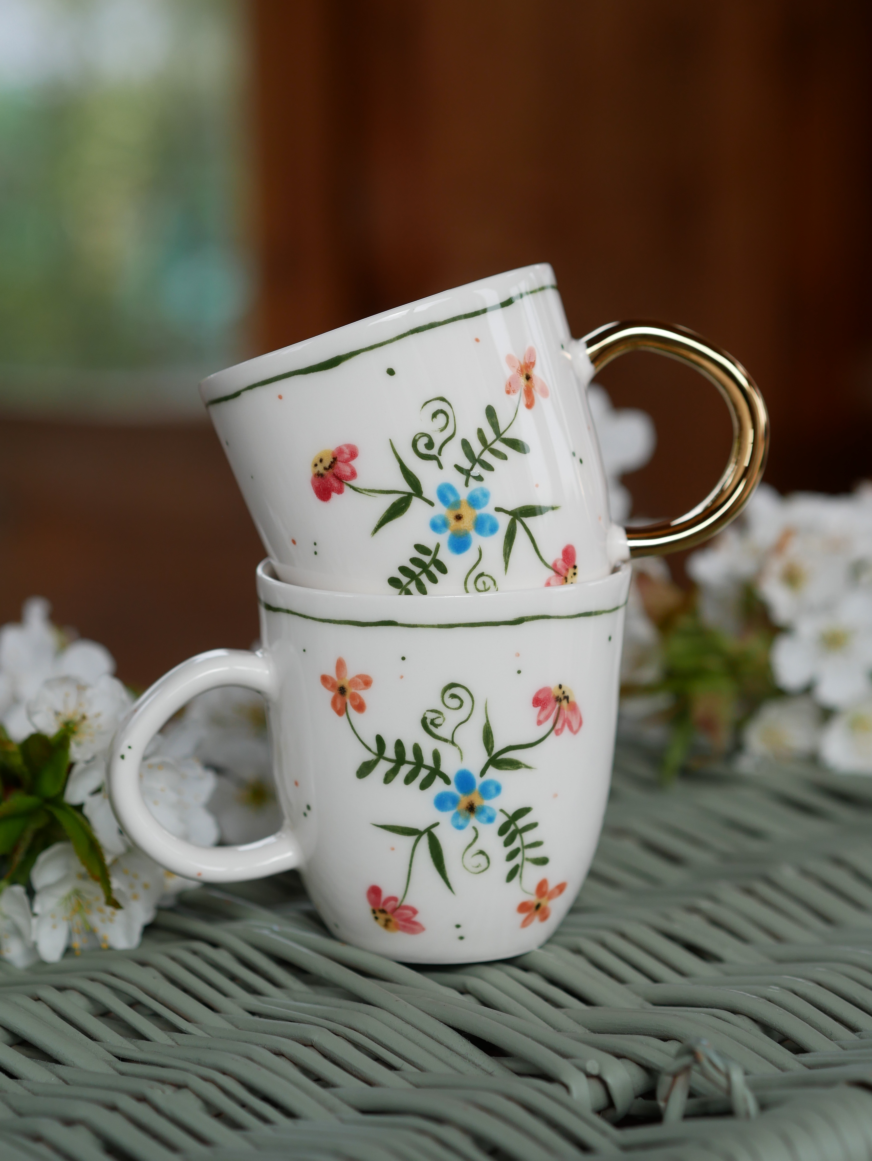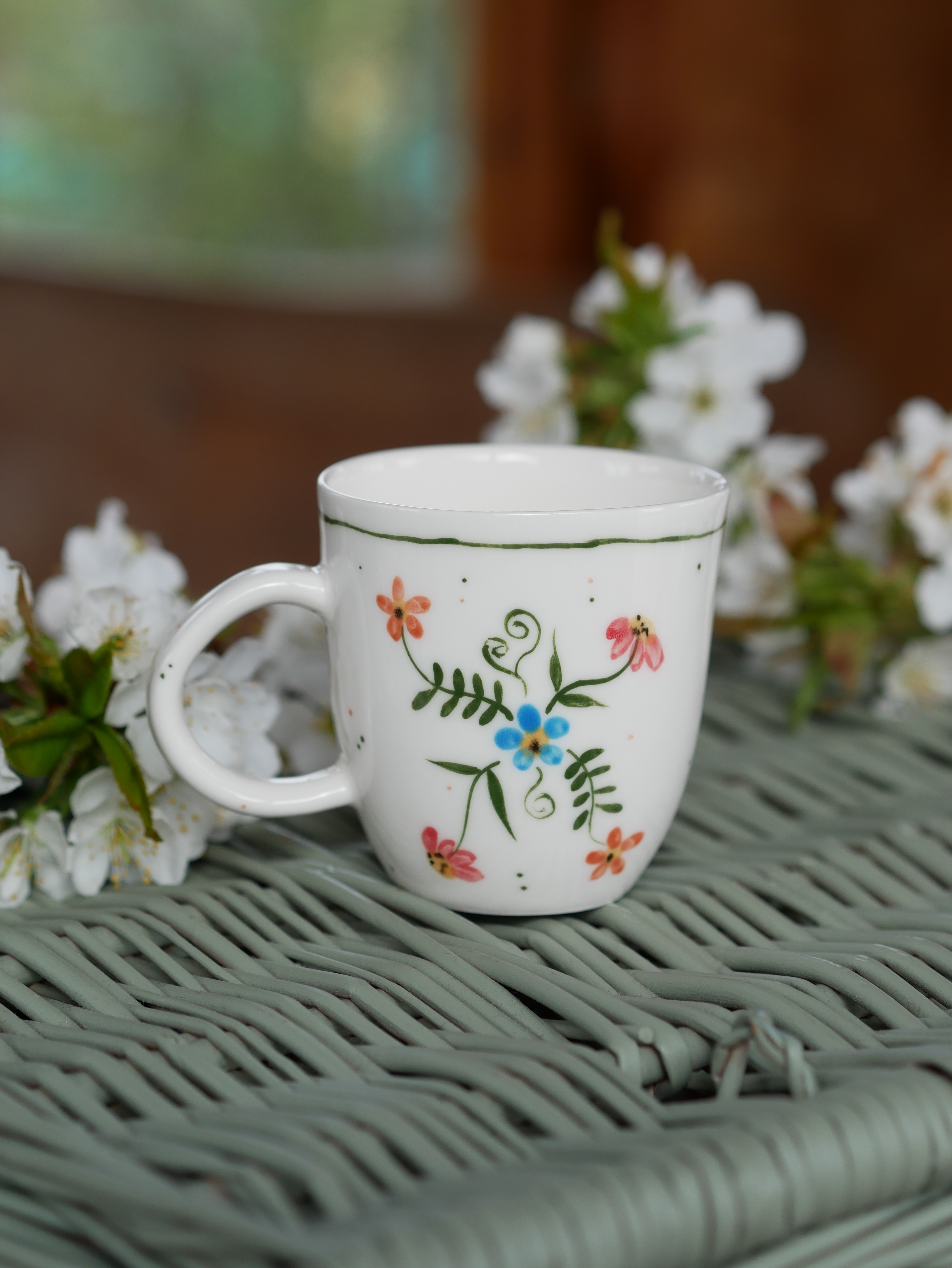Kwiaty maluję ręcznie, dlatego na każdym kubku wzór będzie wyglądać inaczej - zdjęcie poglądowe.
