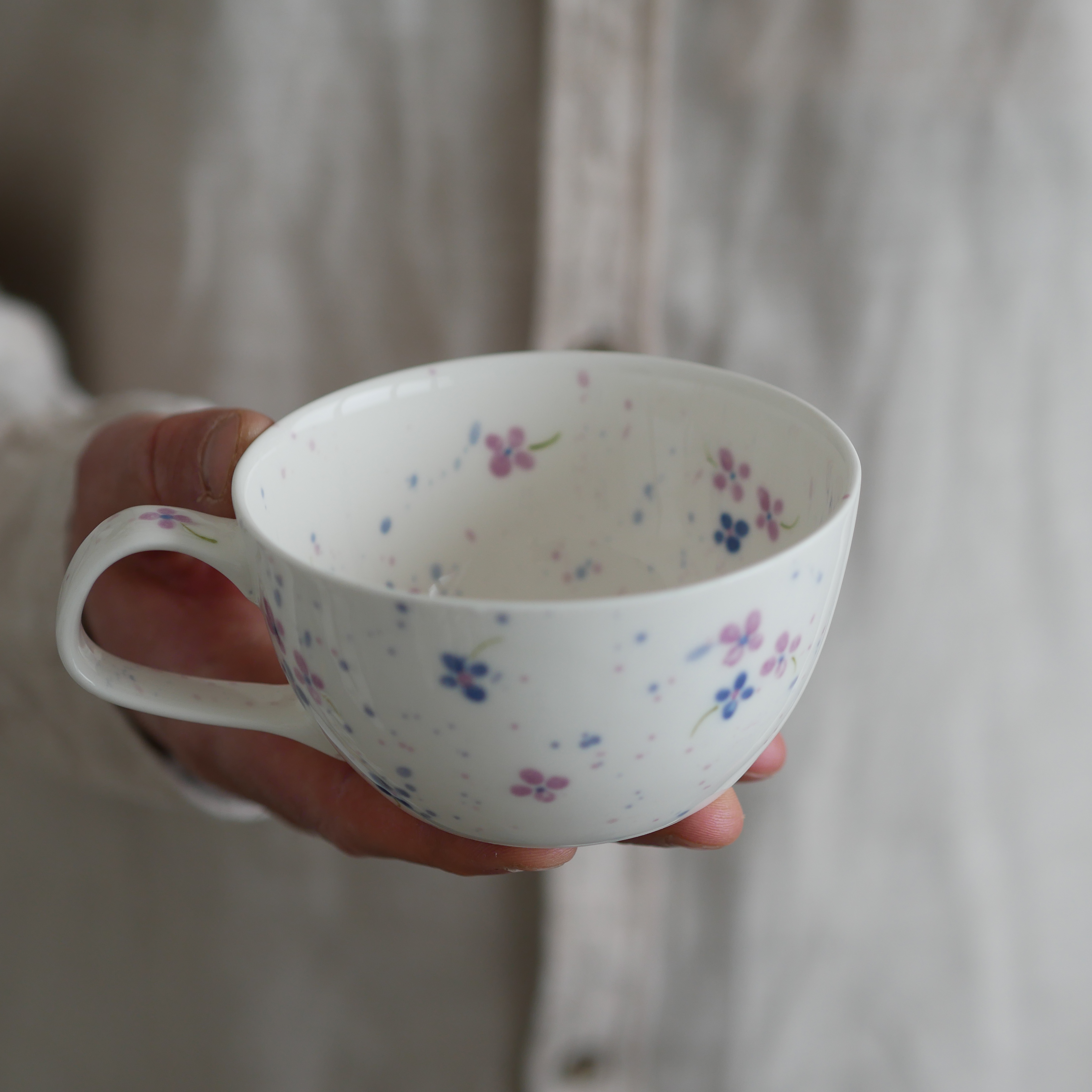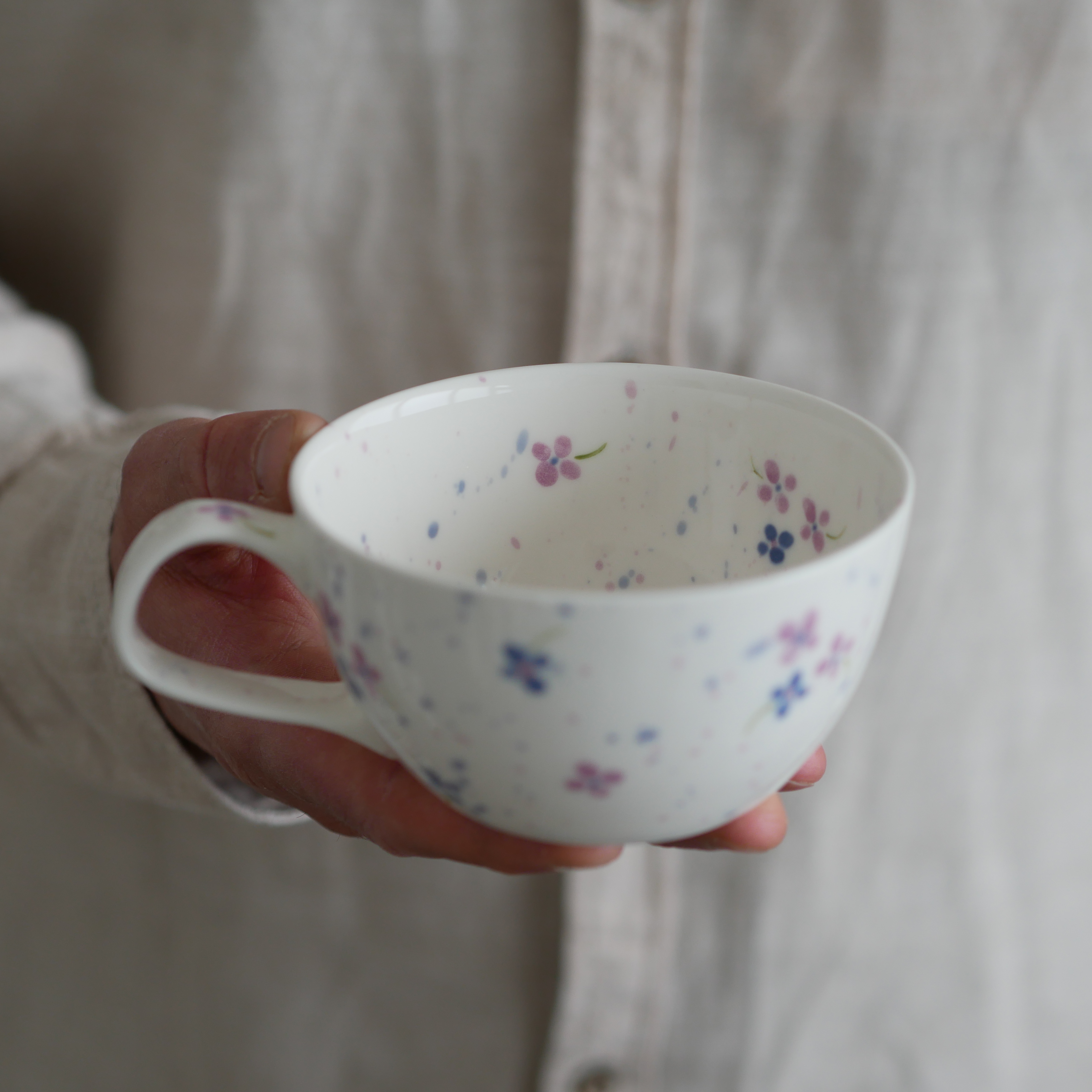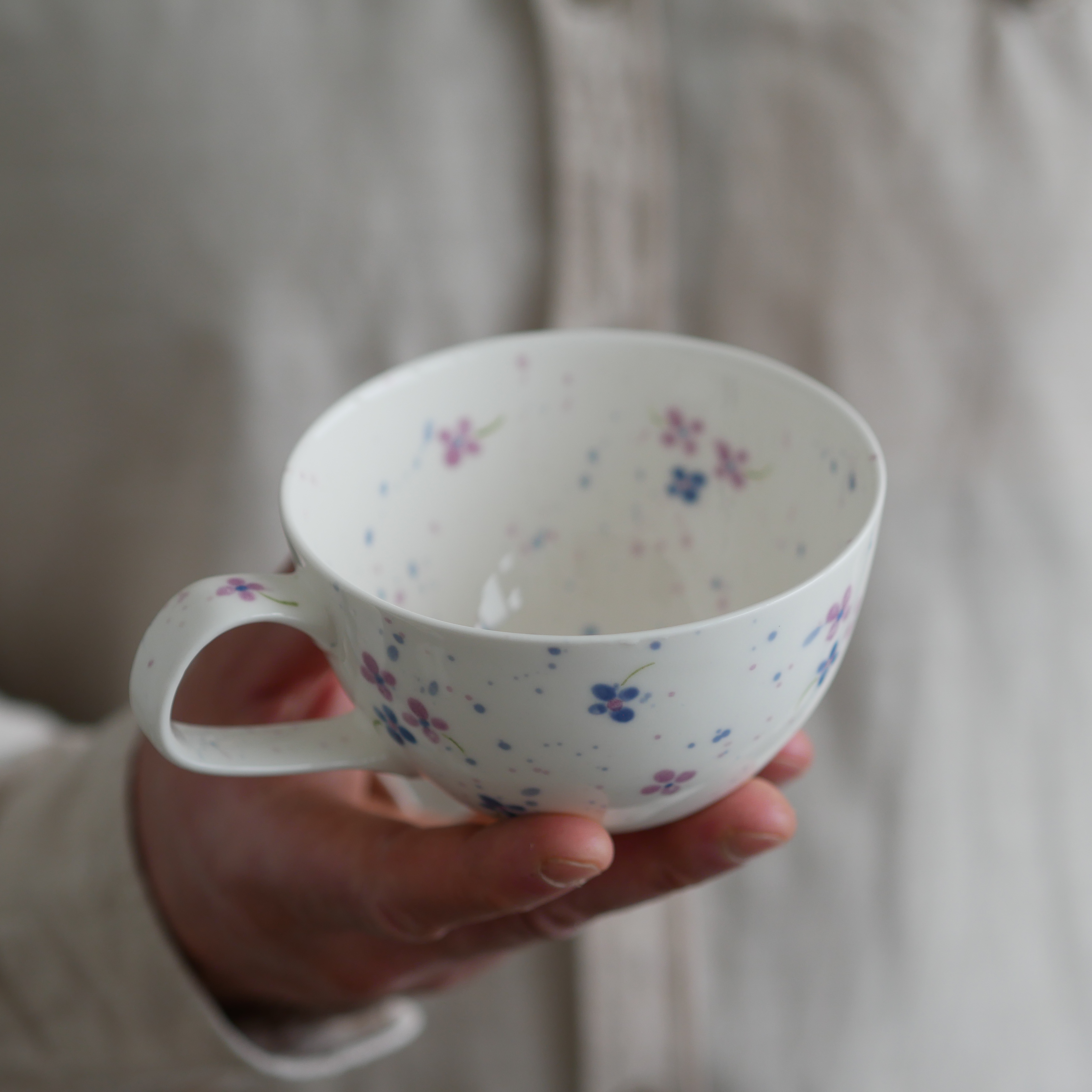Filiżanka w fioletowe kwiatuszki.
