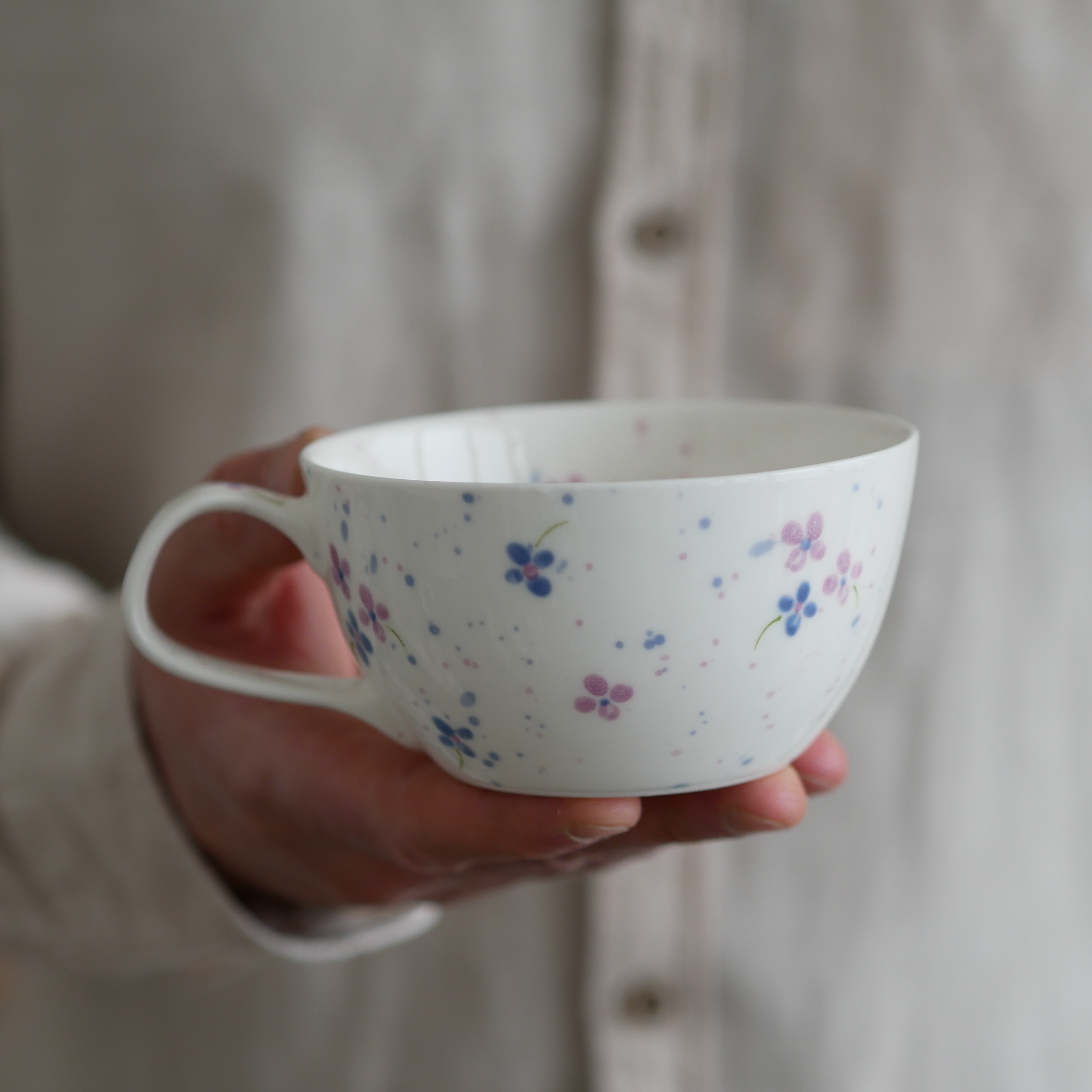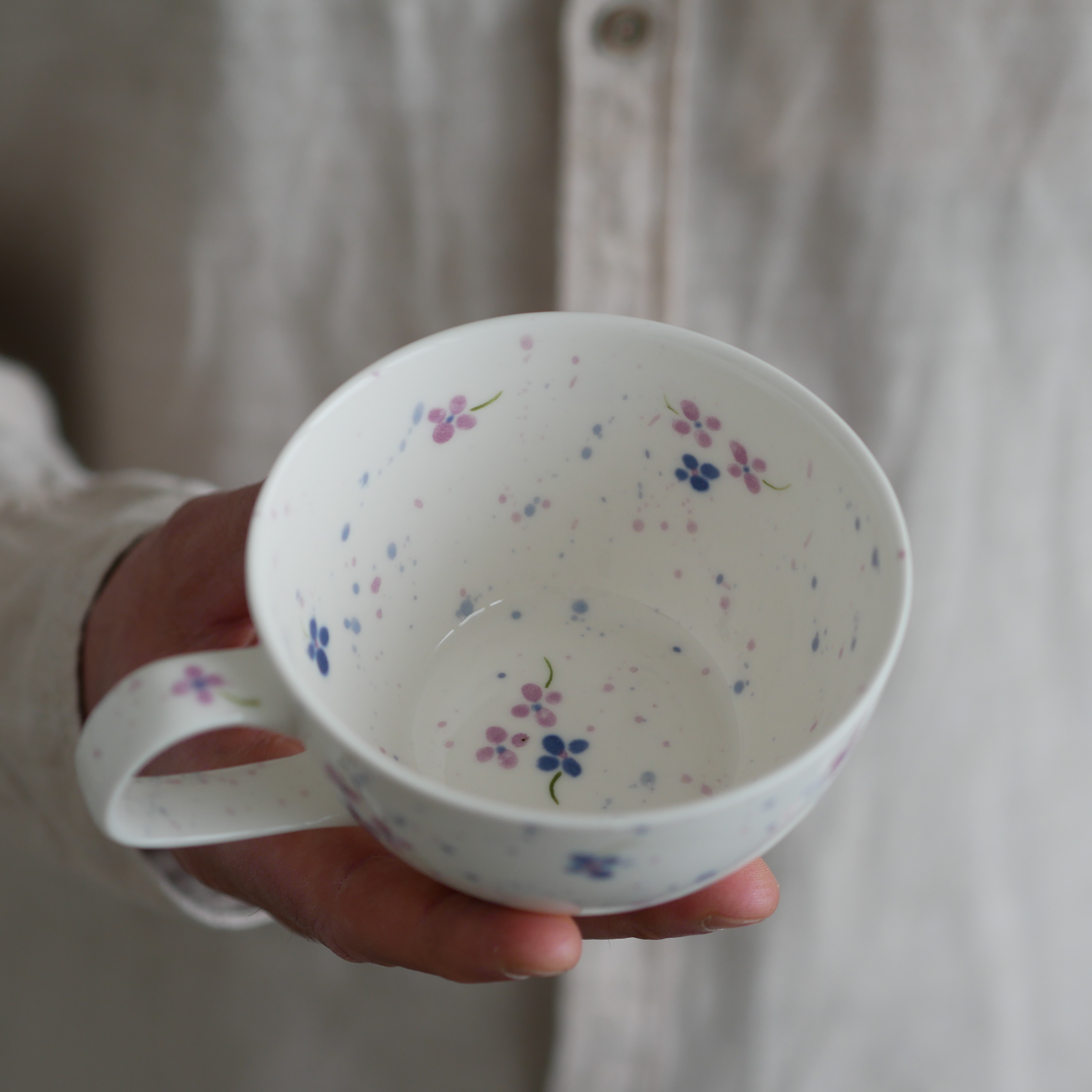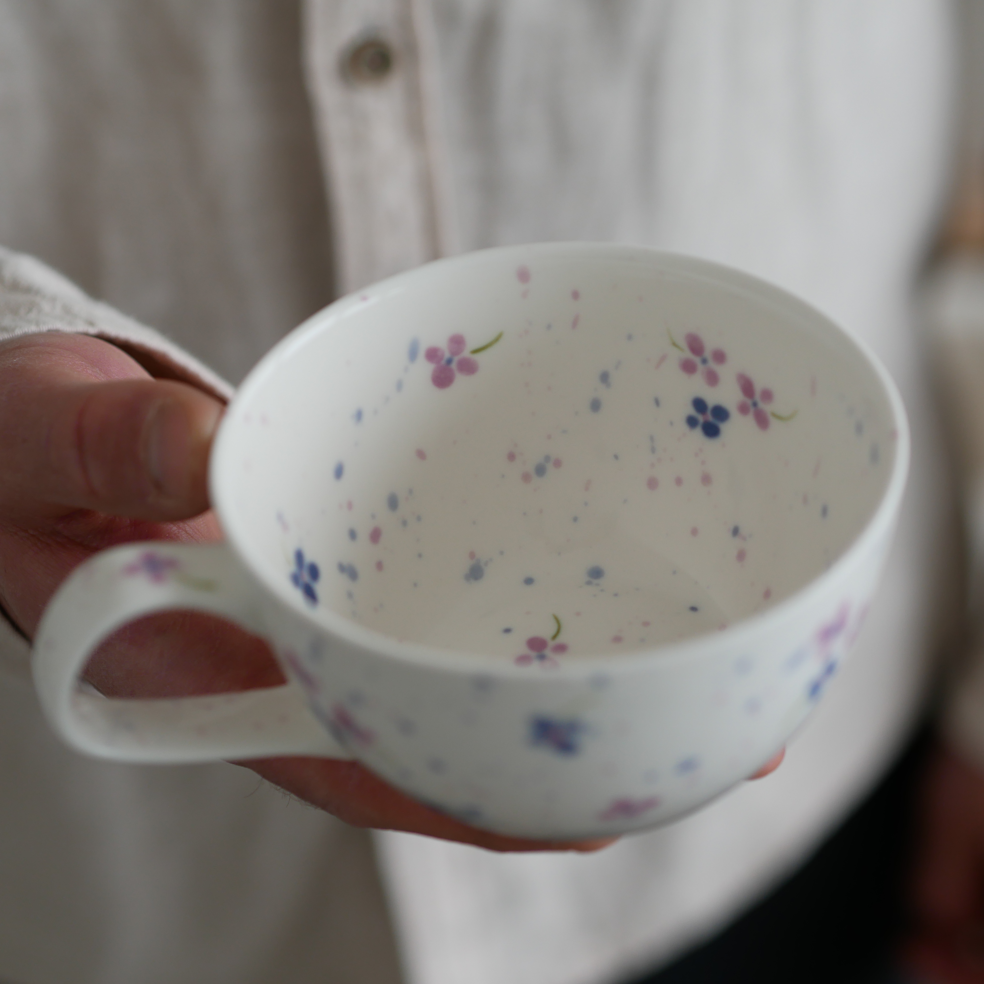 Filiżanka w fioletowe kwiatuszki.