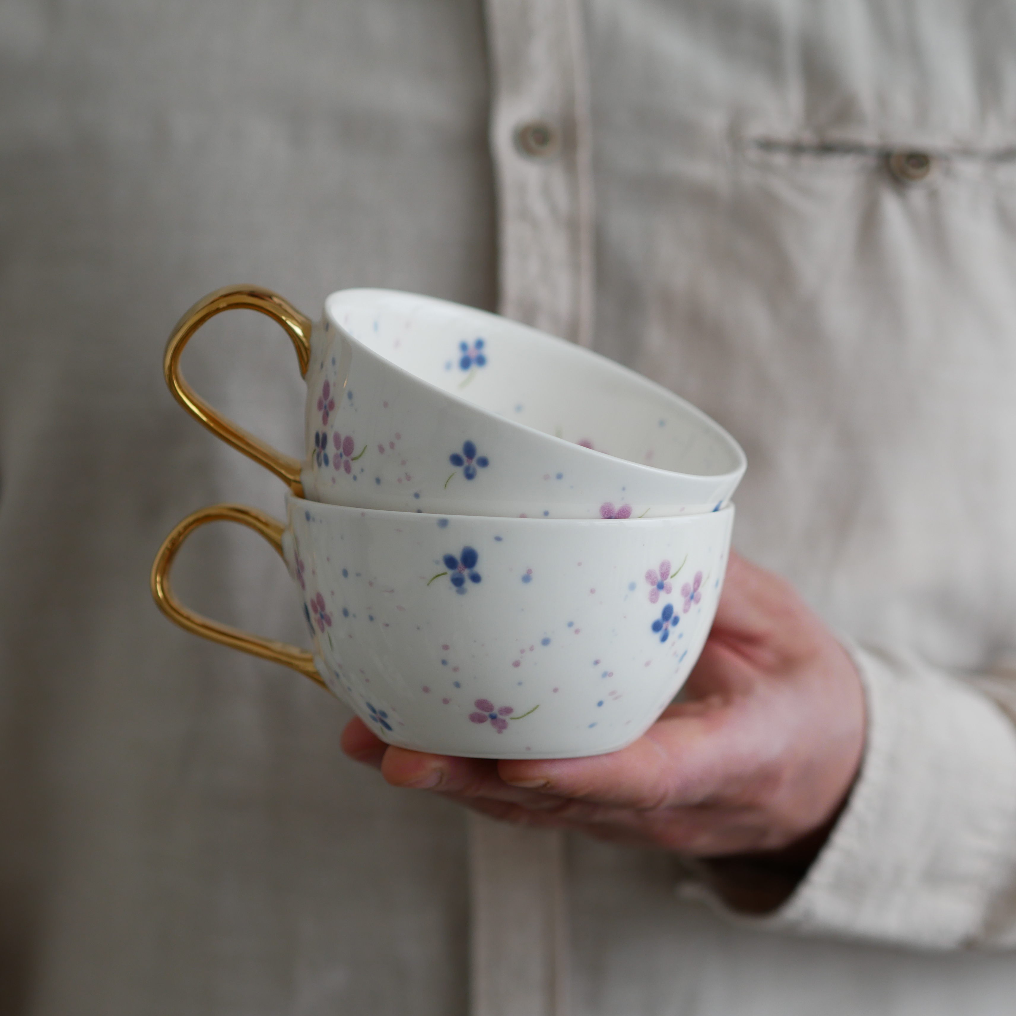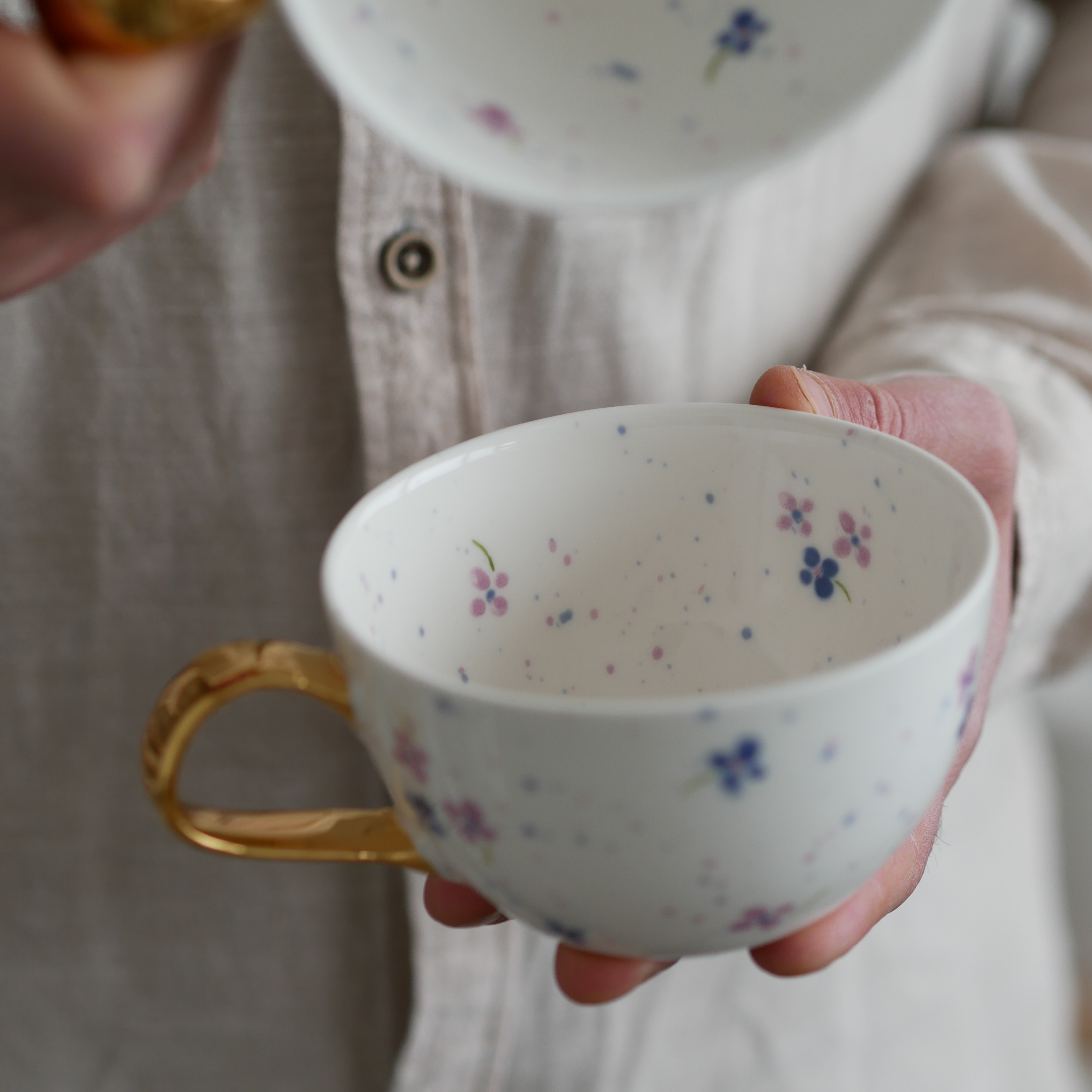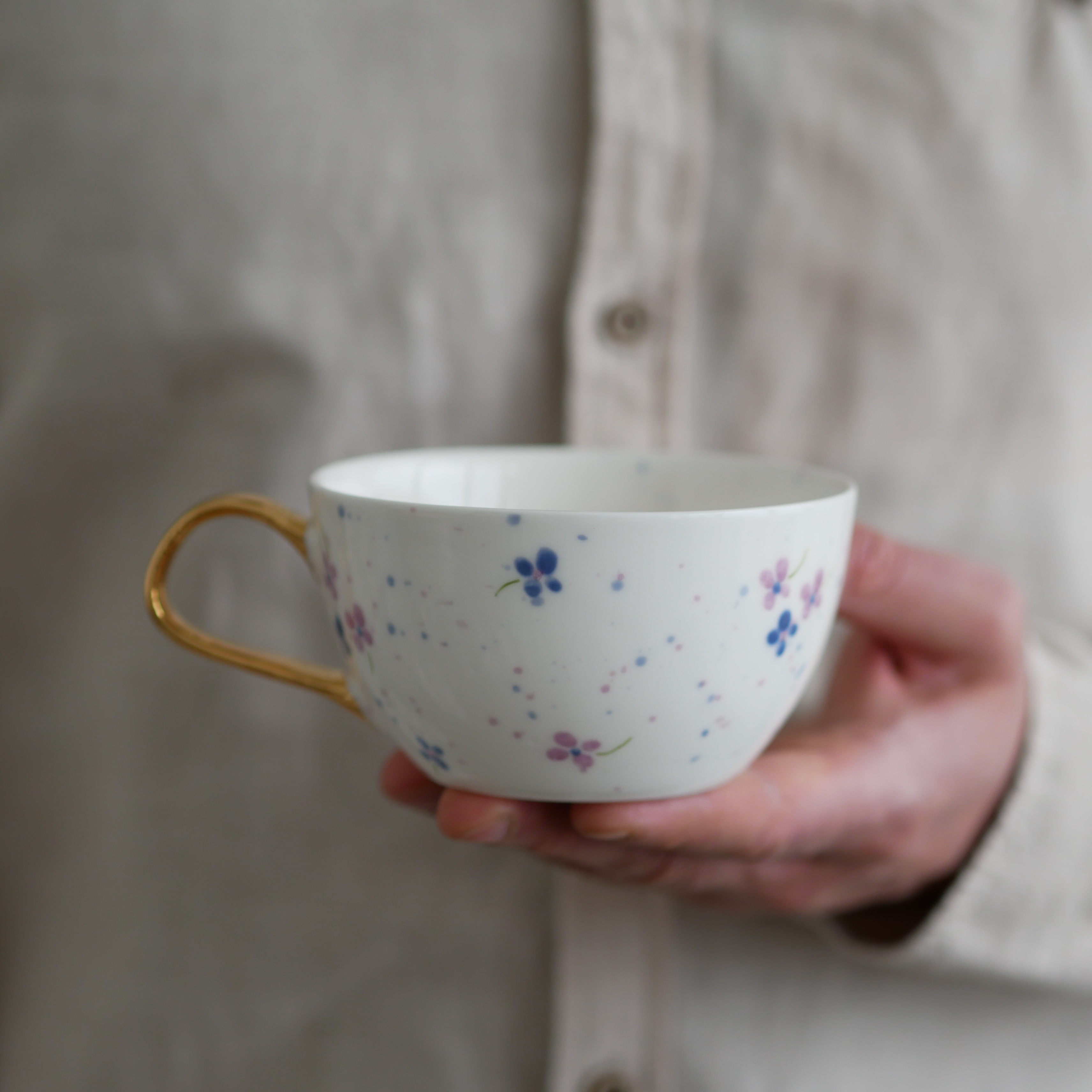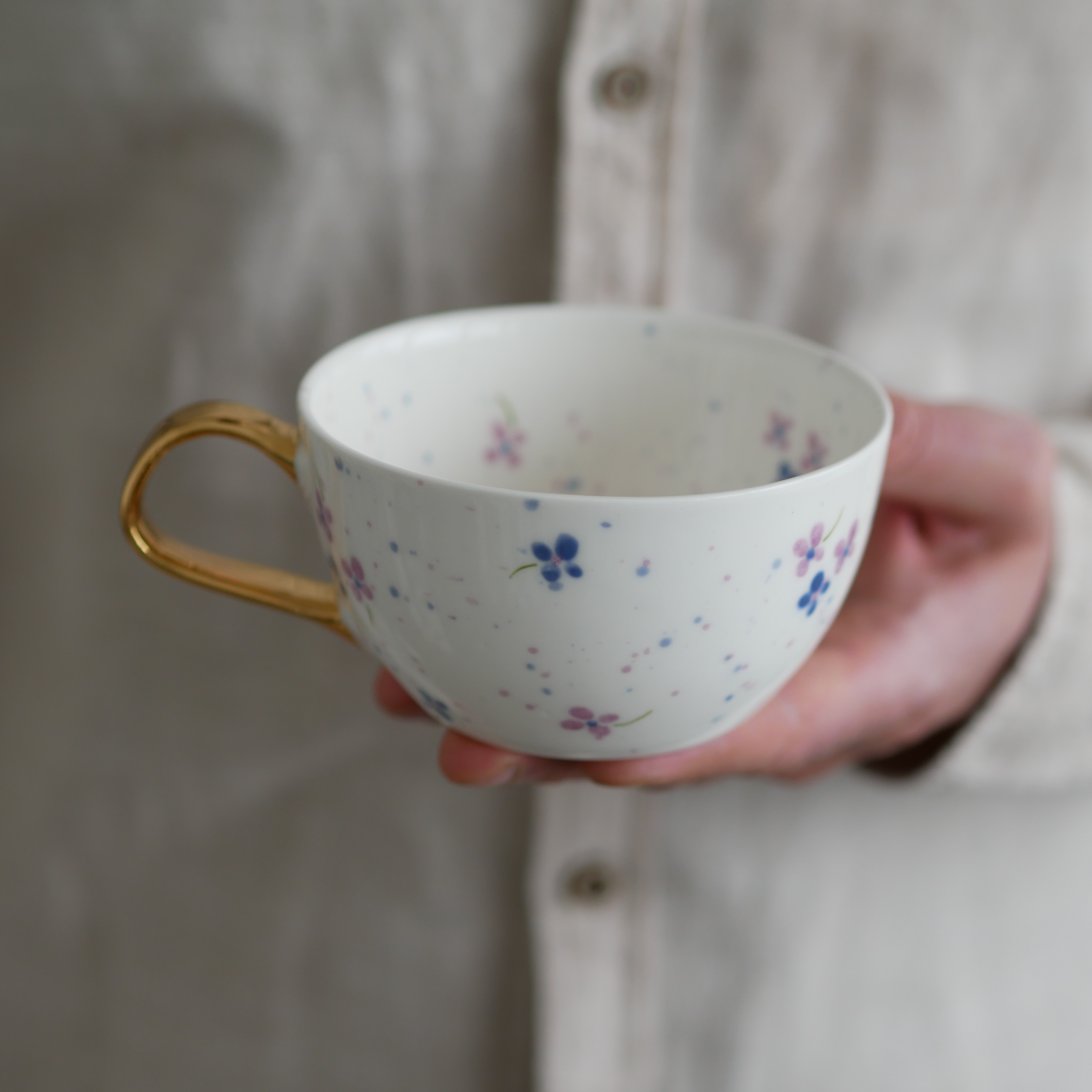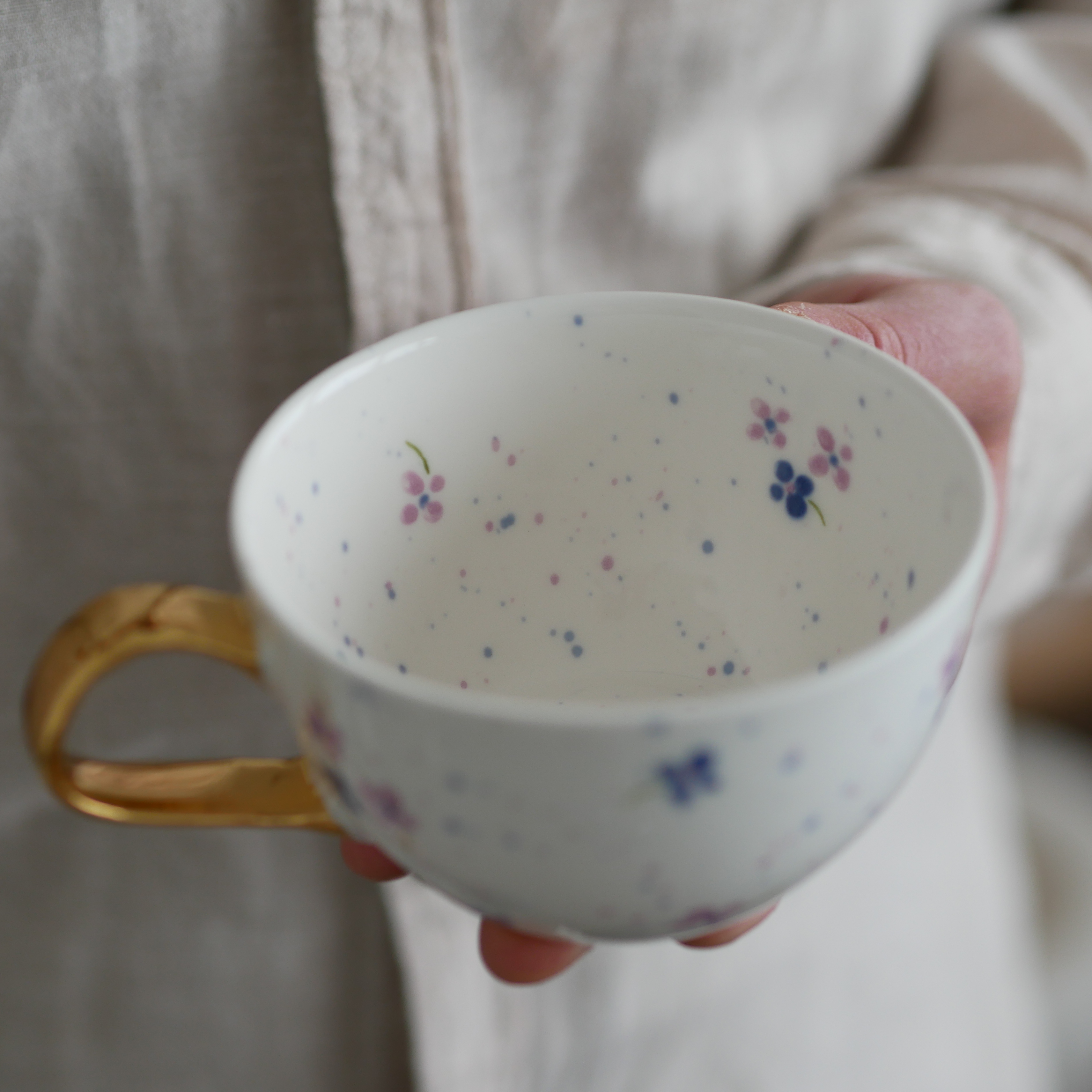 Filiżanka w fioletowe kwiatuszki ze złotym uszkiem.