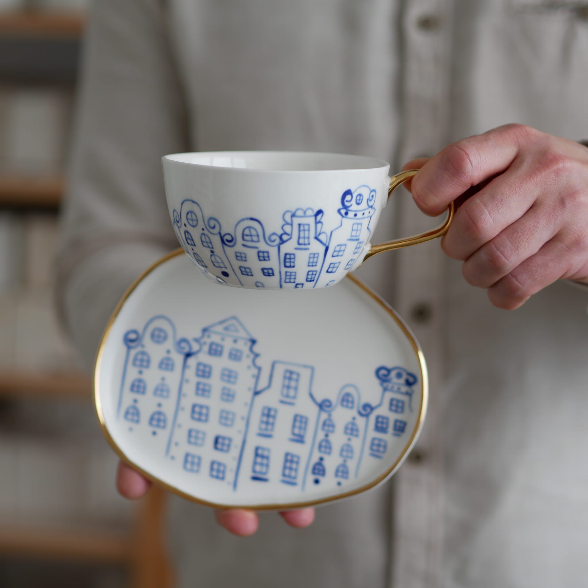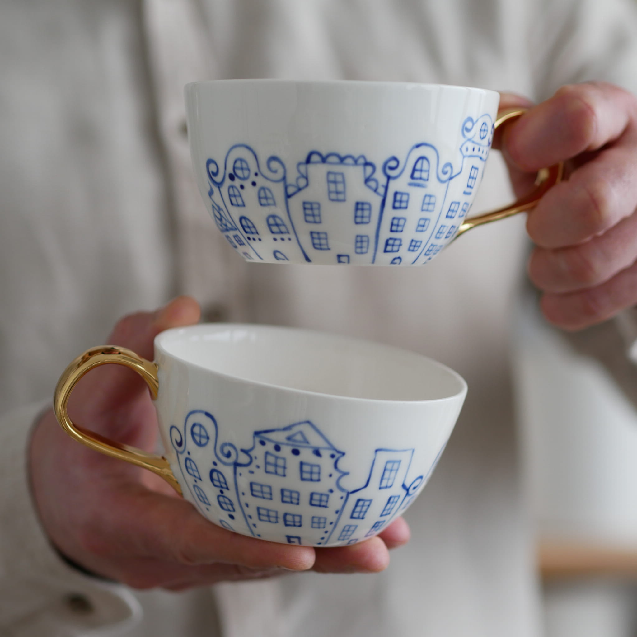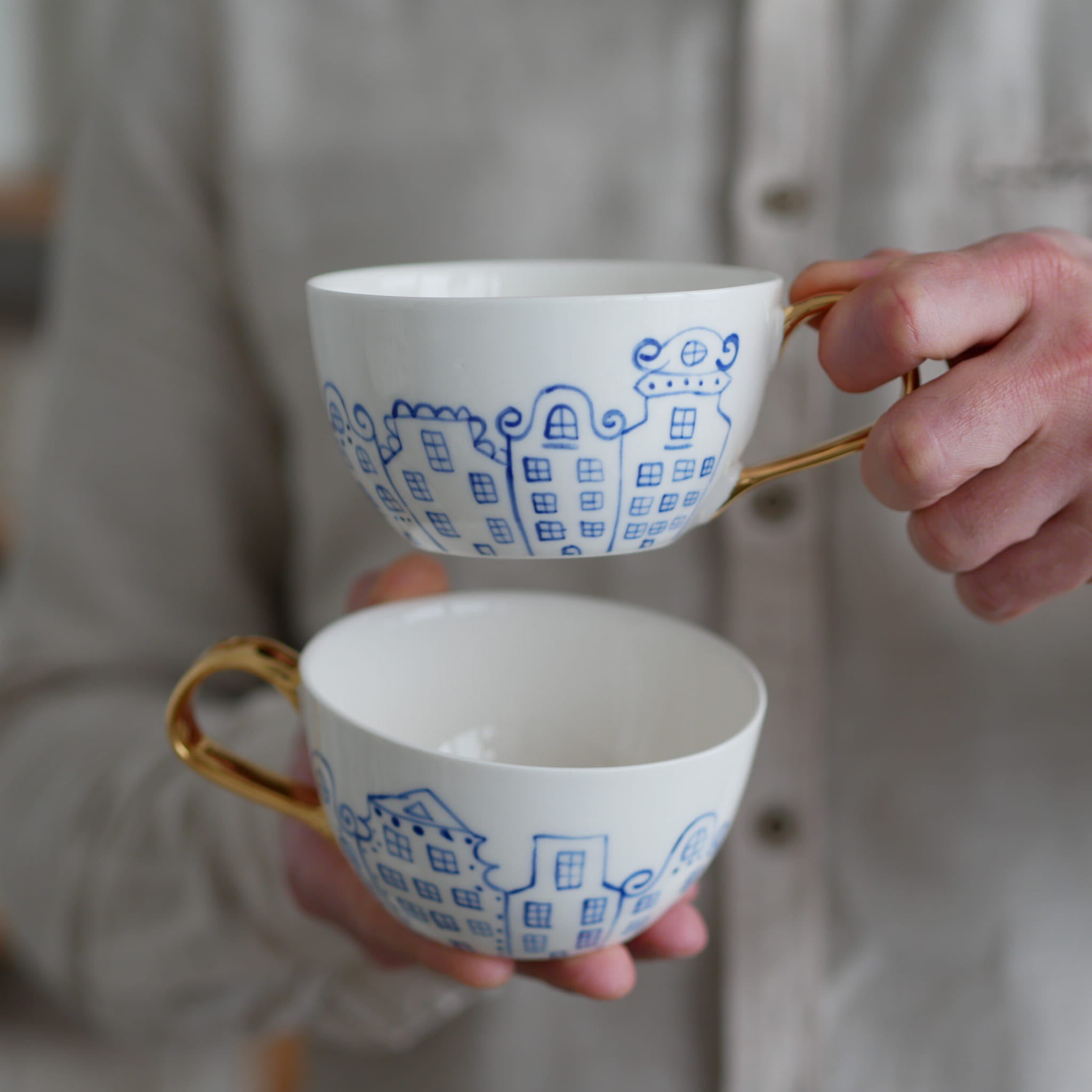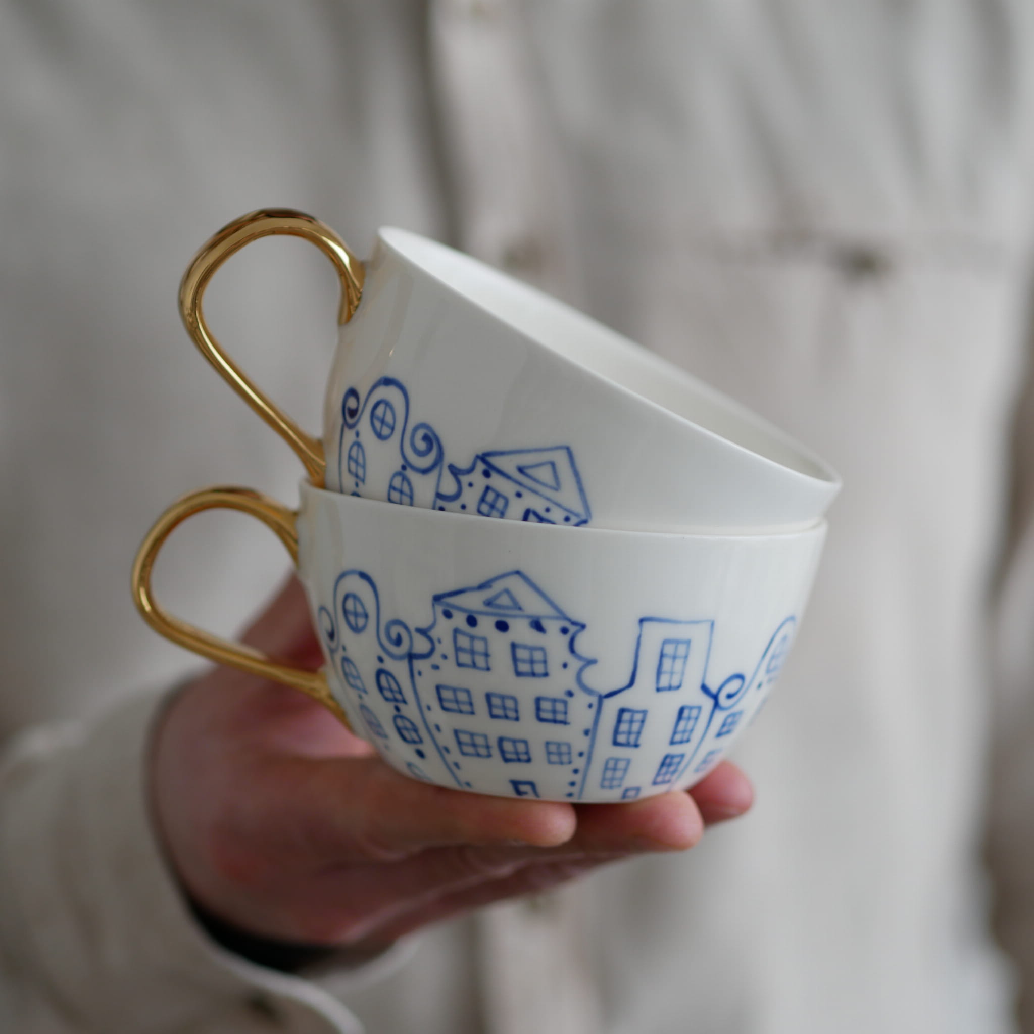Filiżanka w kobaltowe kamienice ze złotym uszkiem - cena dotyczy jednej sztuki.