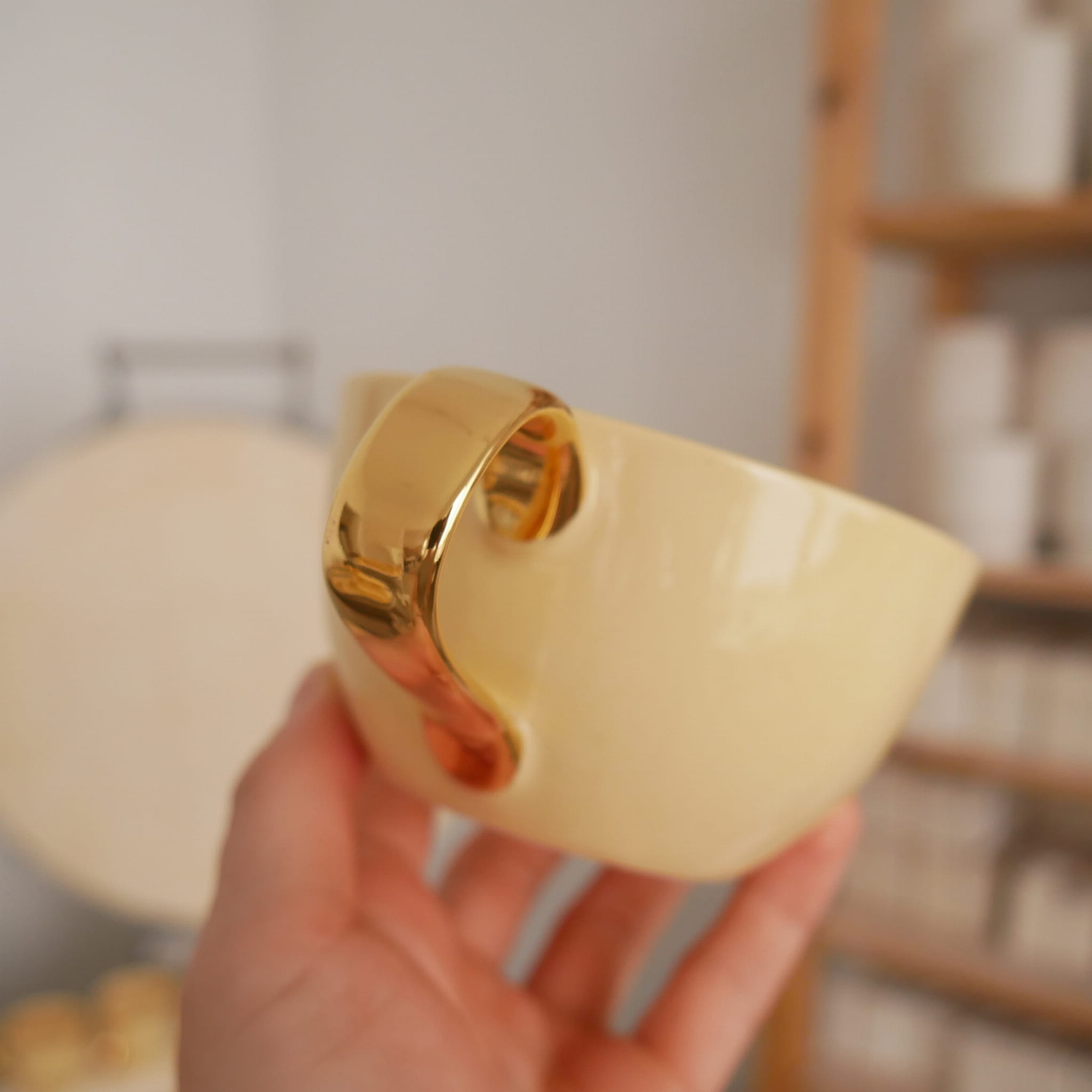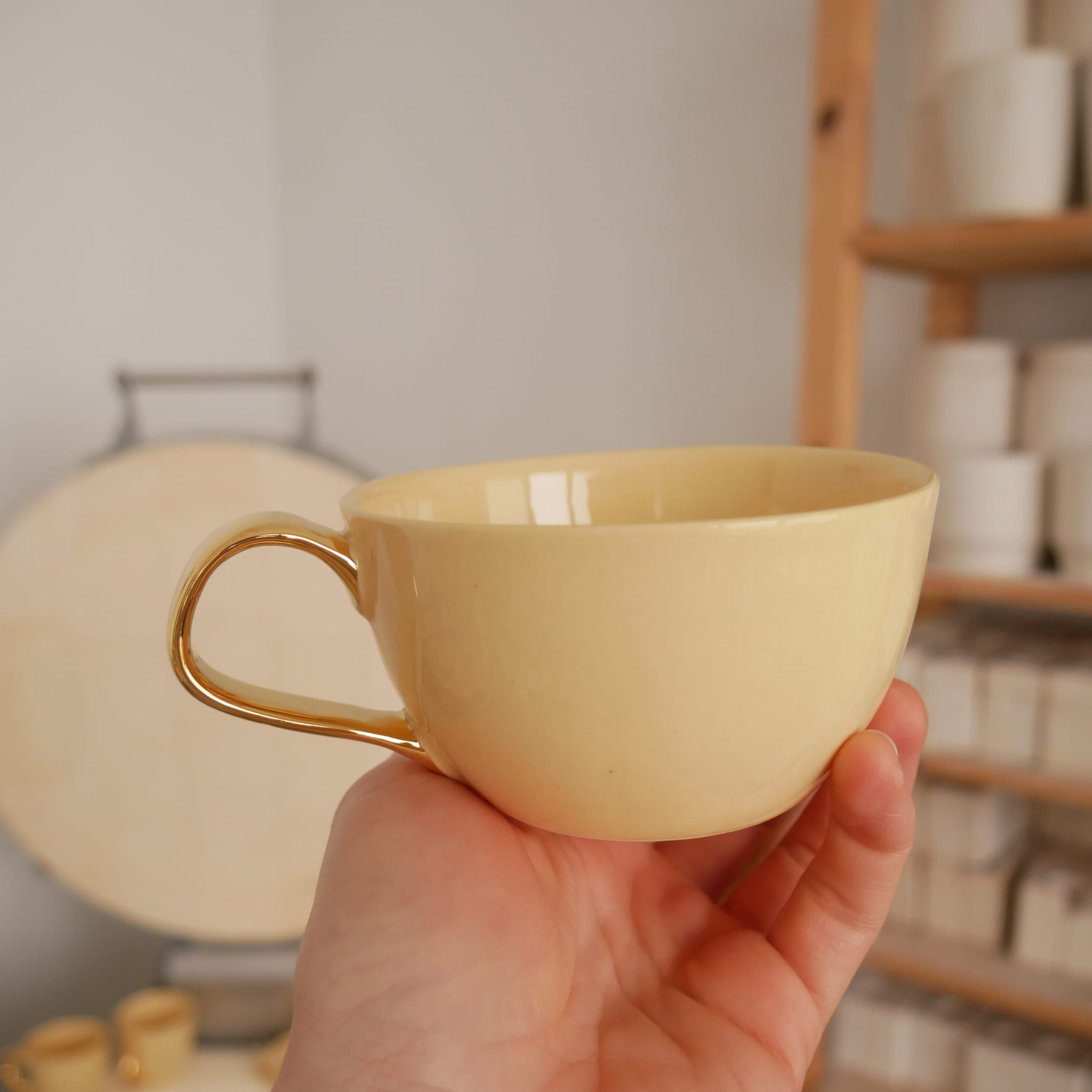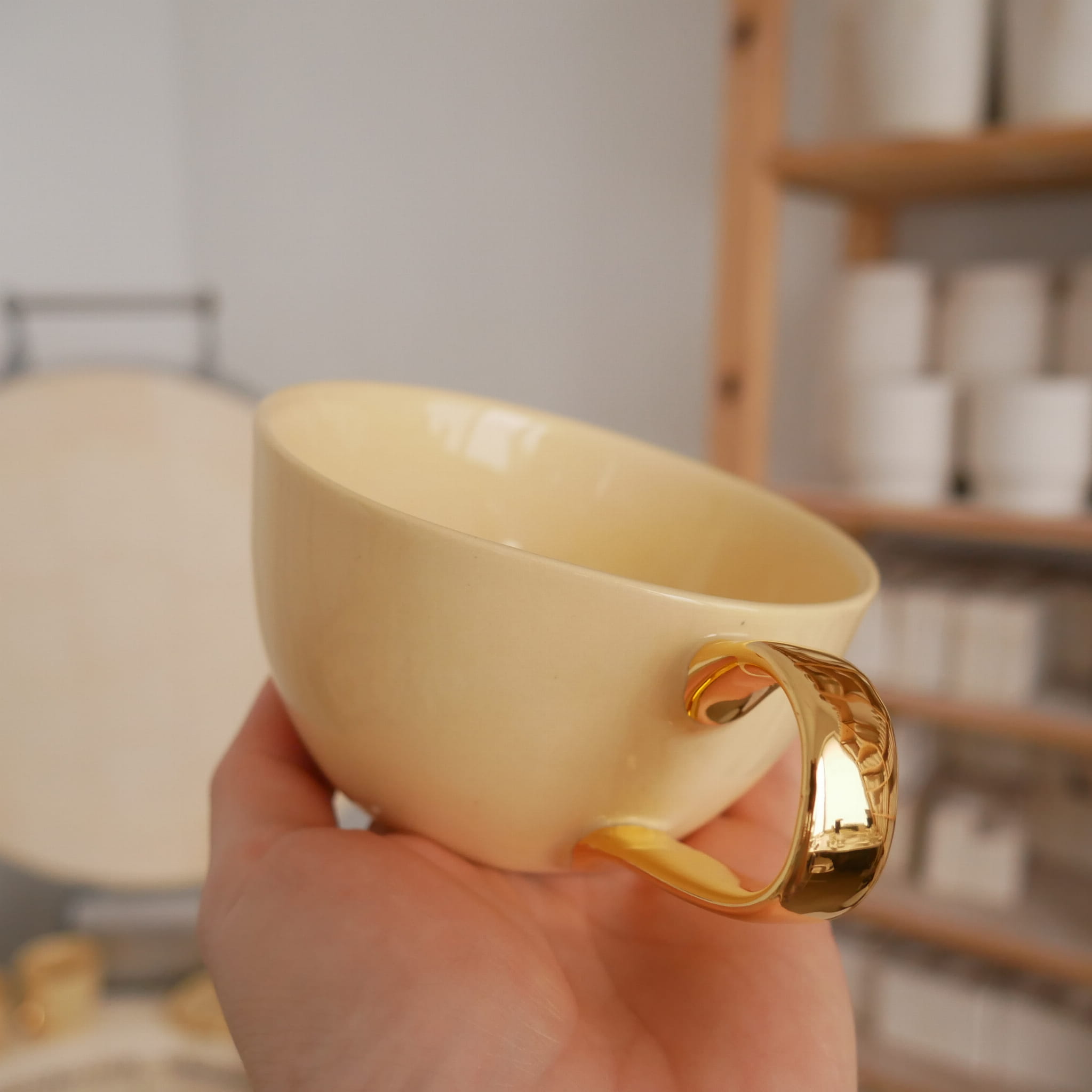 Filiżanka ze złotym uszkiem w klasycznym kształcie.