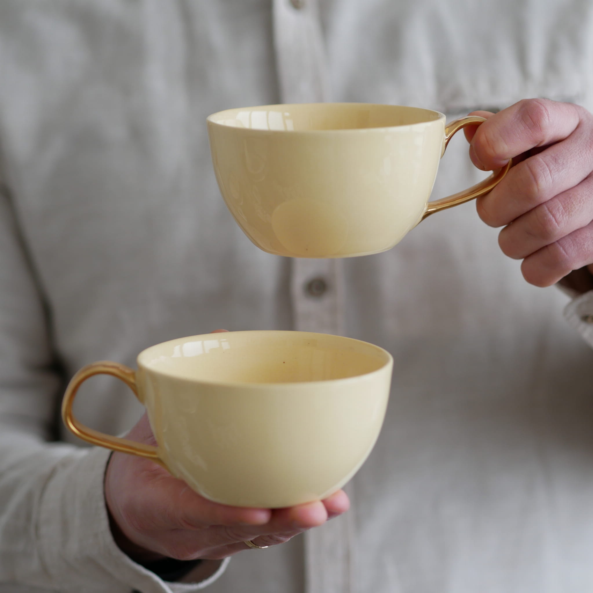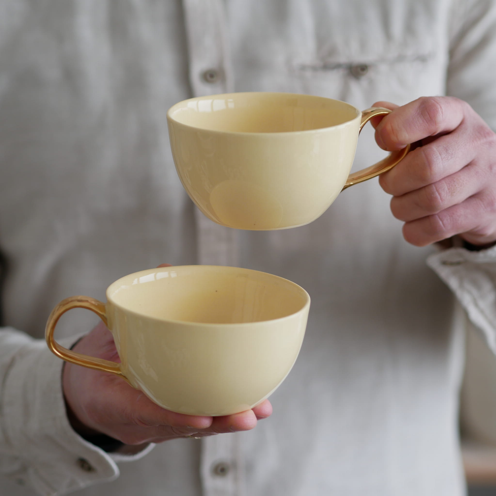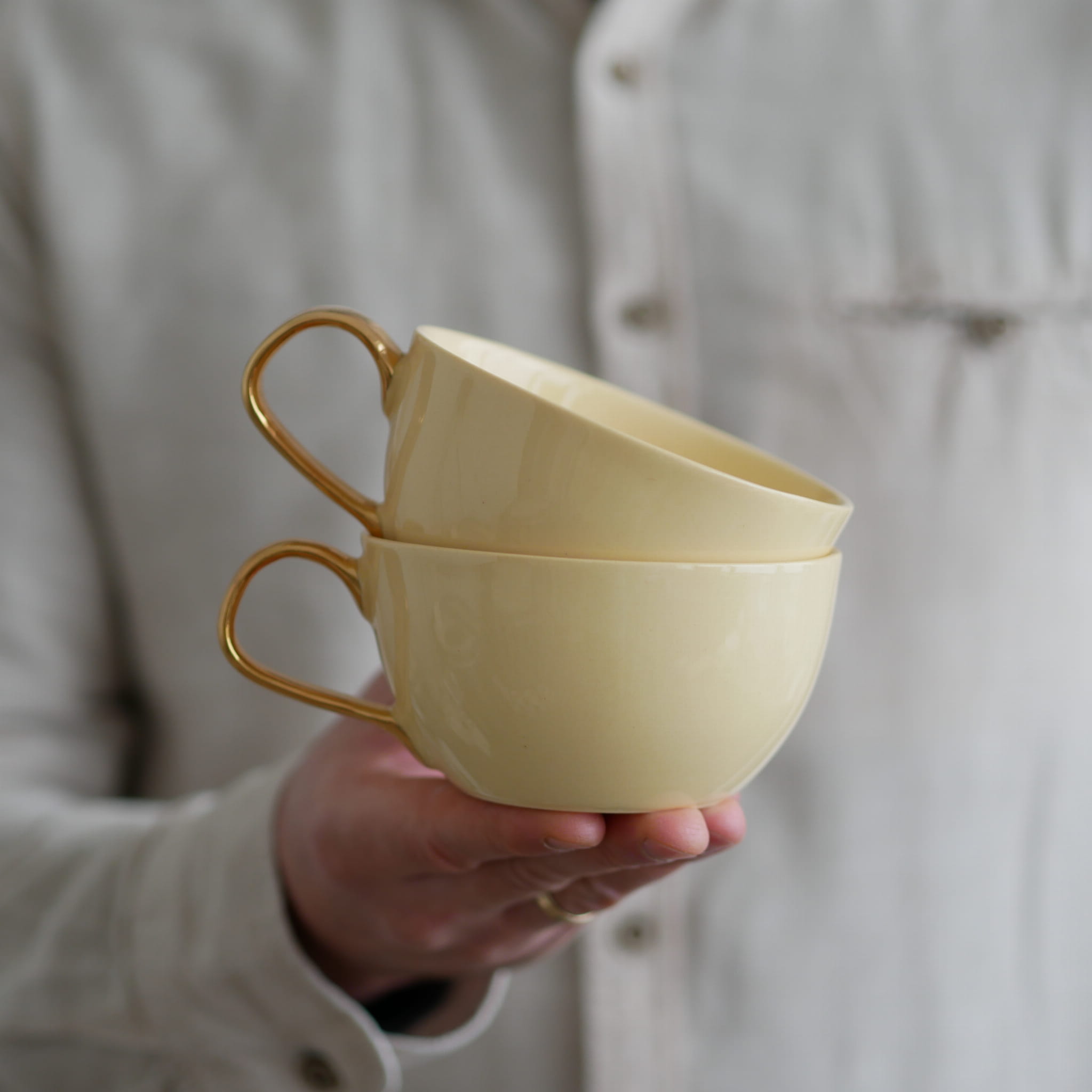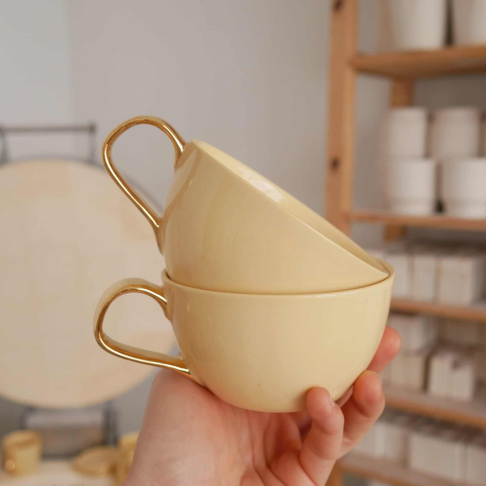 Filiżanka ze złotym uszkiem w klasycznym kształcie.