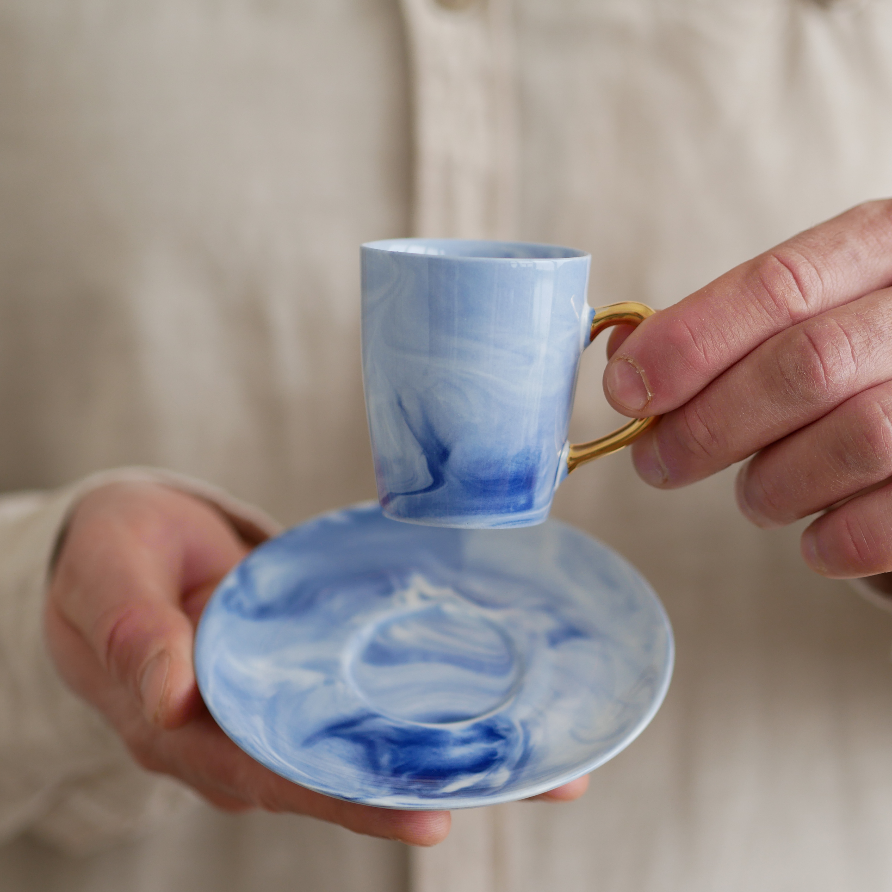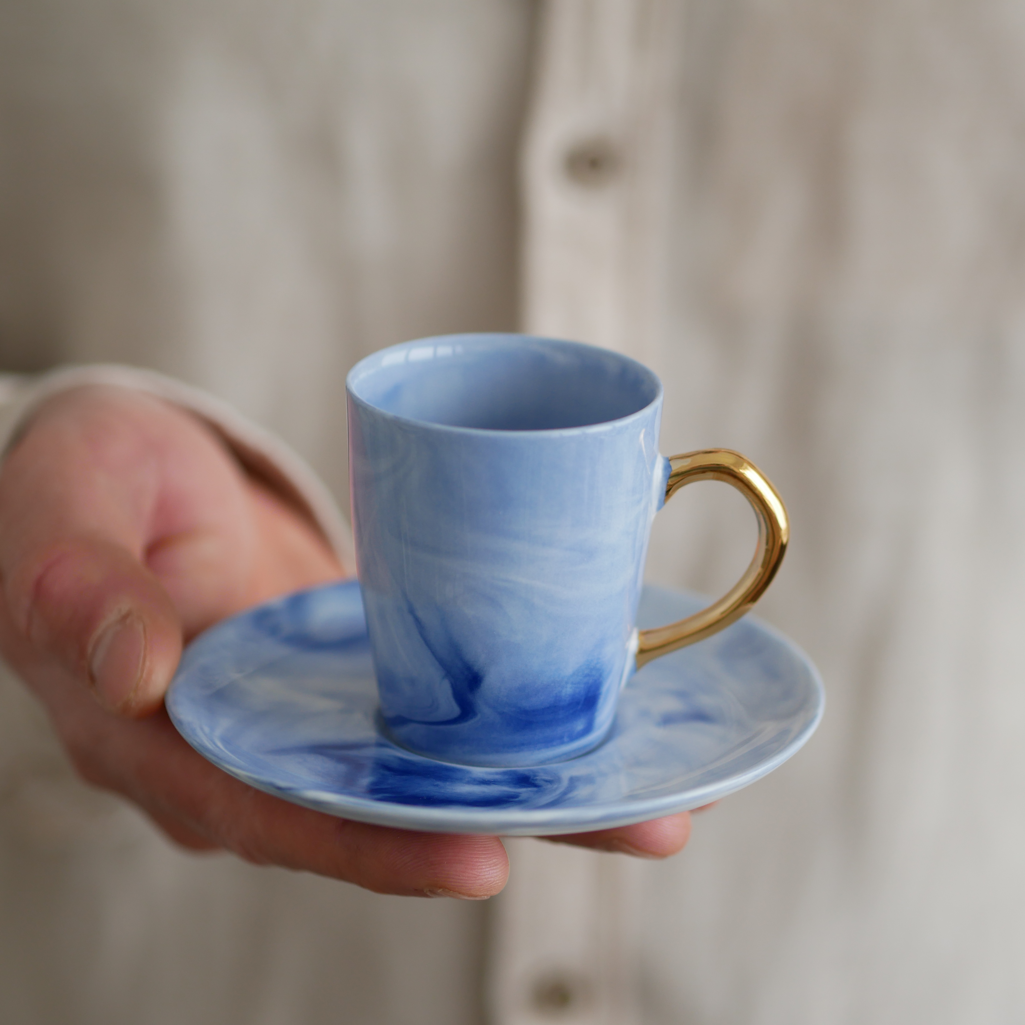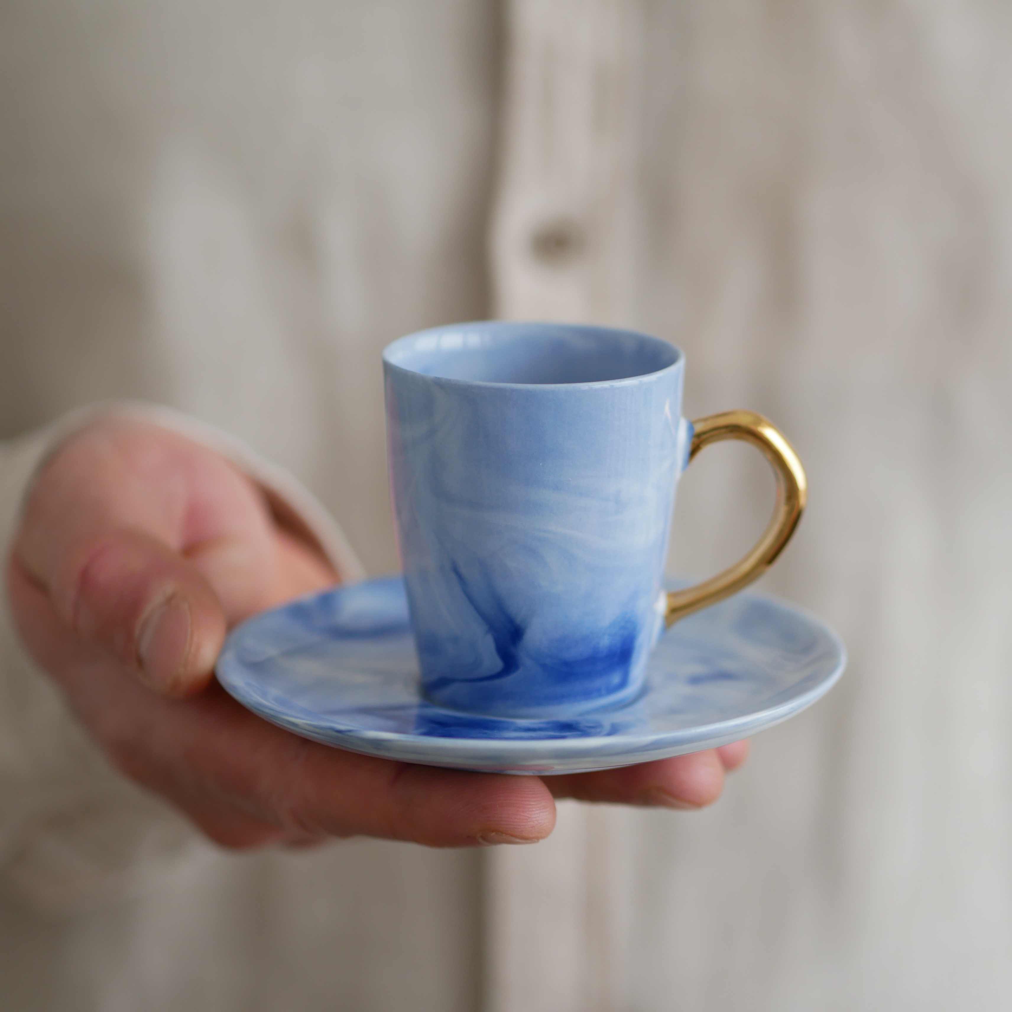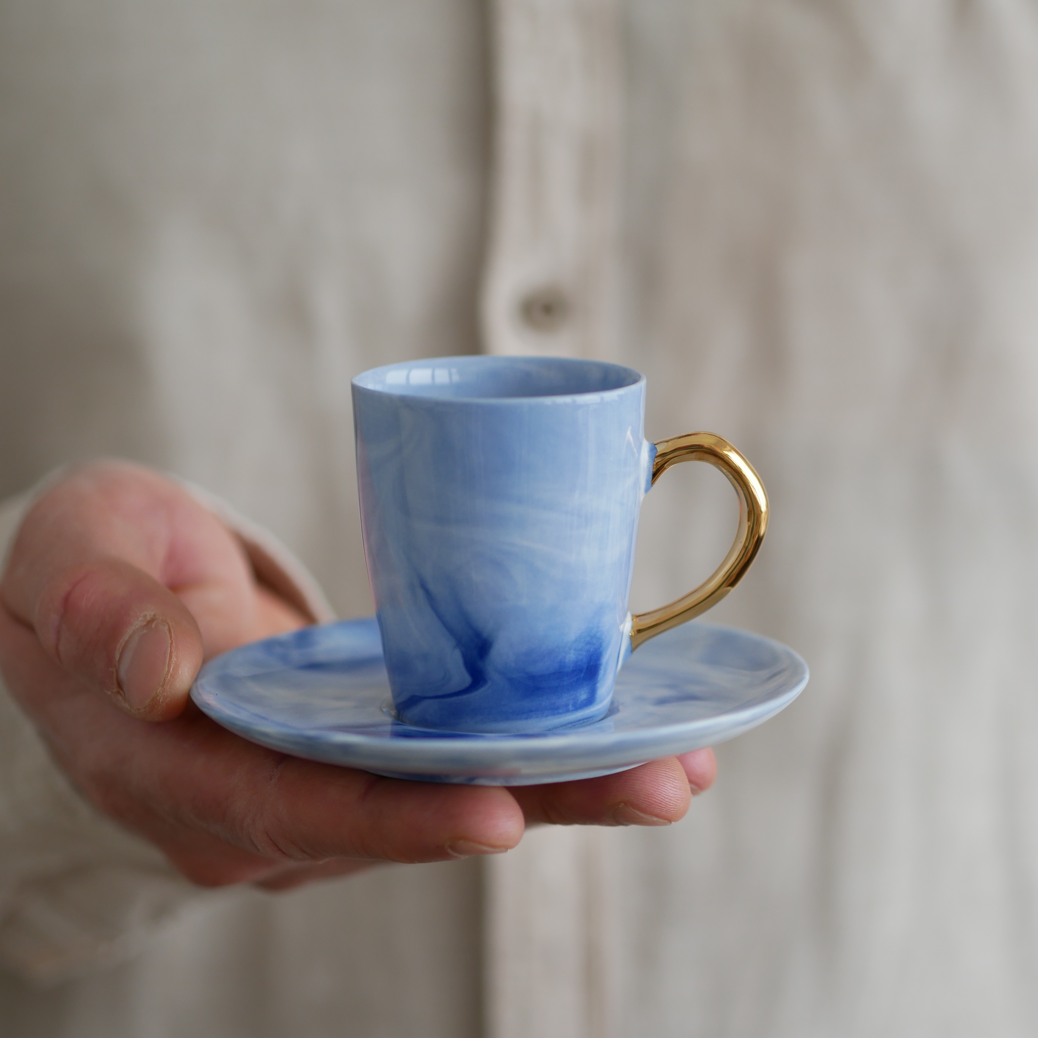 Filiżanka 70ml INK kobaltowy ze złotym uszkiem + talerzyk 11cm
