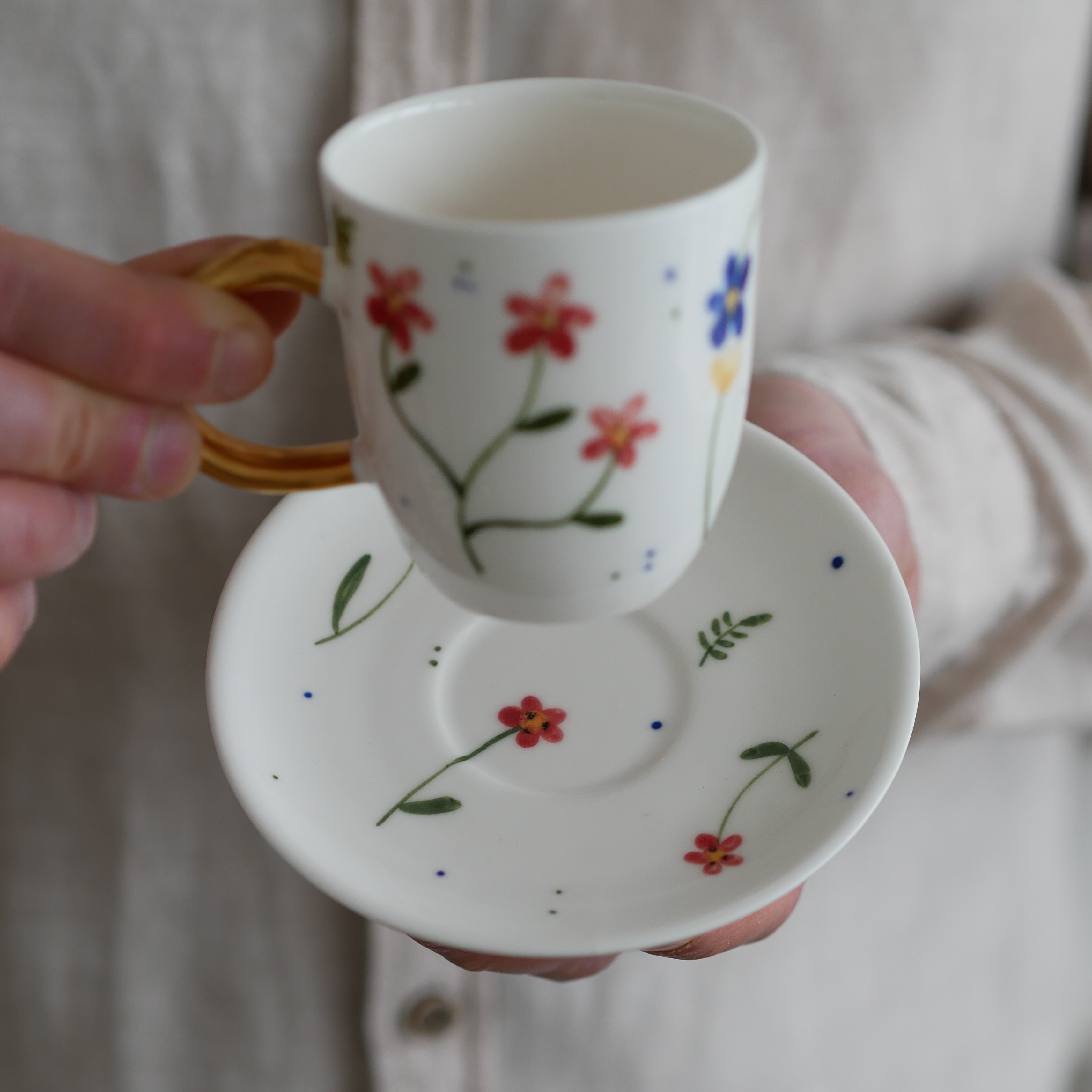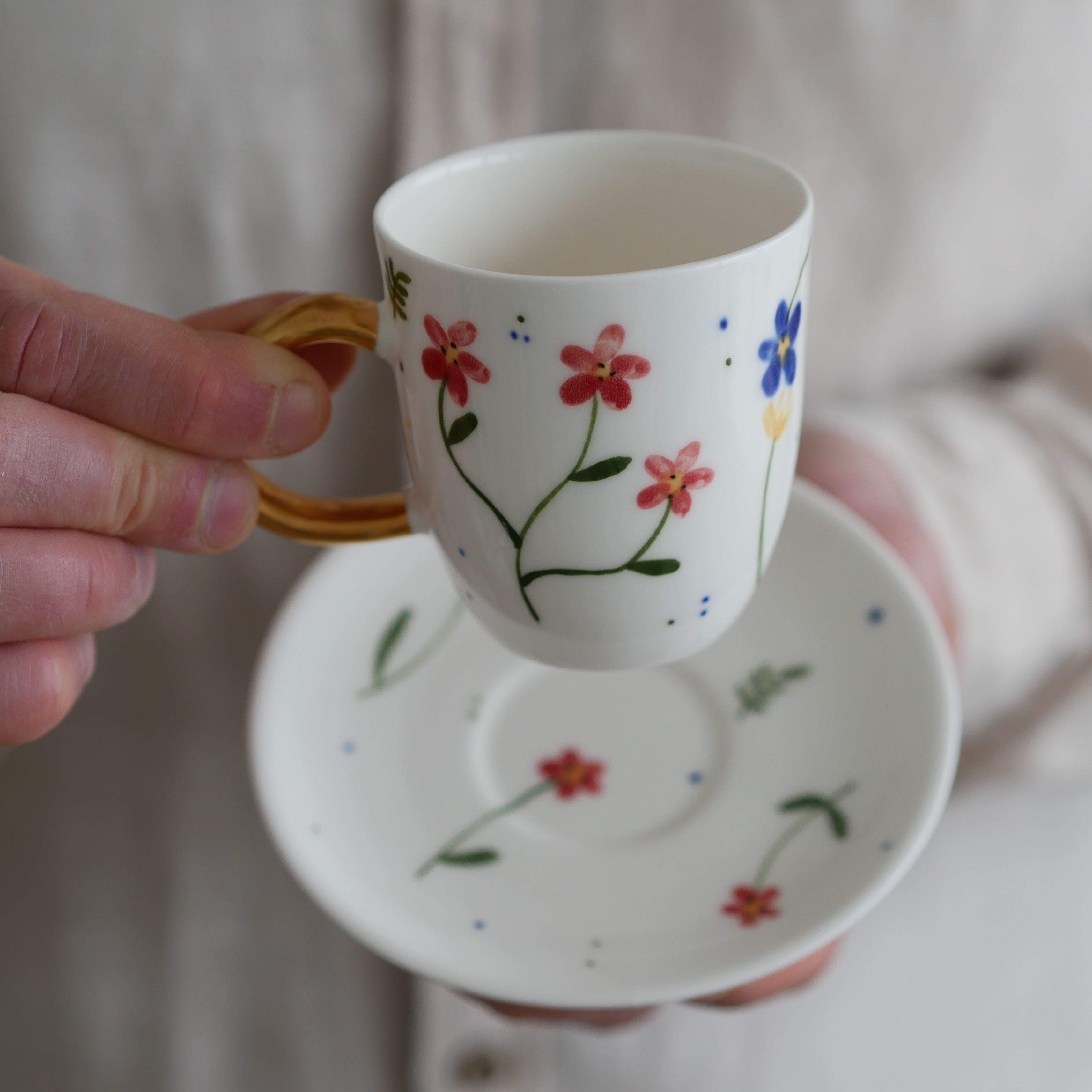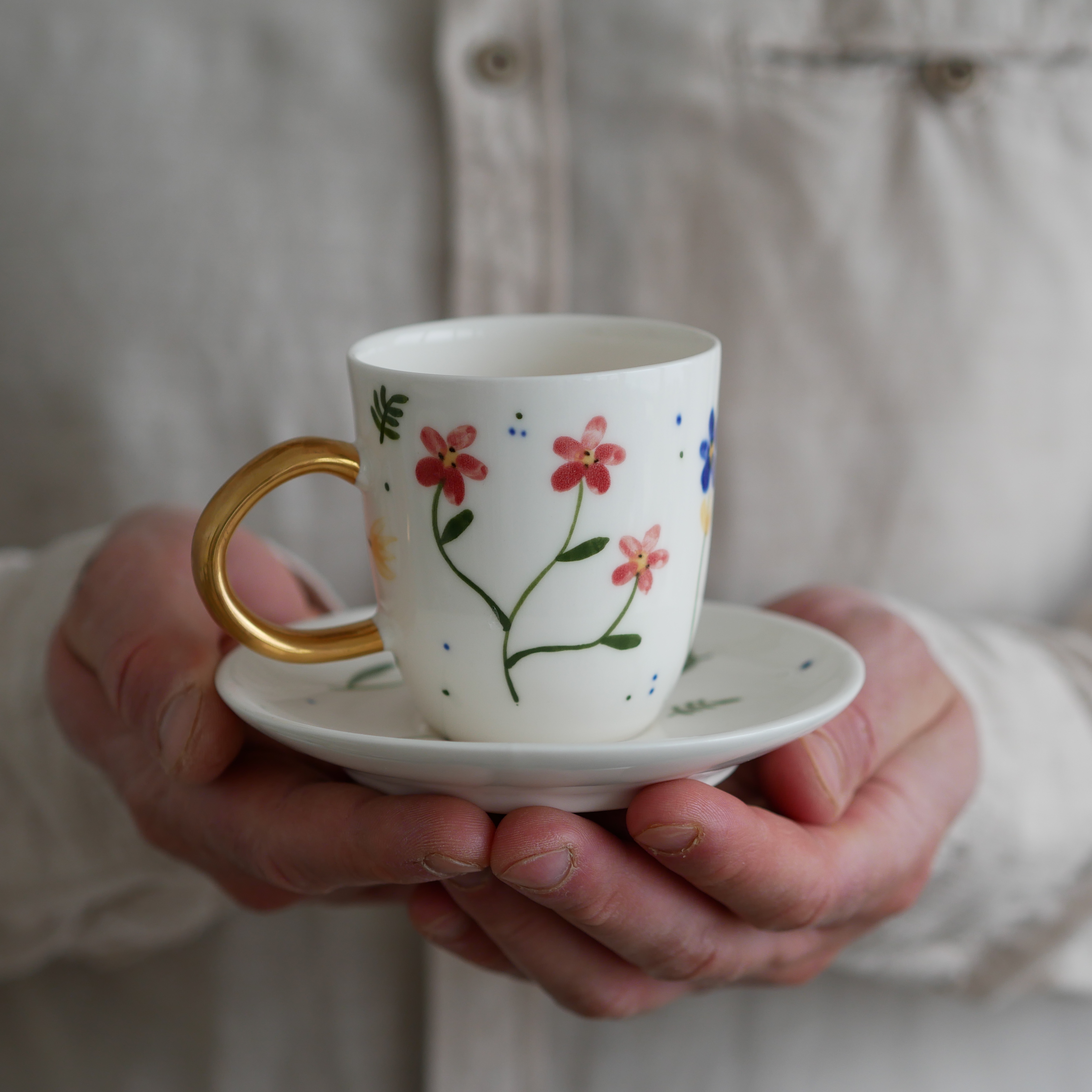 Kwiaty maluję ręcznie, dlatego na każdej filiżance wzór będzie wyglądać inaczej - zdjęcie poglądowe.