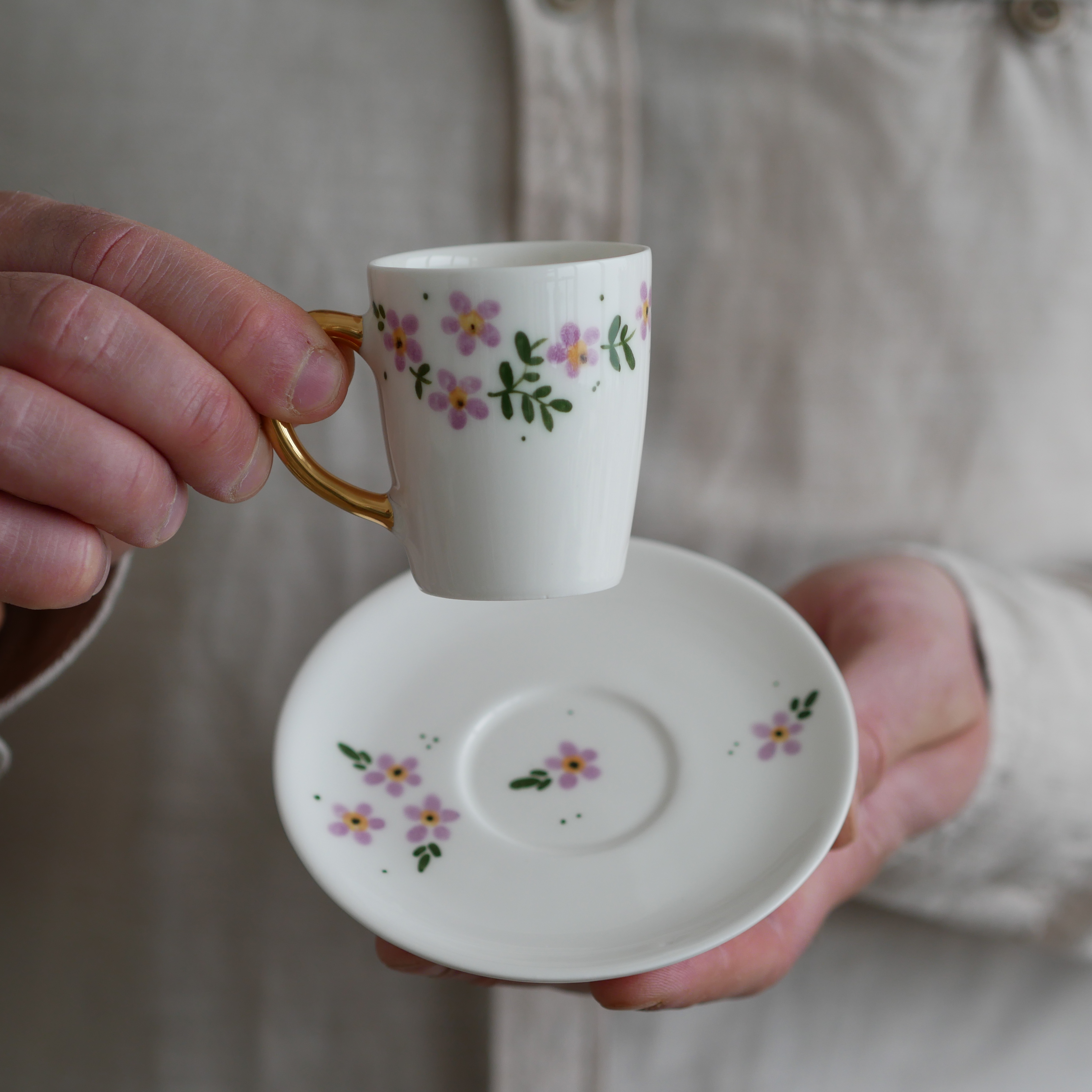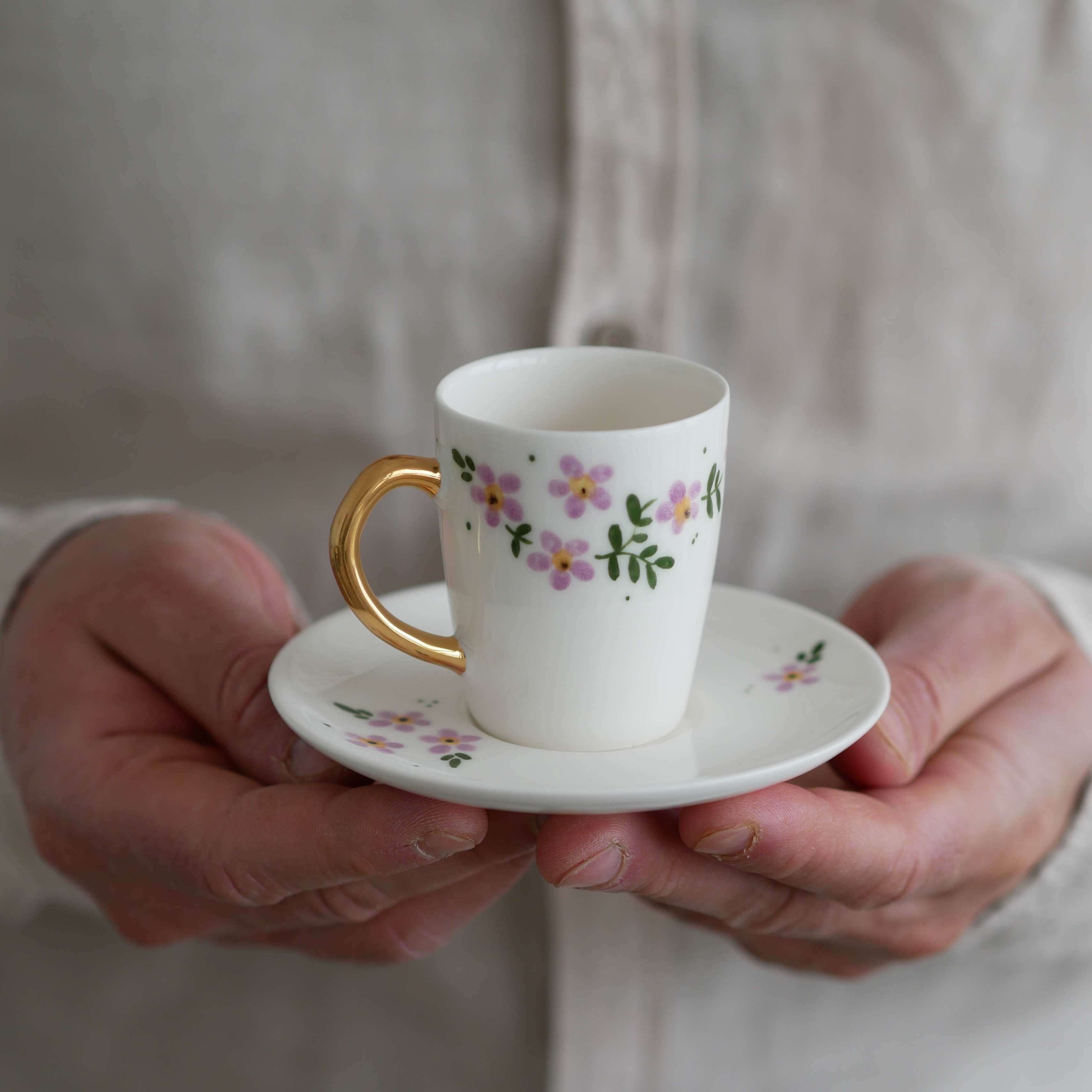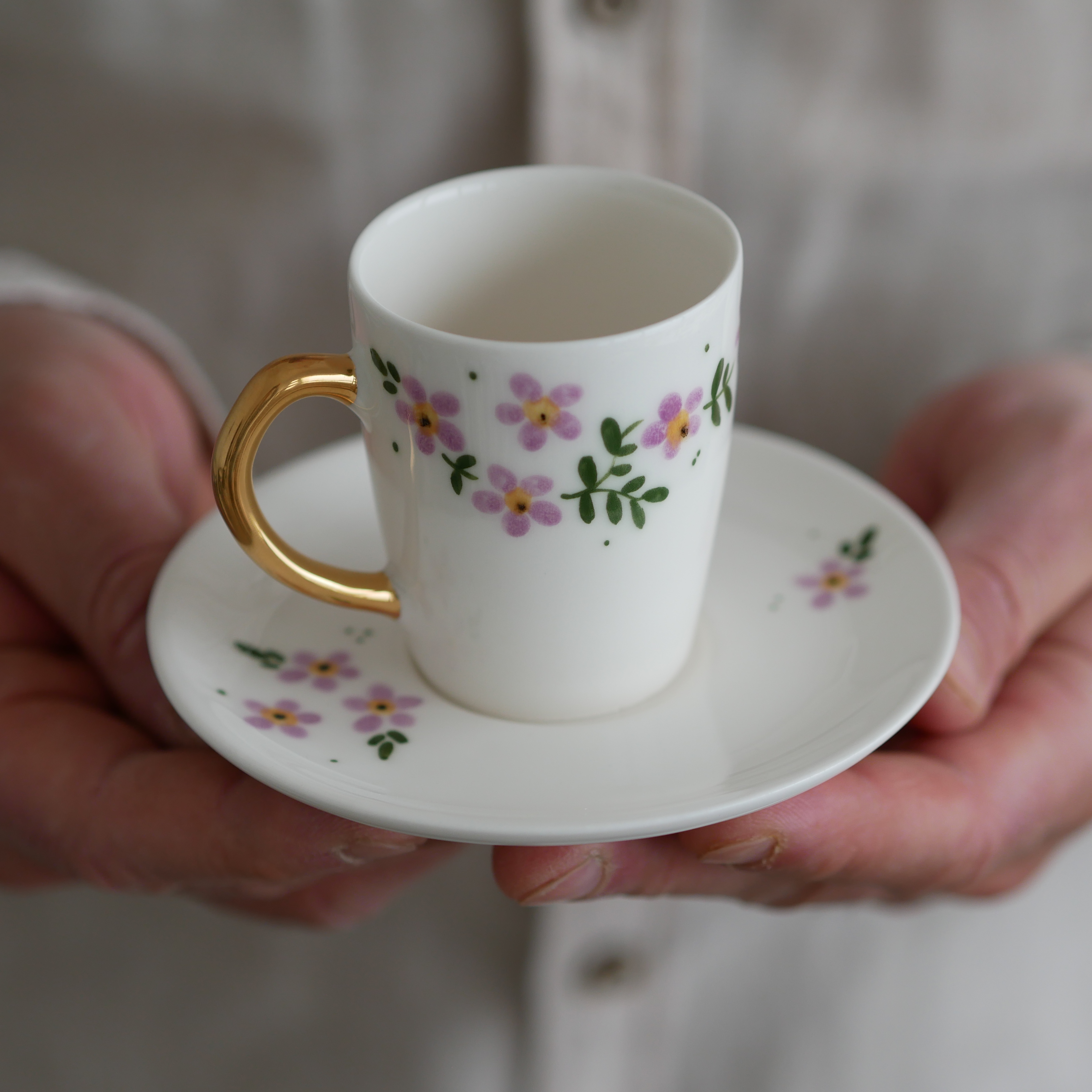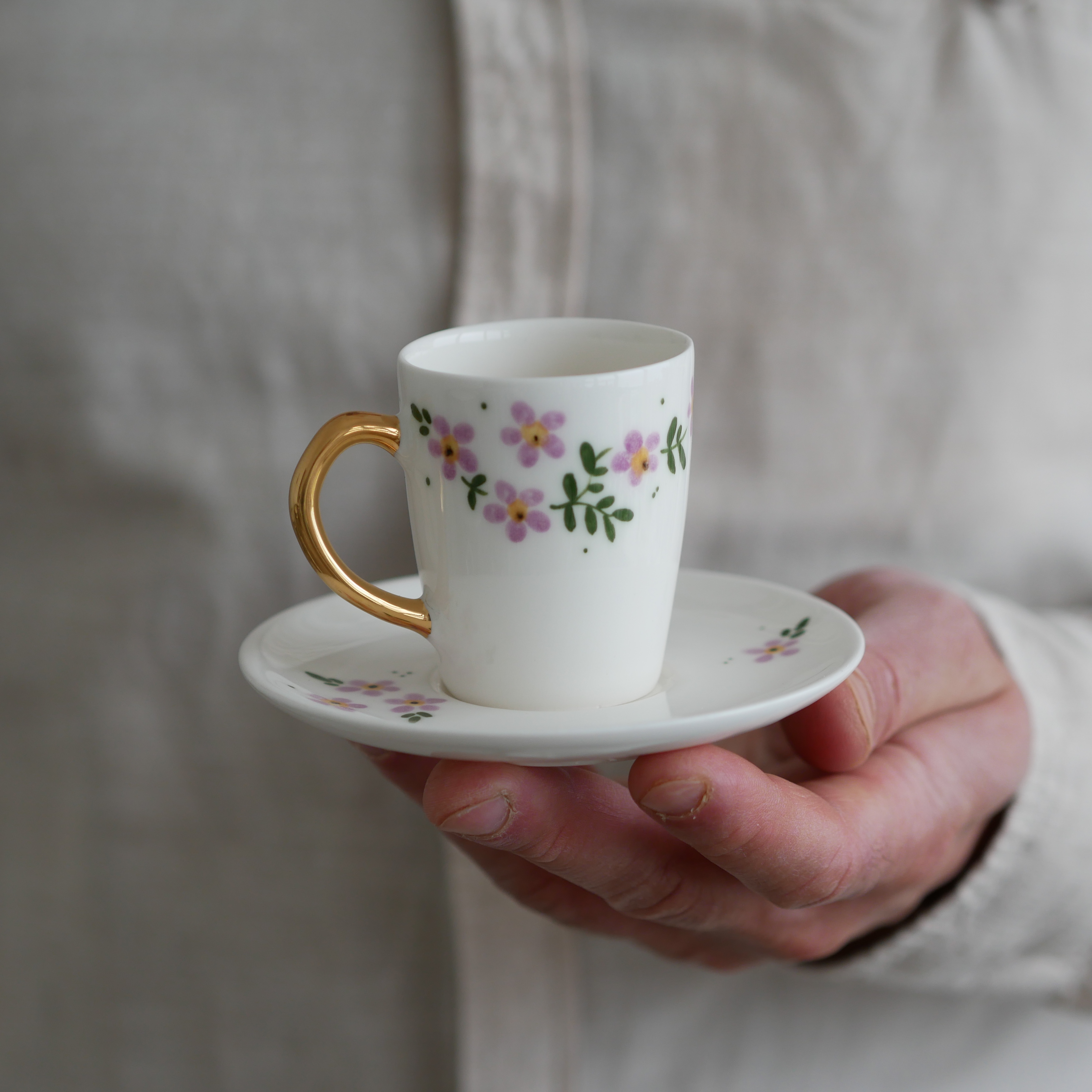II GATUNEK Filiżanka do espresso 70ml kwiaty wiejskie ze złotym uszkiem + talerzyk