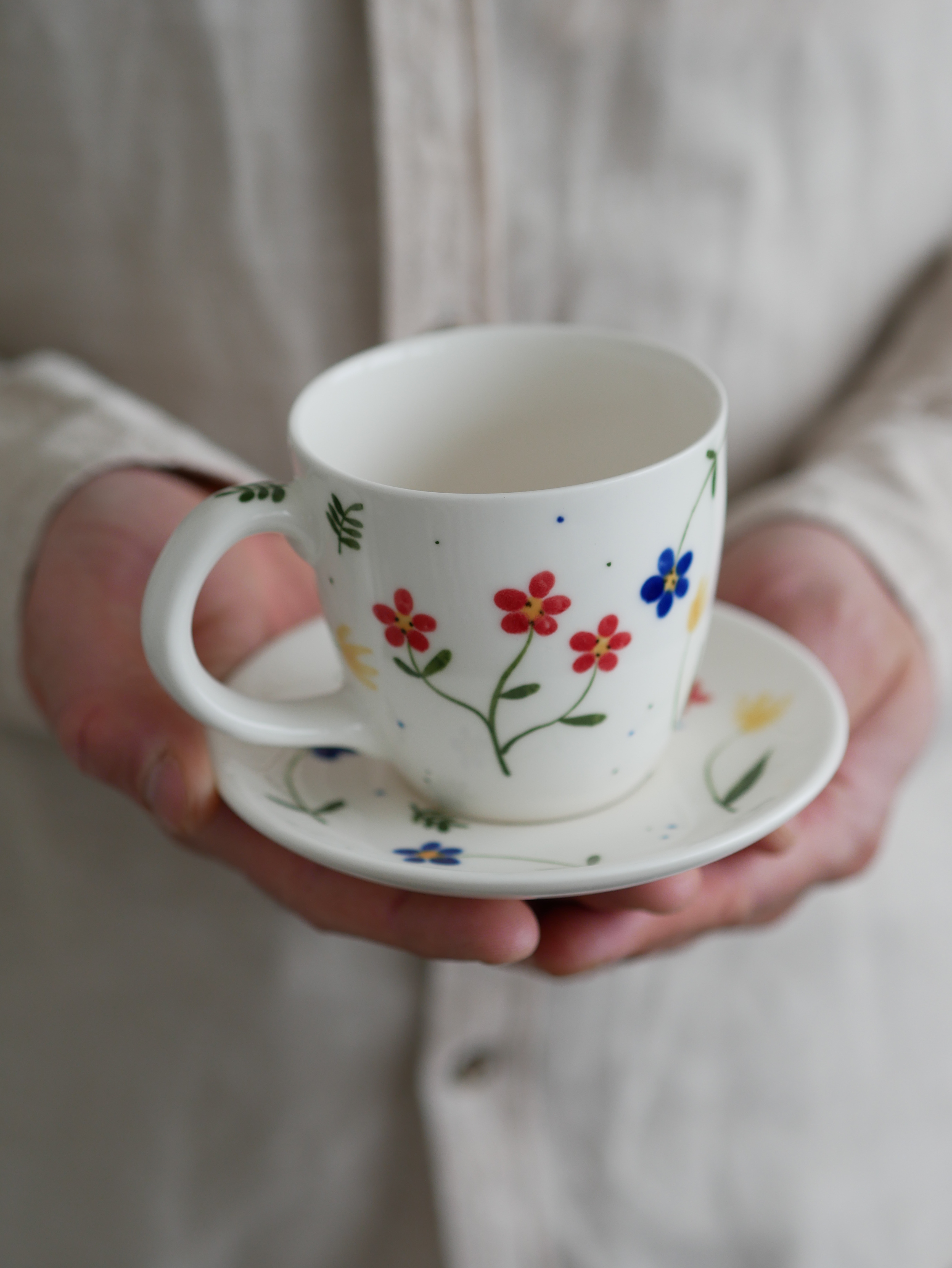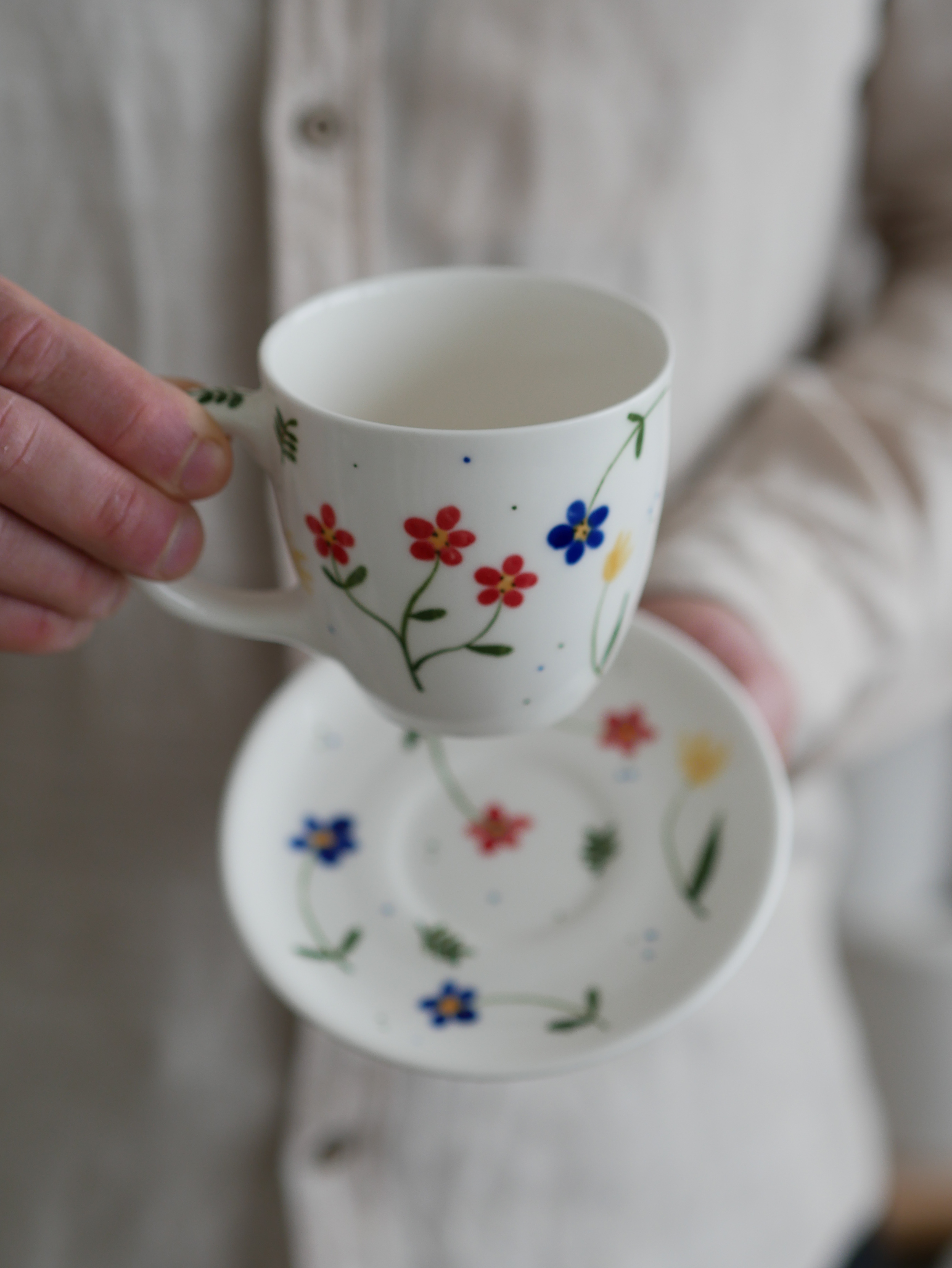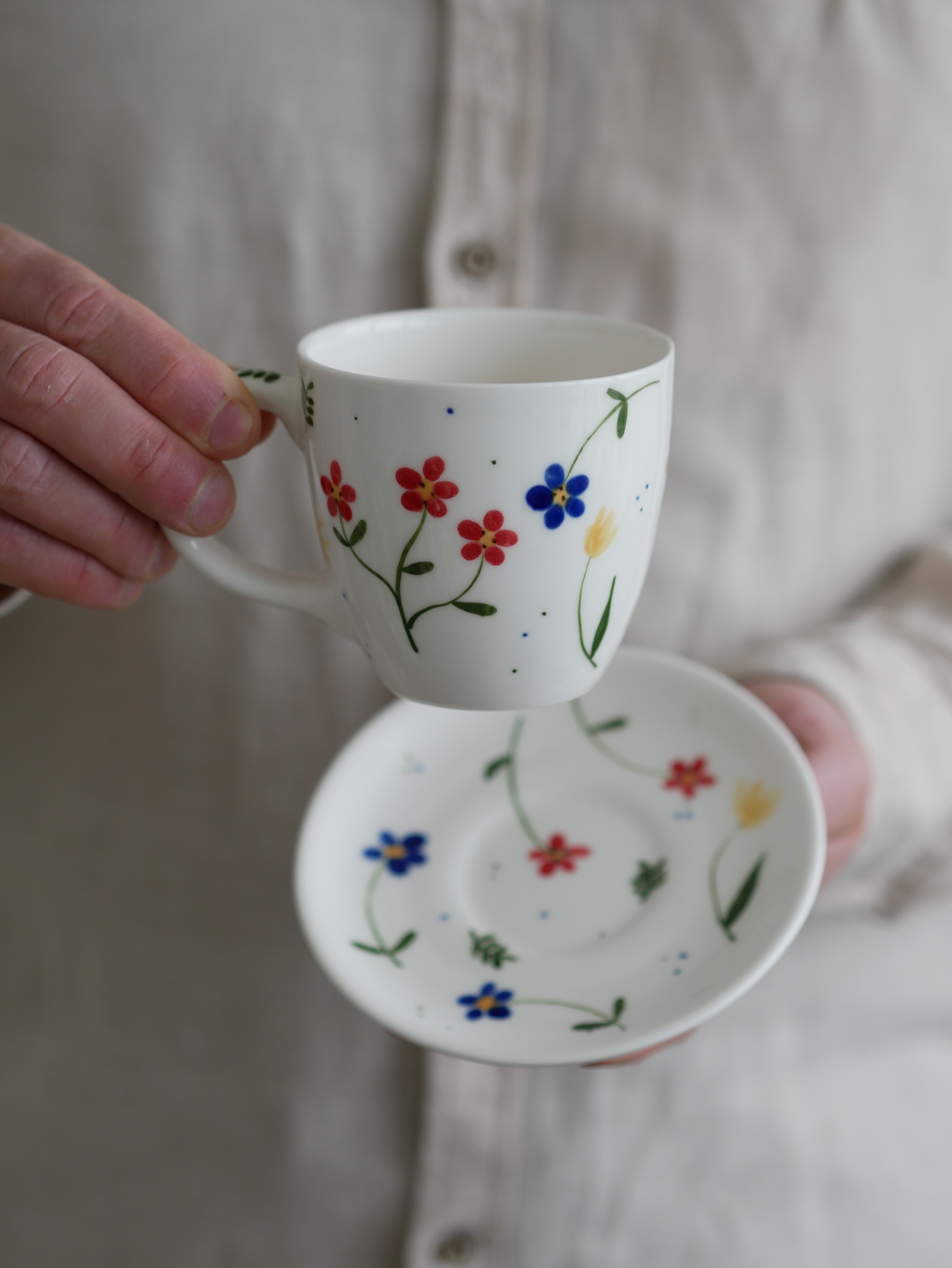 Kwiaty maluję ręcznie, dlatego na każdej filiżance wzór będzie wyglądać inaczej - zdjęcie poglądowe.