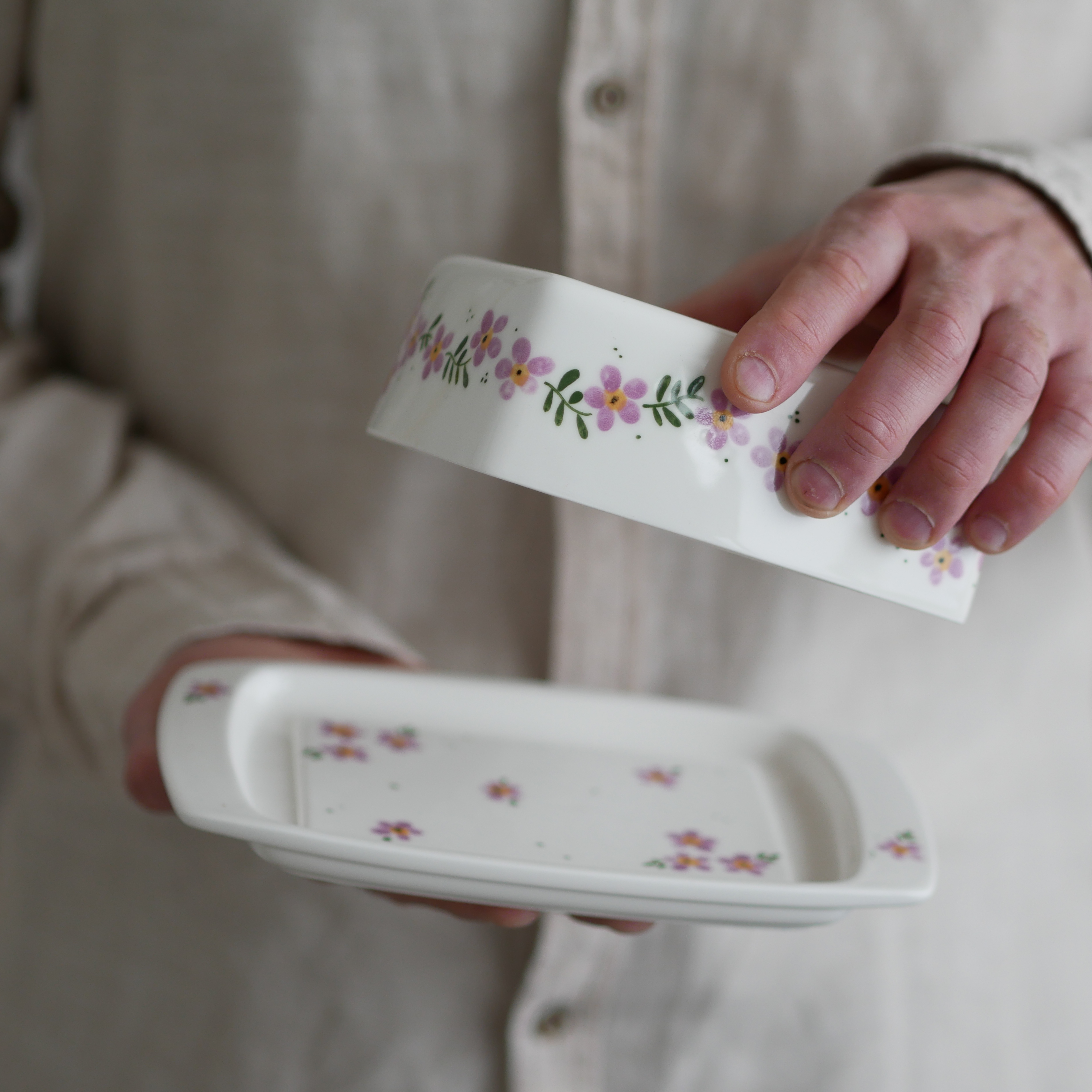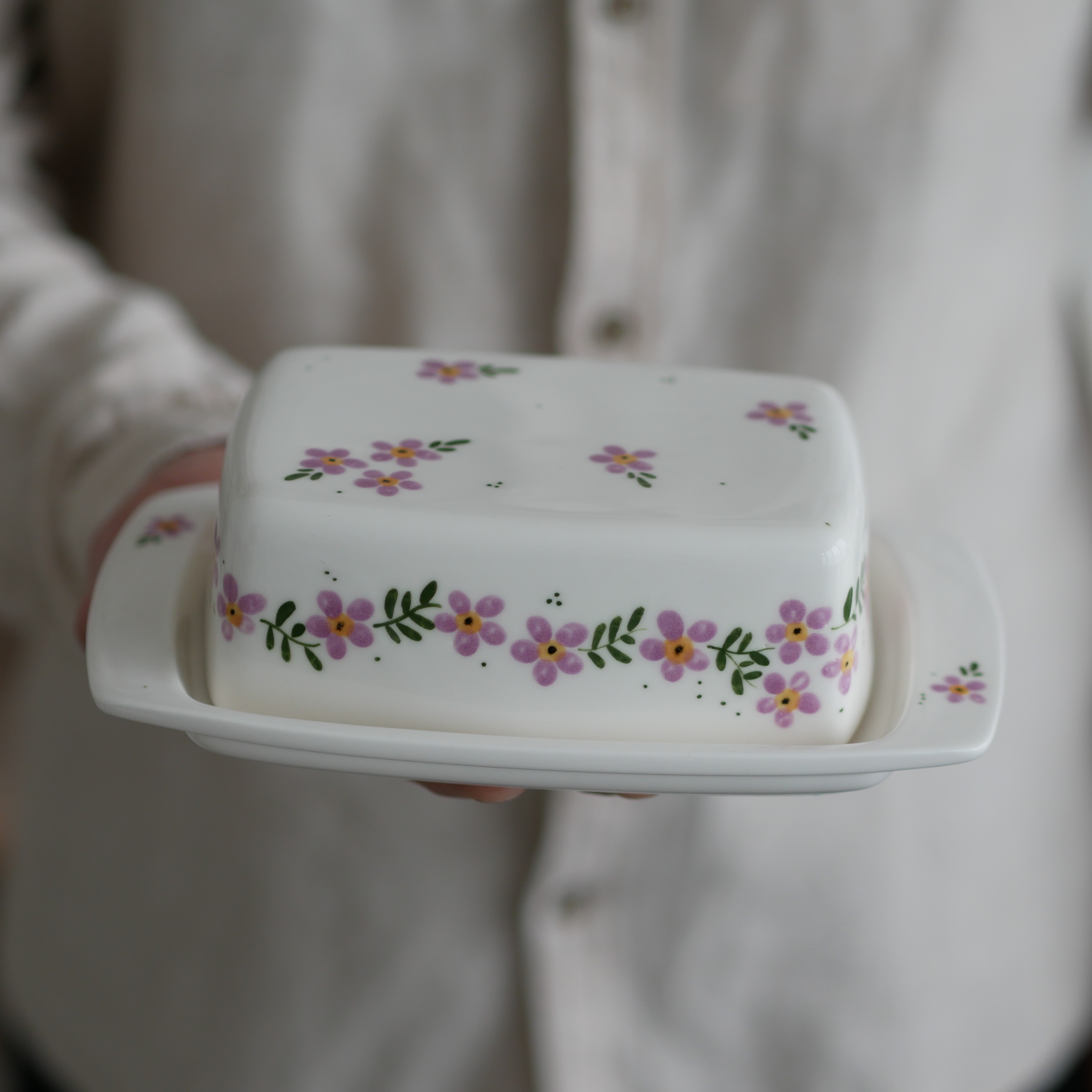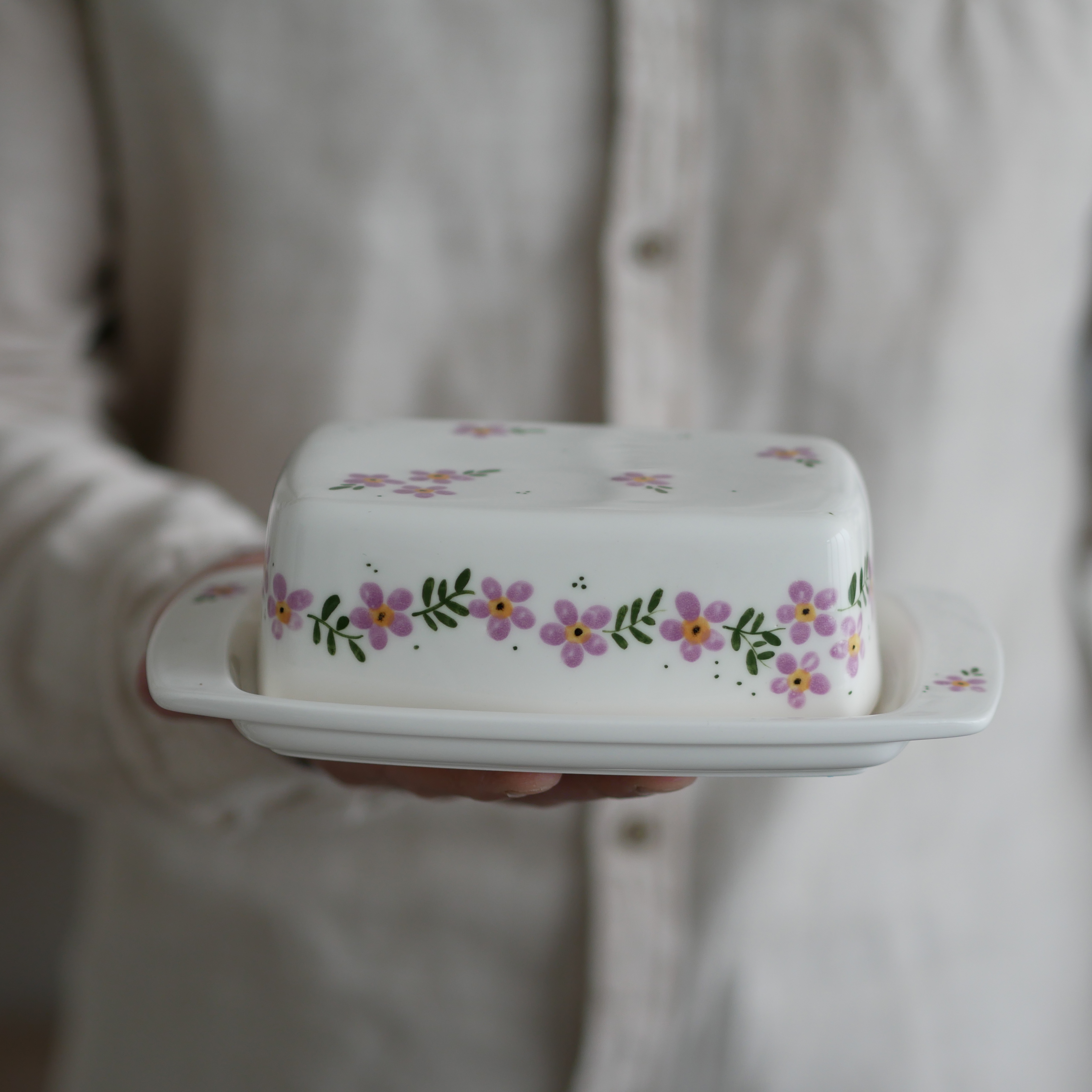 Maselnica w fioletowe kwiaty wiejskie - góra maselnicy lekko zdeformowana, ale pasuje do dołu.