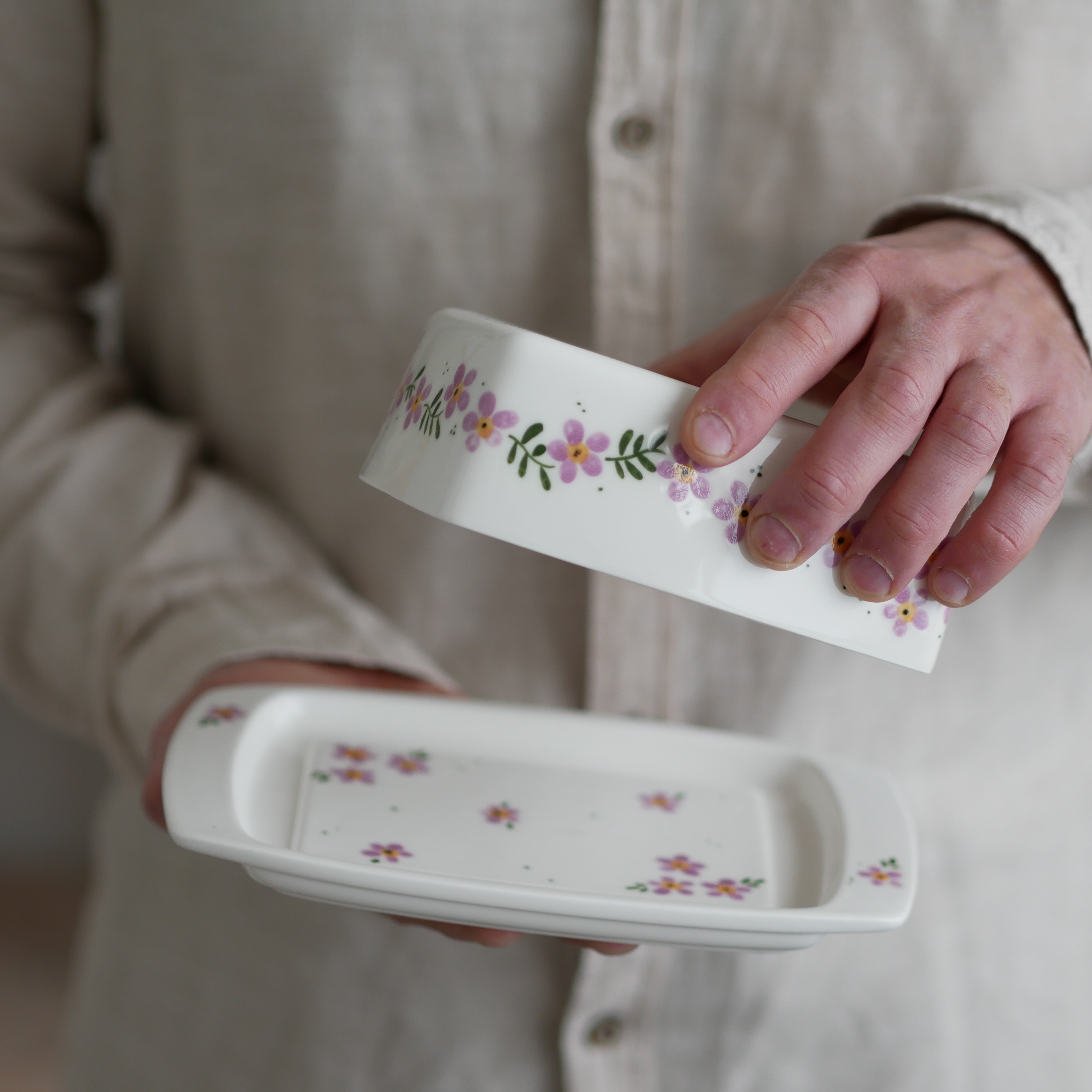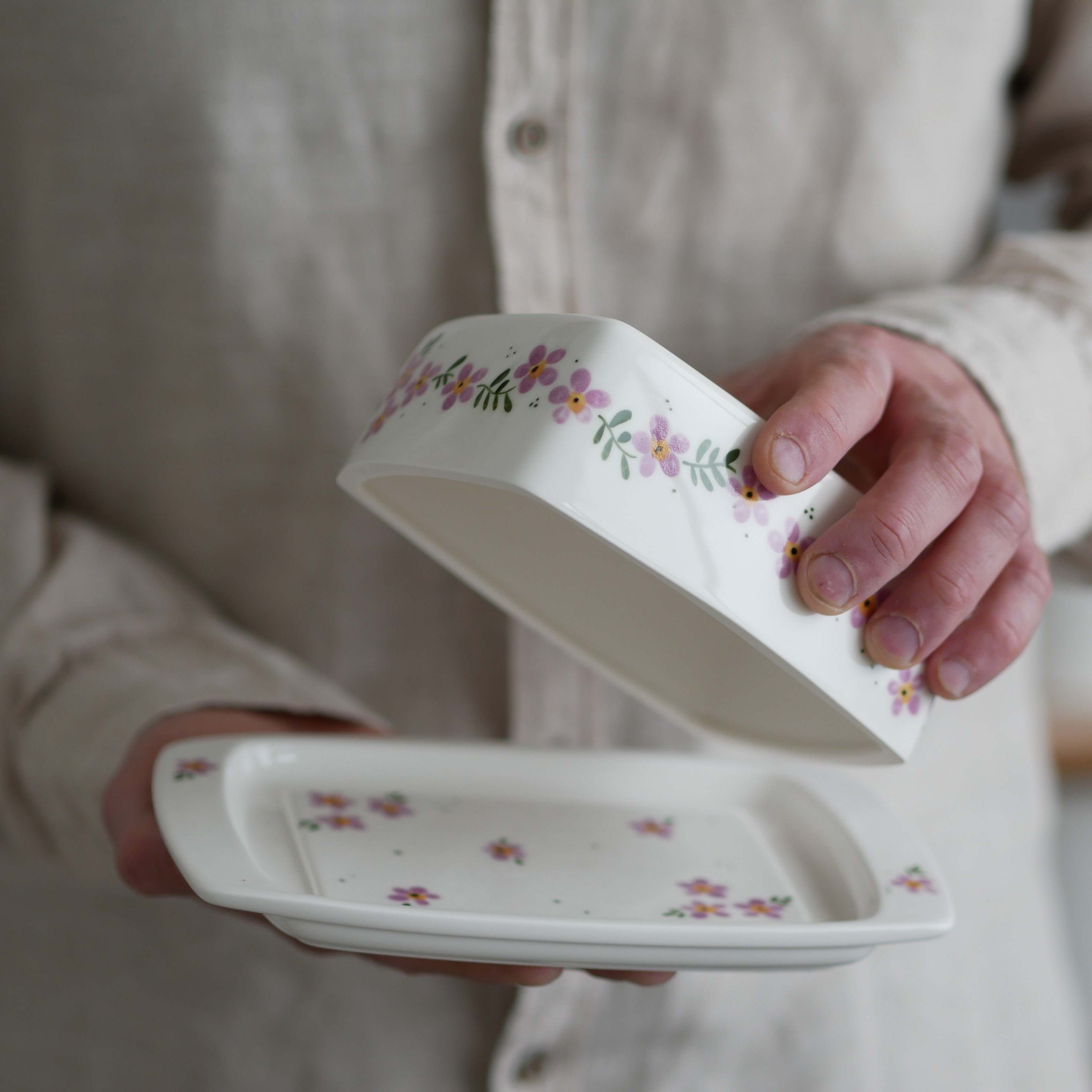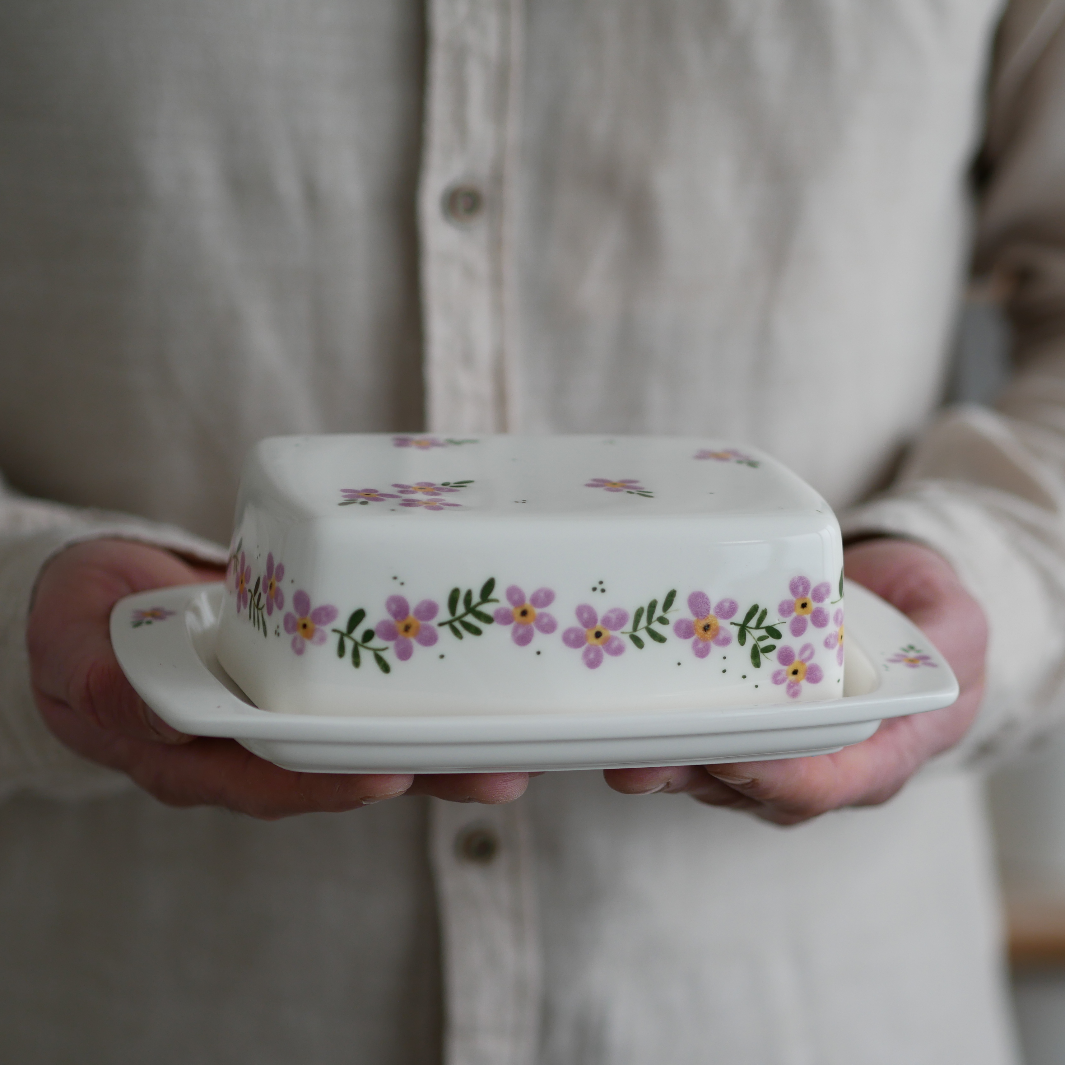 Maselnica w fioletowe kwiaty wiejskie - góra maselnicy lekko zdeformowana, ale pasuje do dołu.