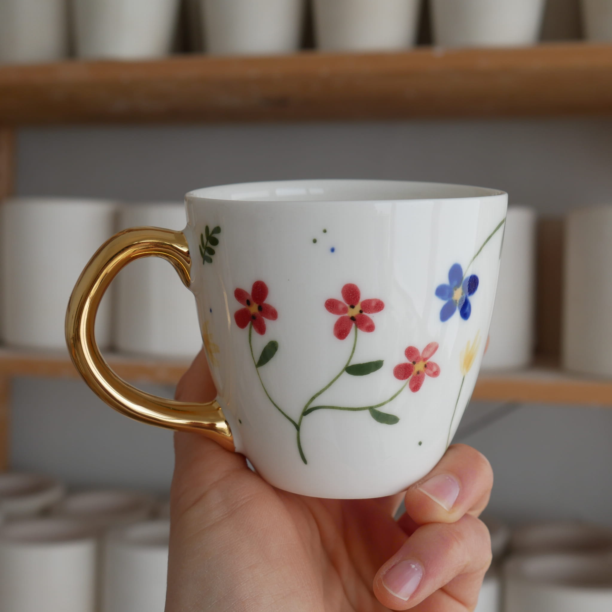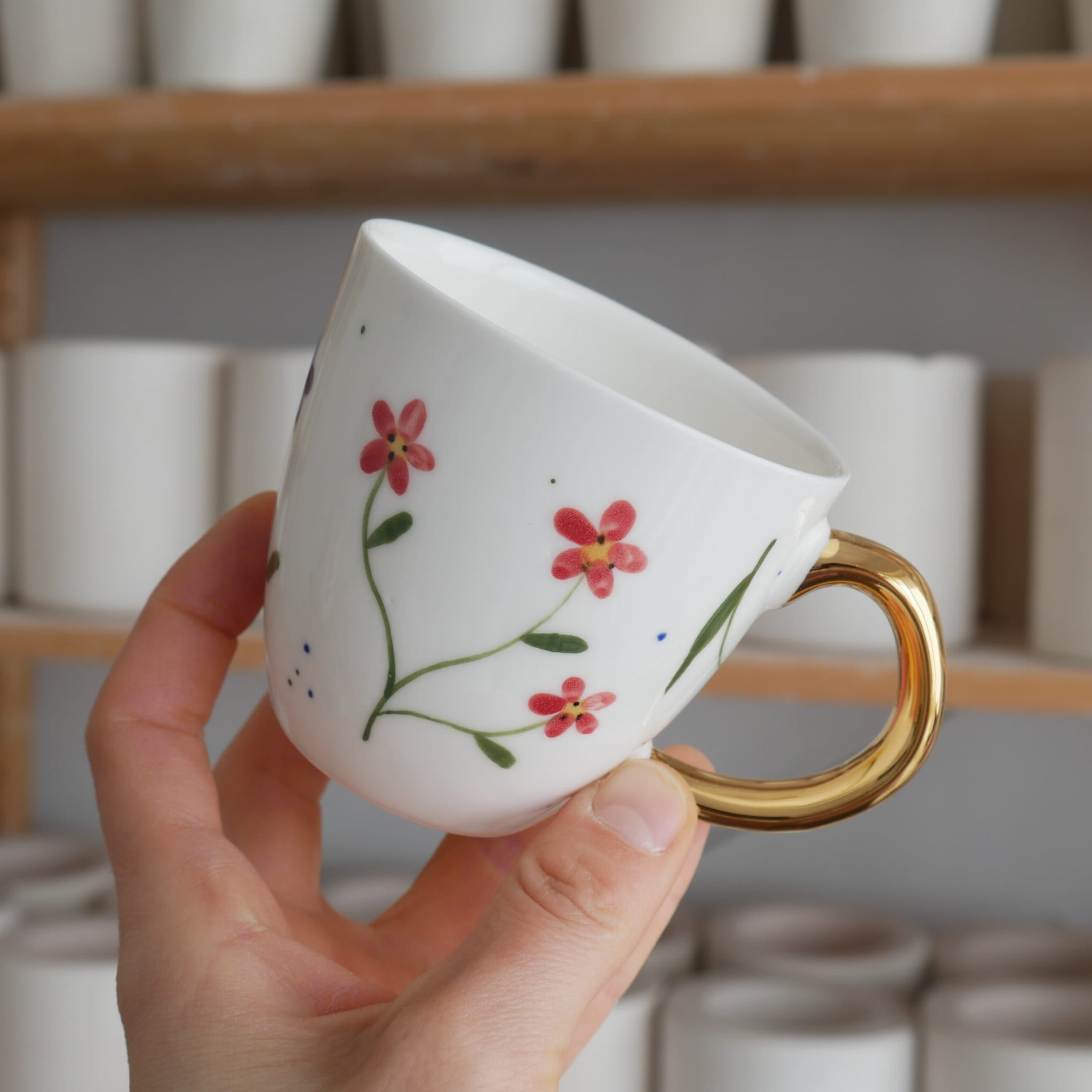 Kwiaty maluję ręcznie, dlatego na każdym kubku wzór będzie wyglądać inaczej - zdjęcie poglądowe.