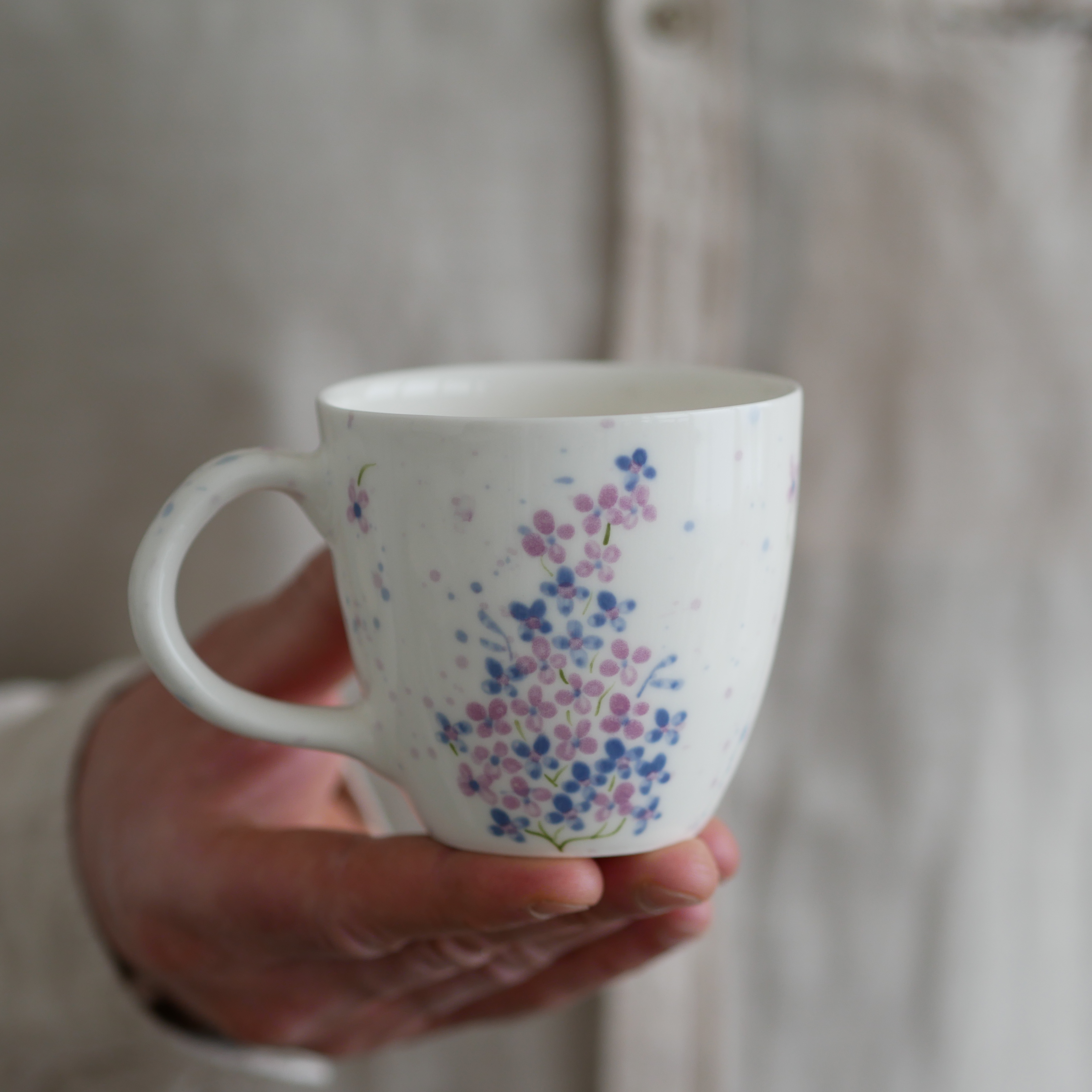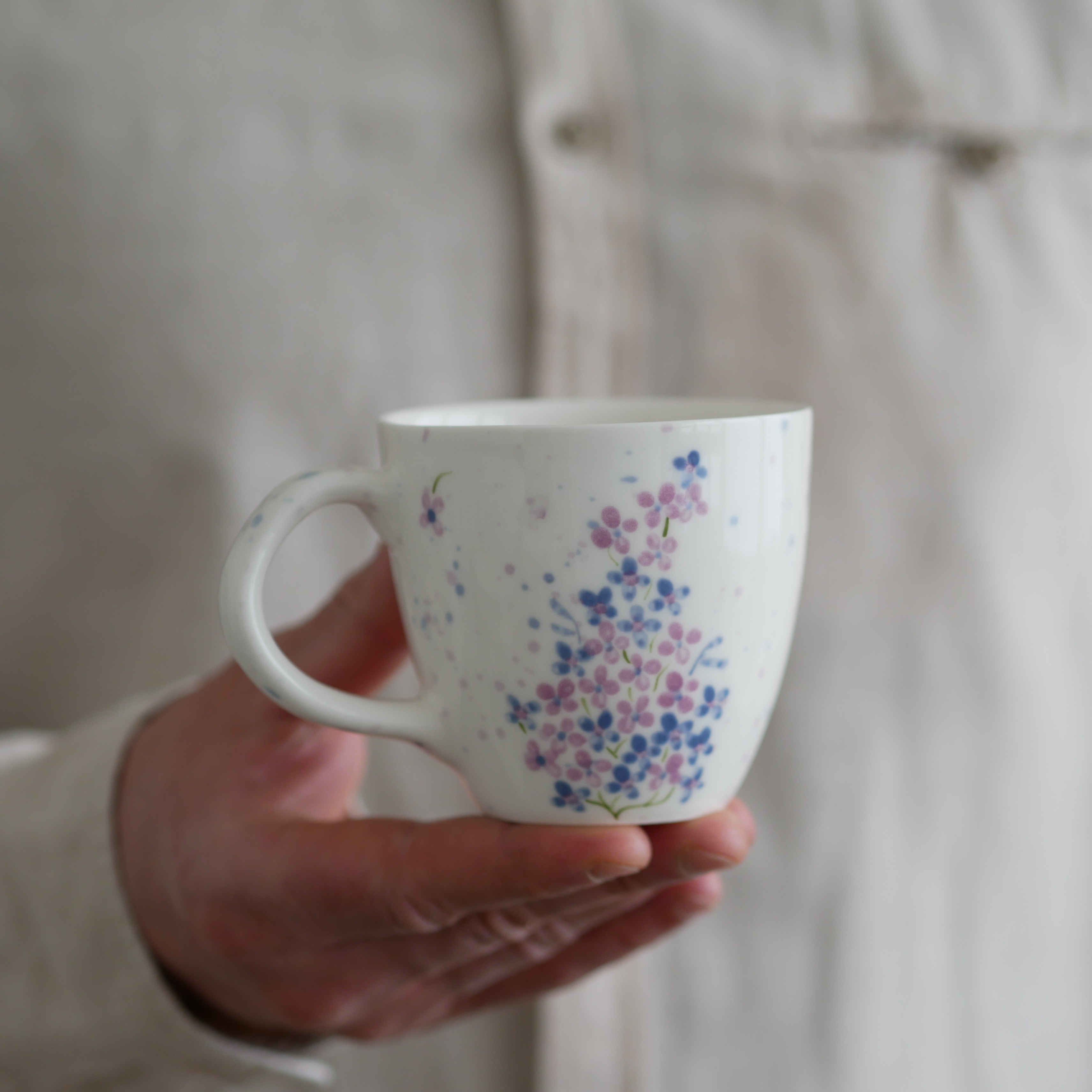 Kubek z pięknymi fioletowymi kwiatuszkami.