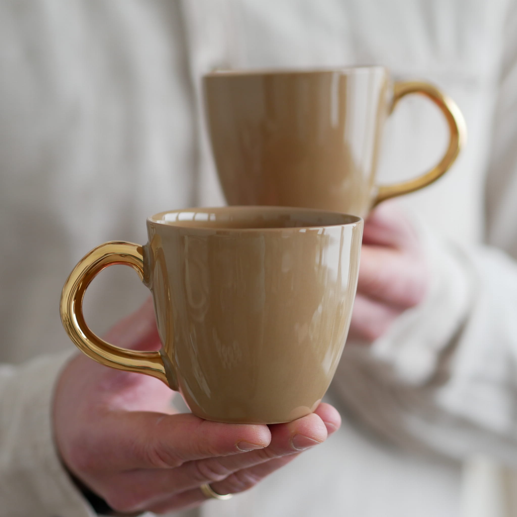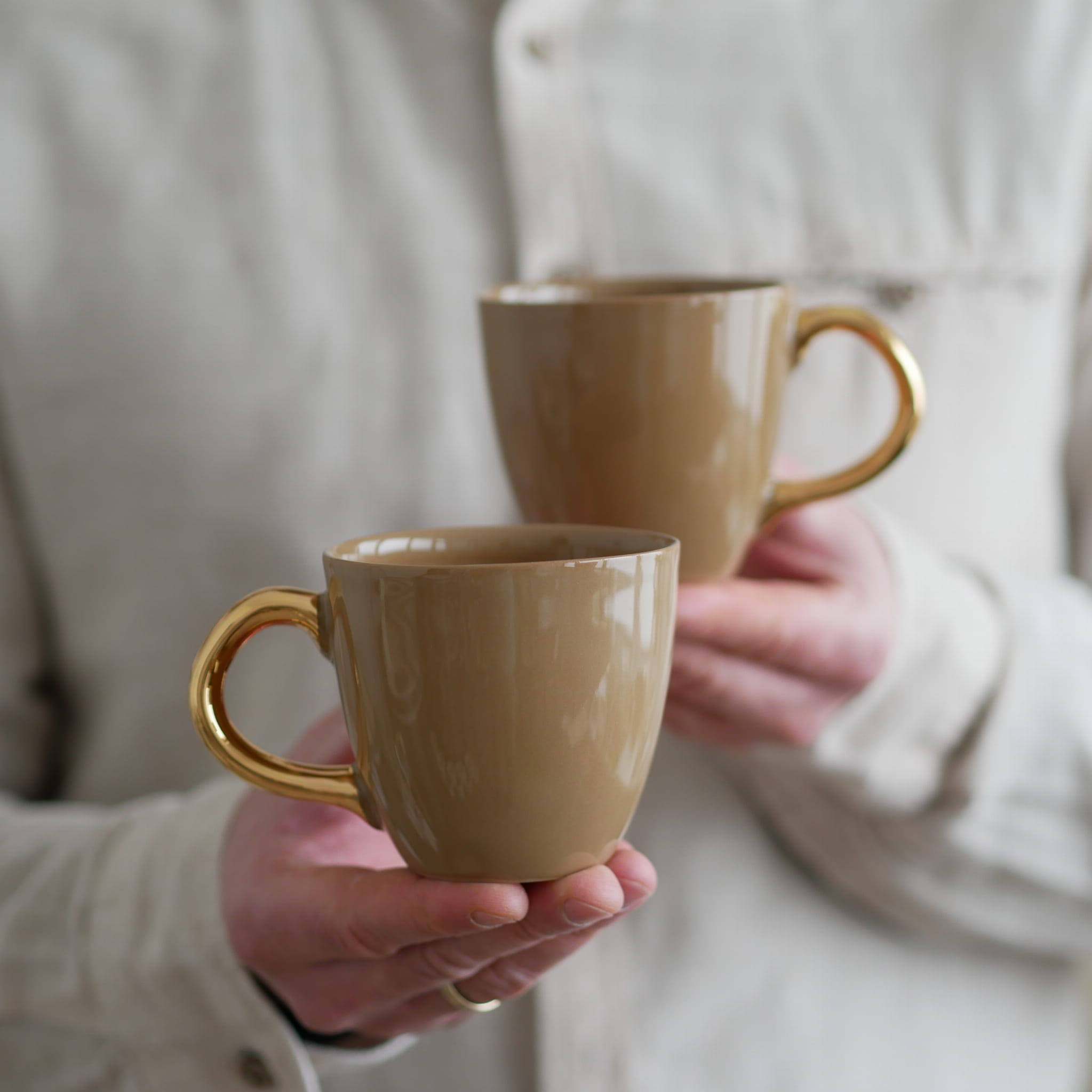 Brązowy jak mleczna czekolada kubek ze złotym uszkiem w kształcie bąbelków.
