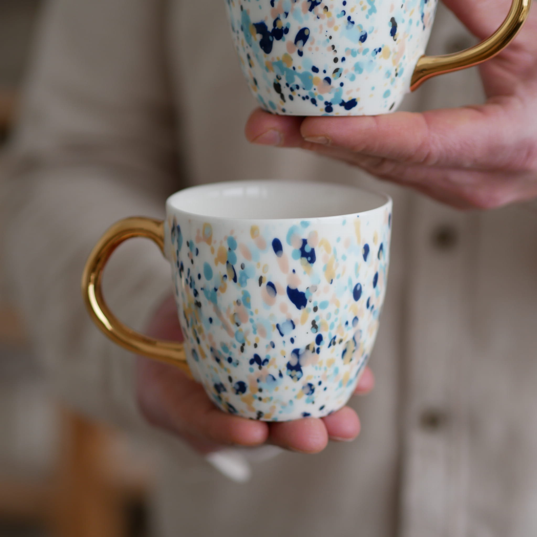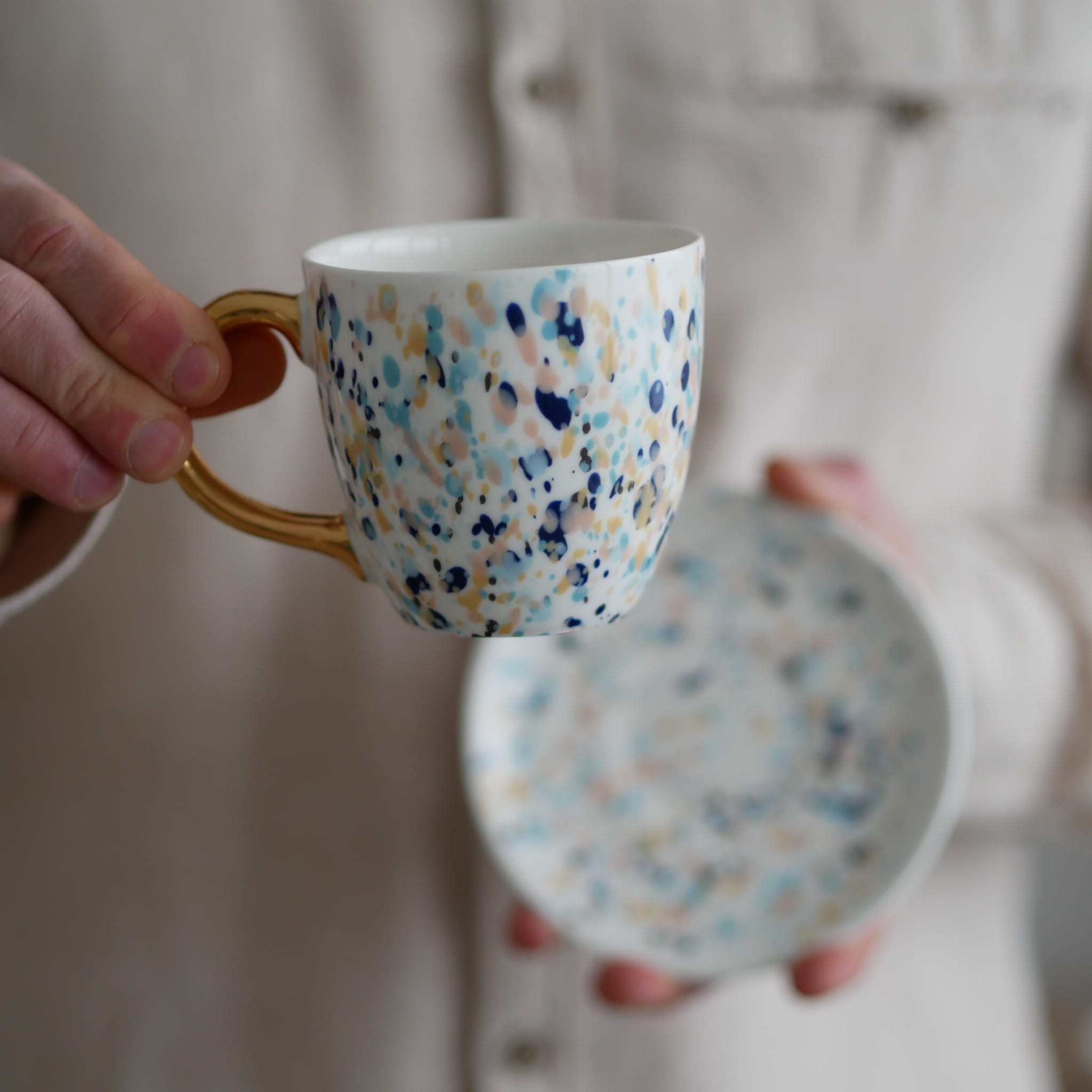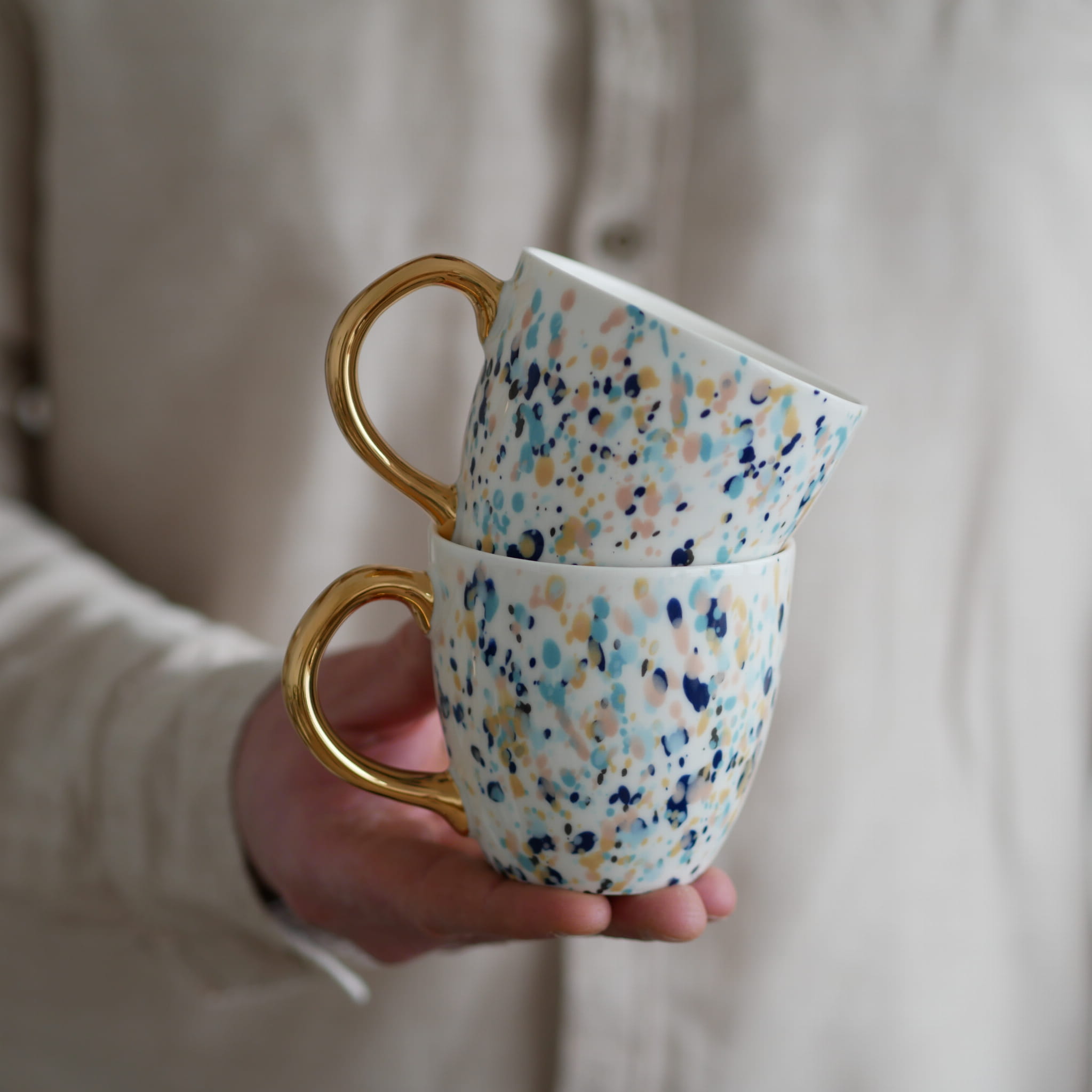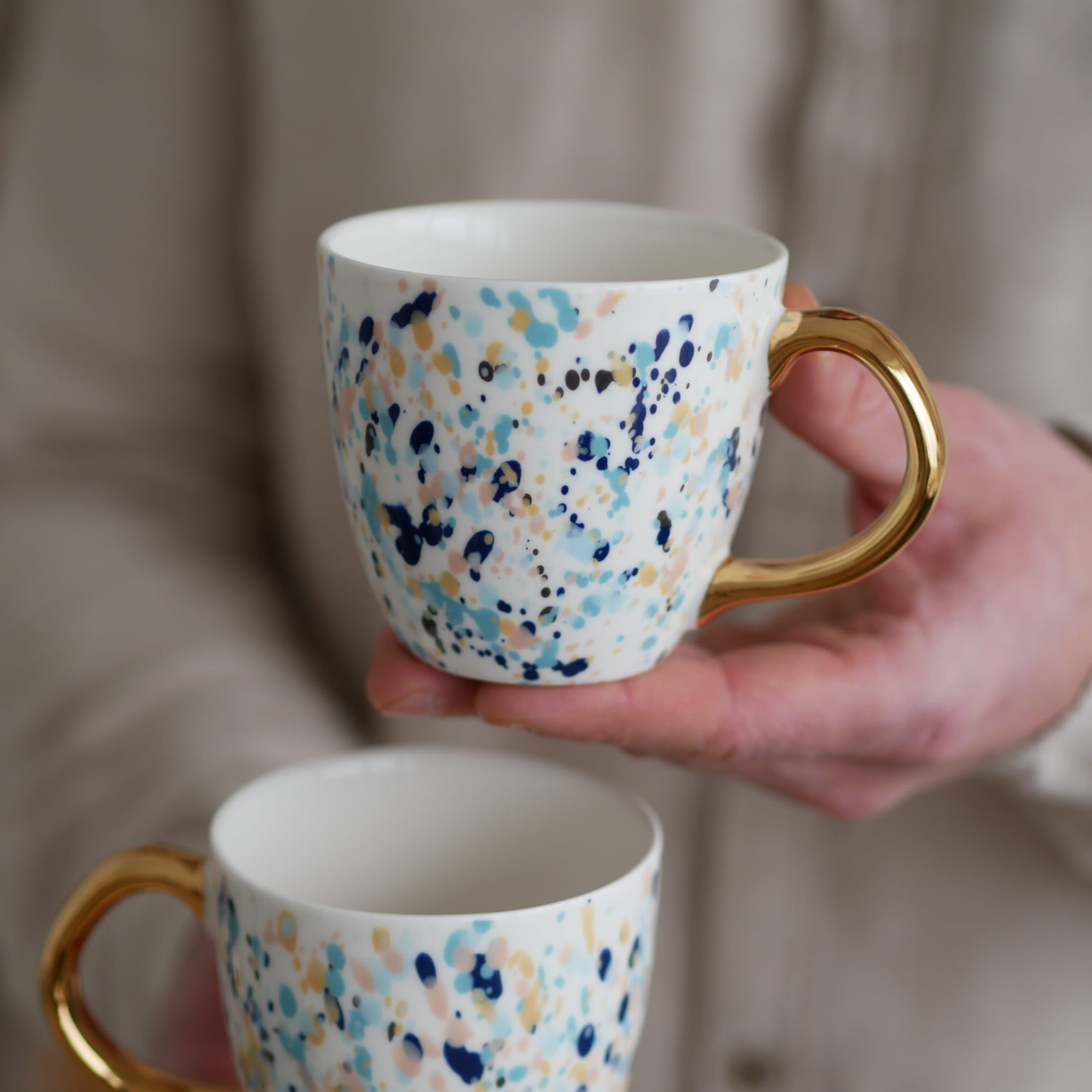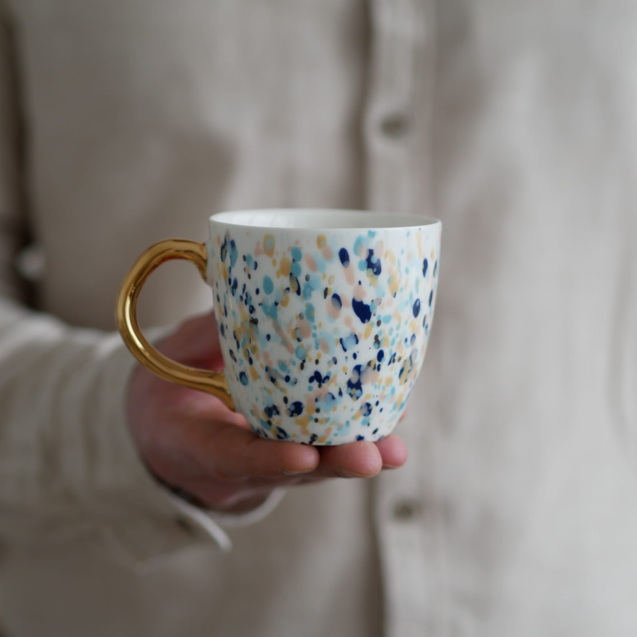Kubek w kolorowe kropki ze złotym uszkiem.