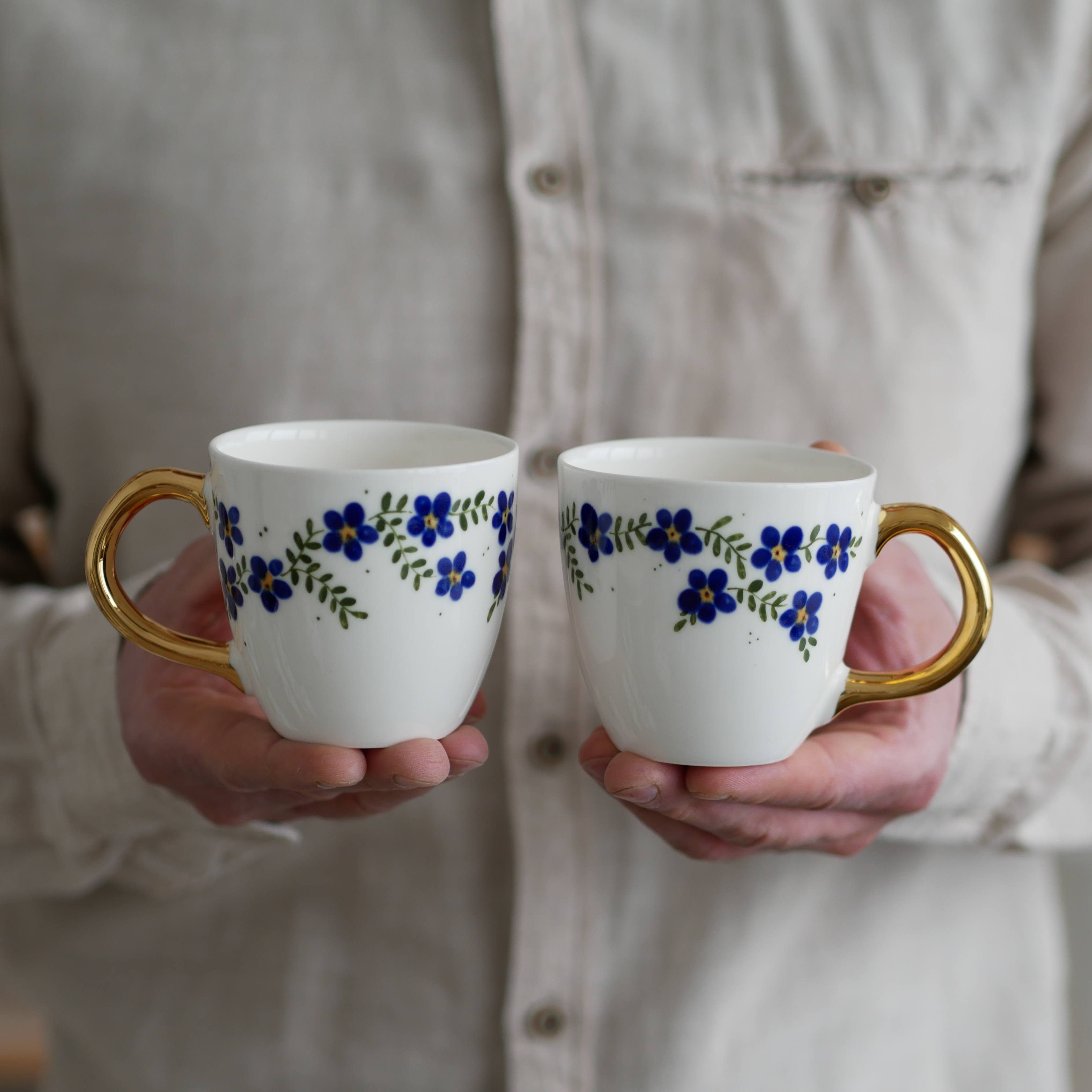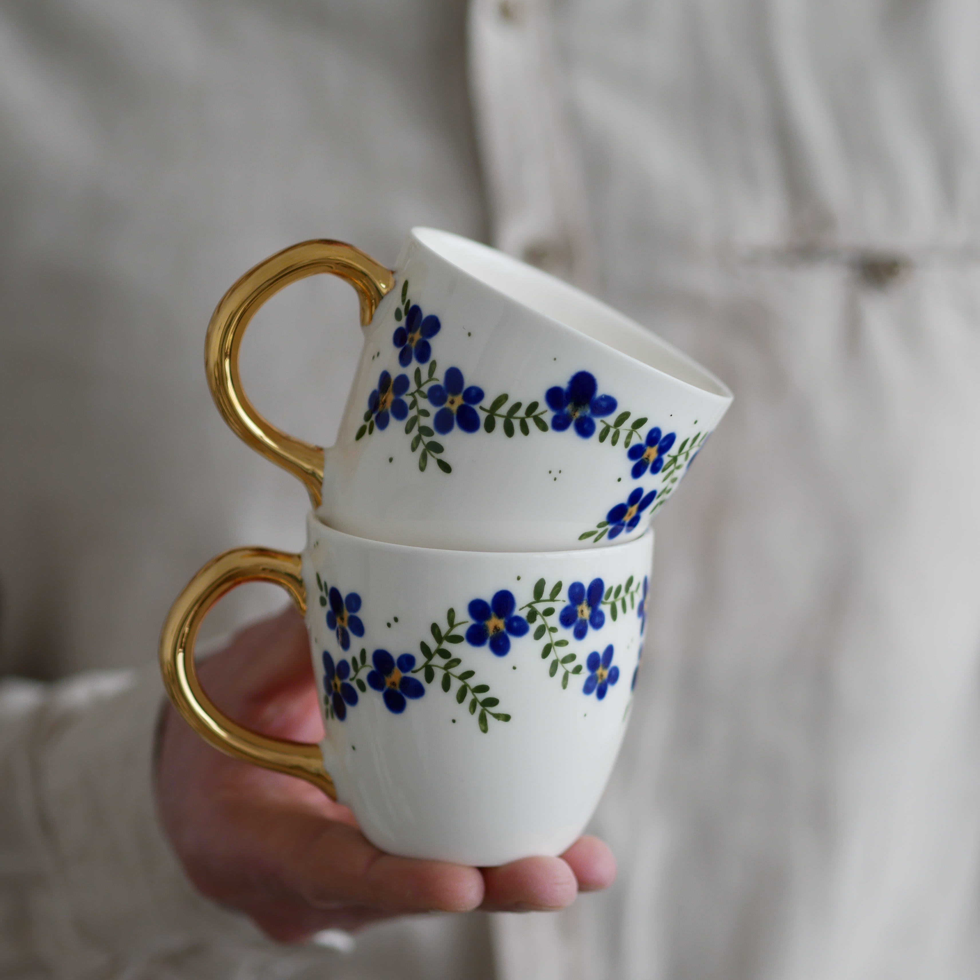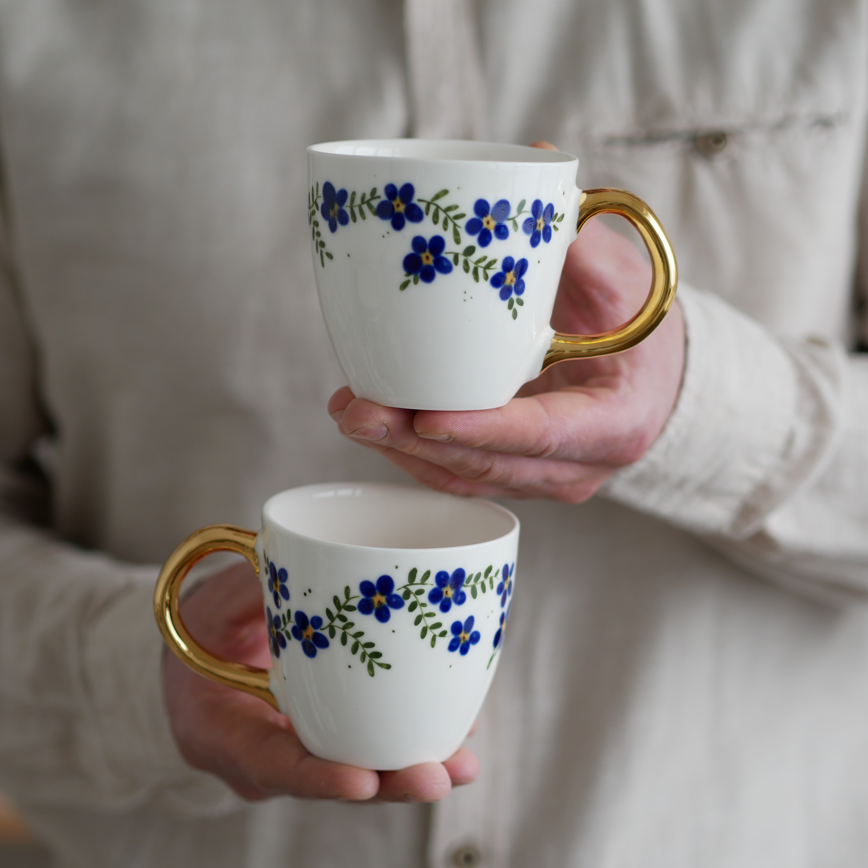 Kubek 220ml kwiaty wiejskie kobaltowe ze złotym uszkiem
