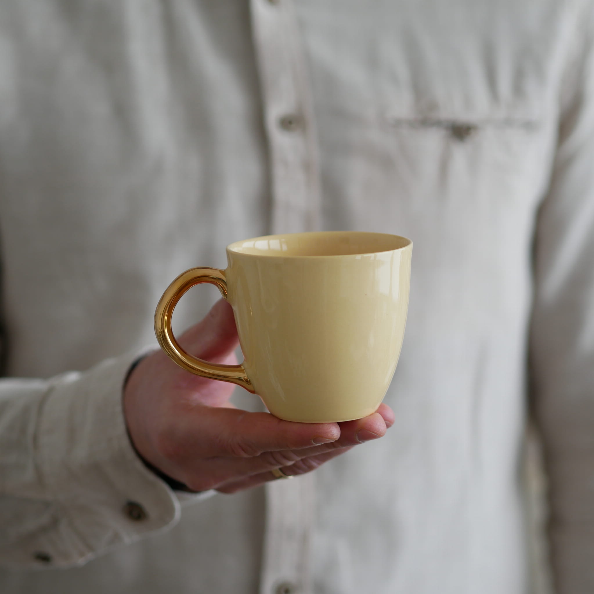 Kubek ze złotym uszkiem w klasycznym kształcie.