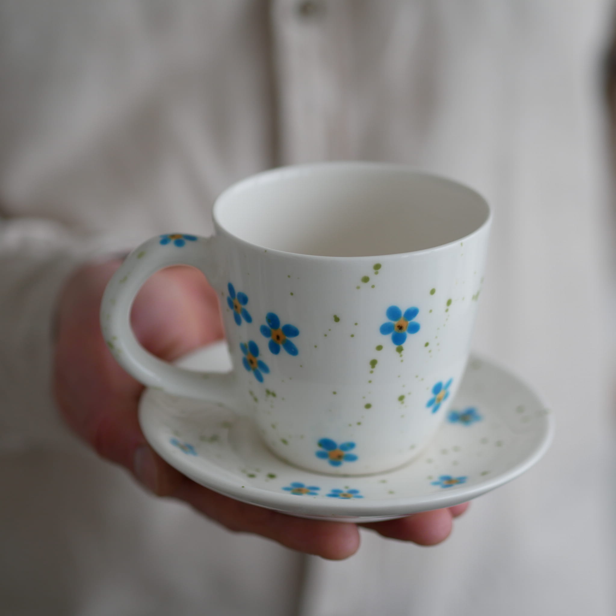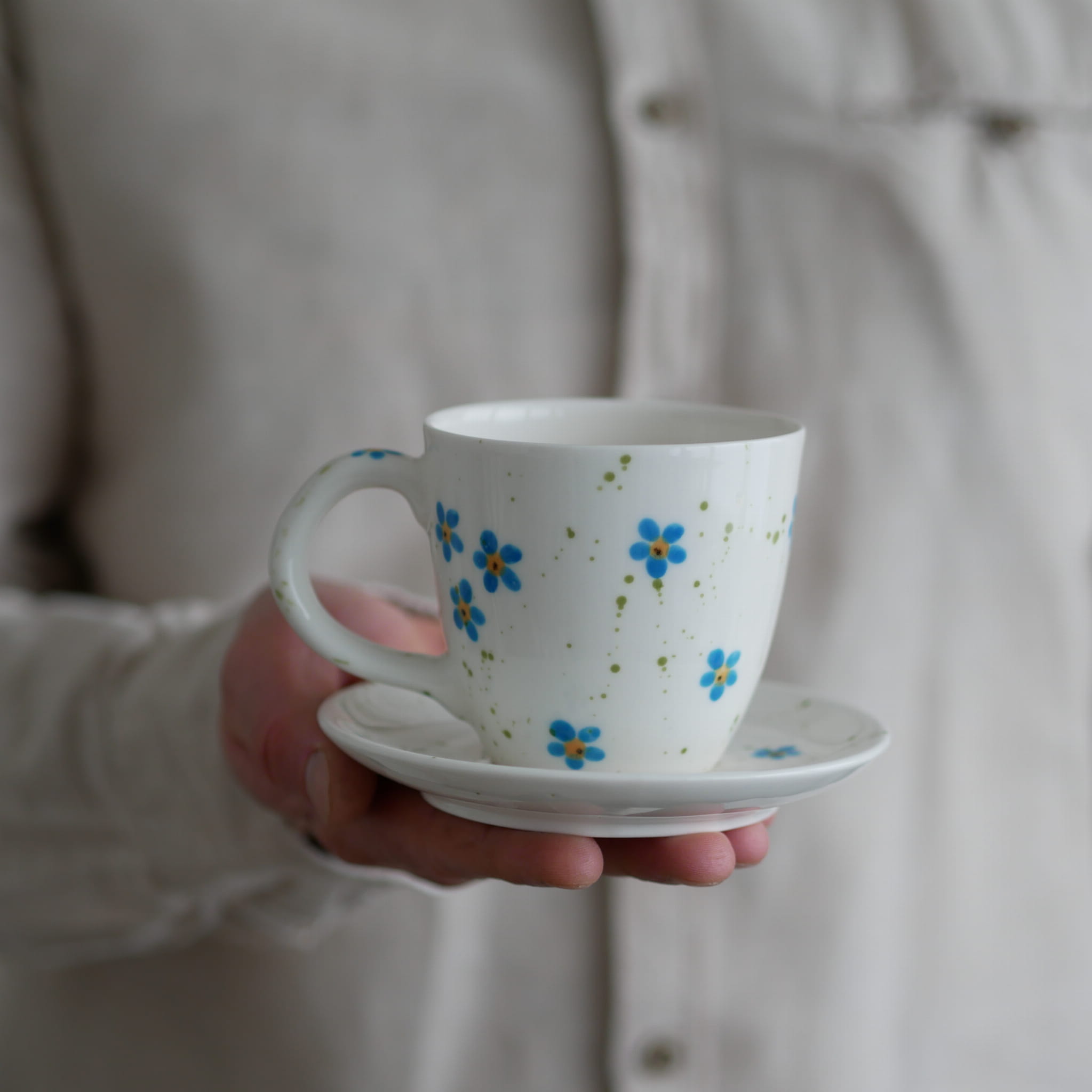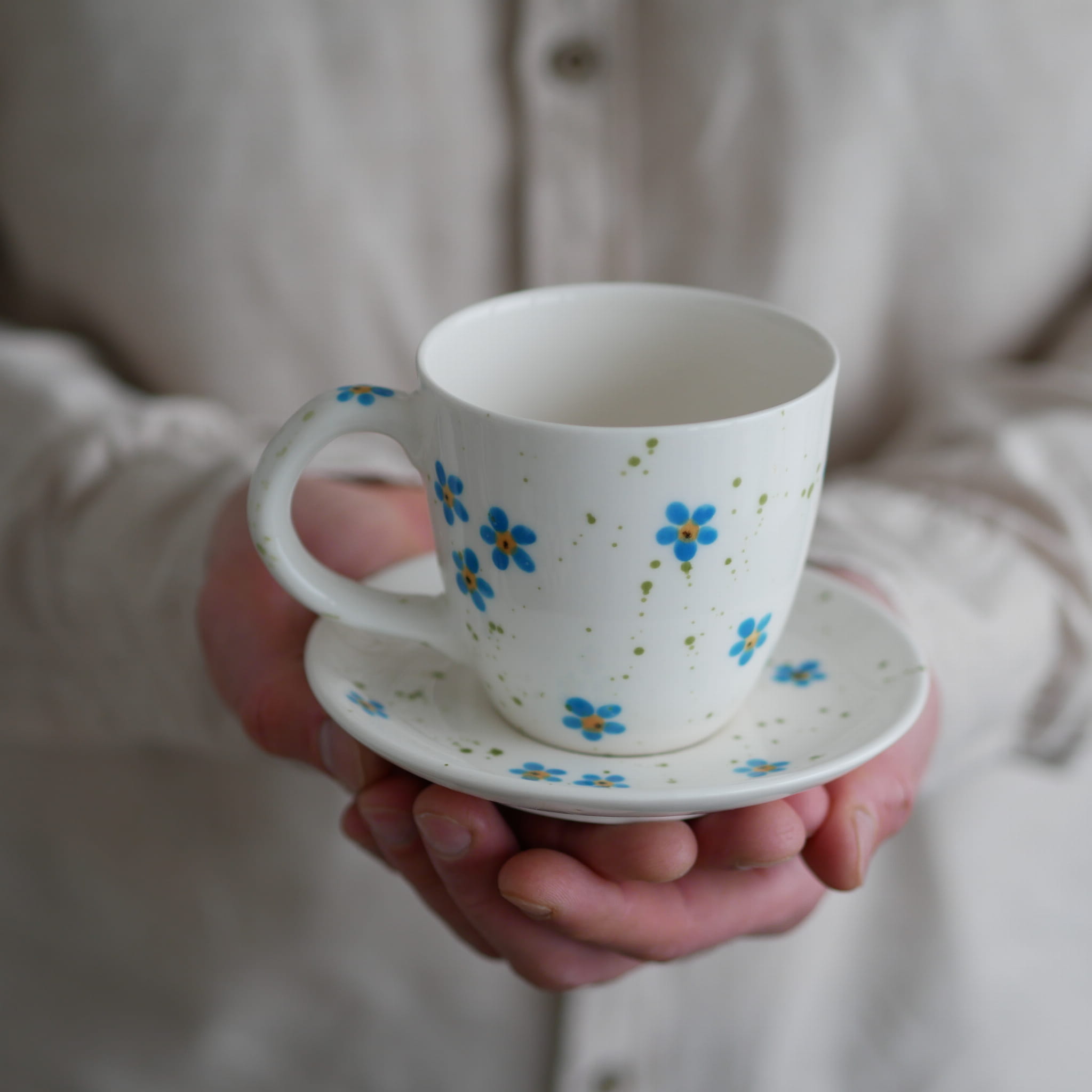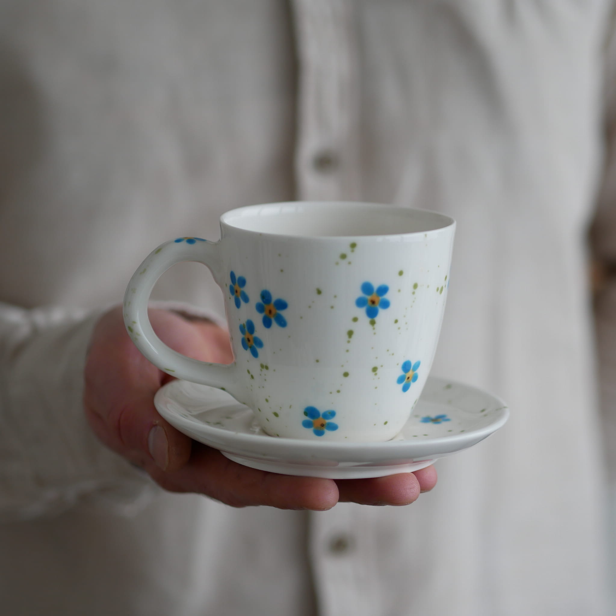 Kubek 220ml niezapominajki z białym uszkiem + talerzyk 12,5cm