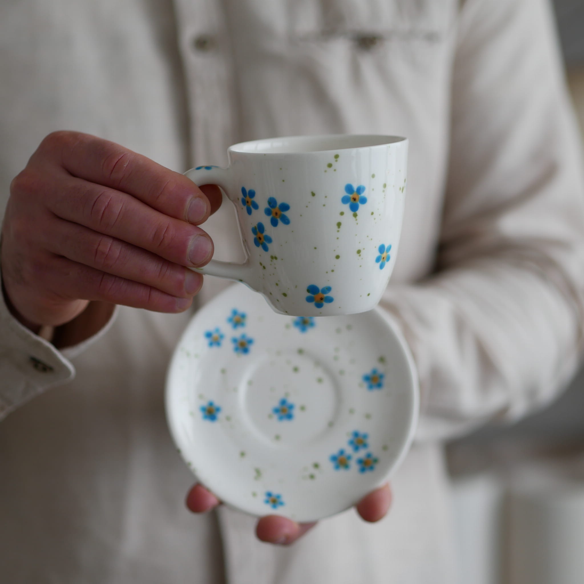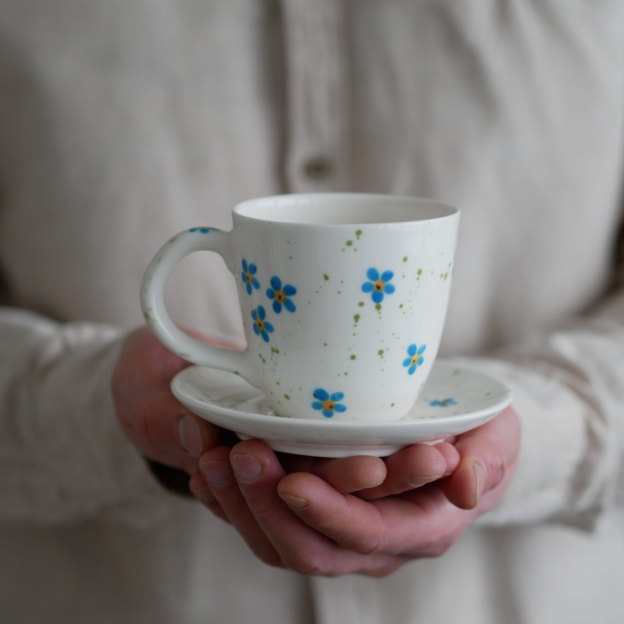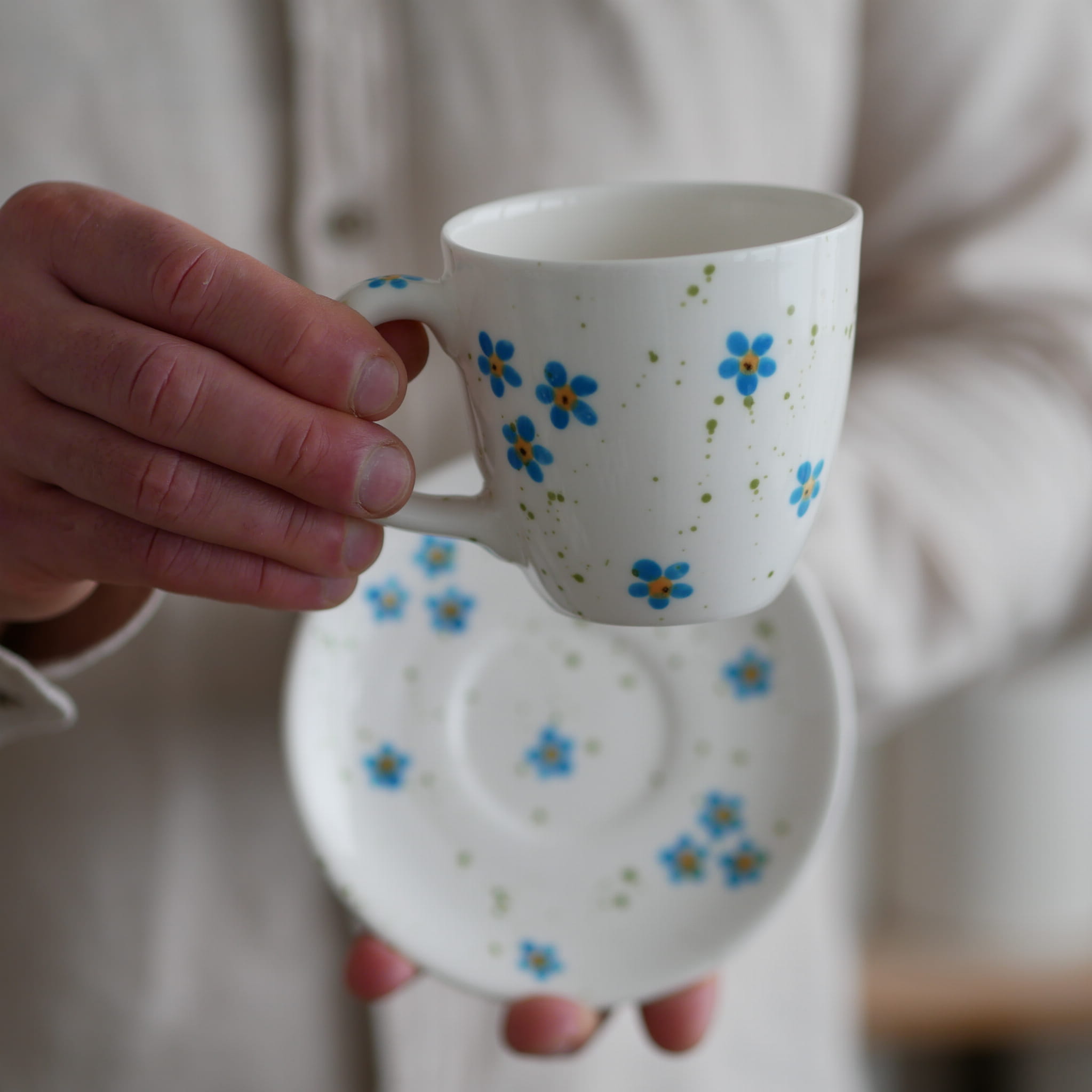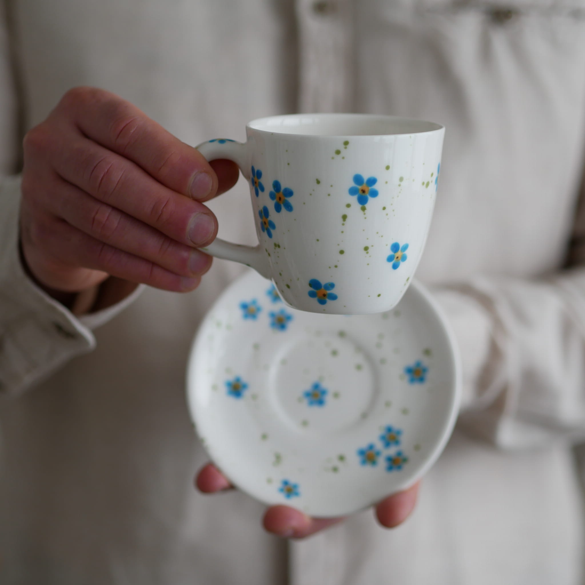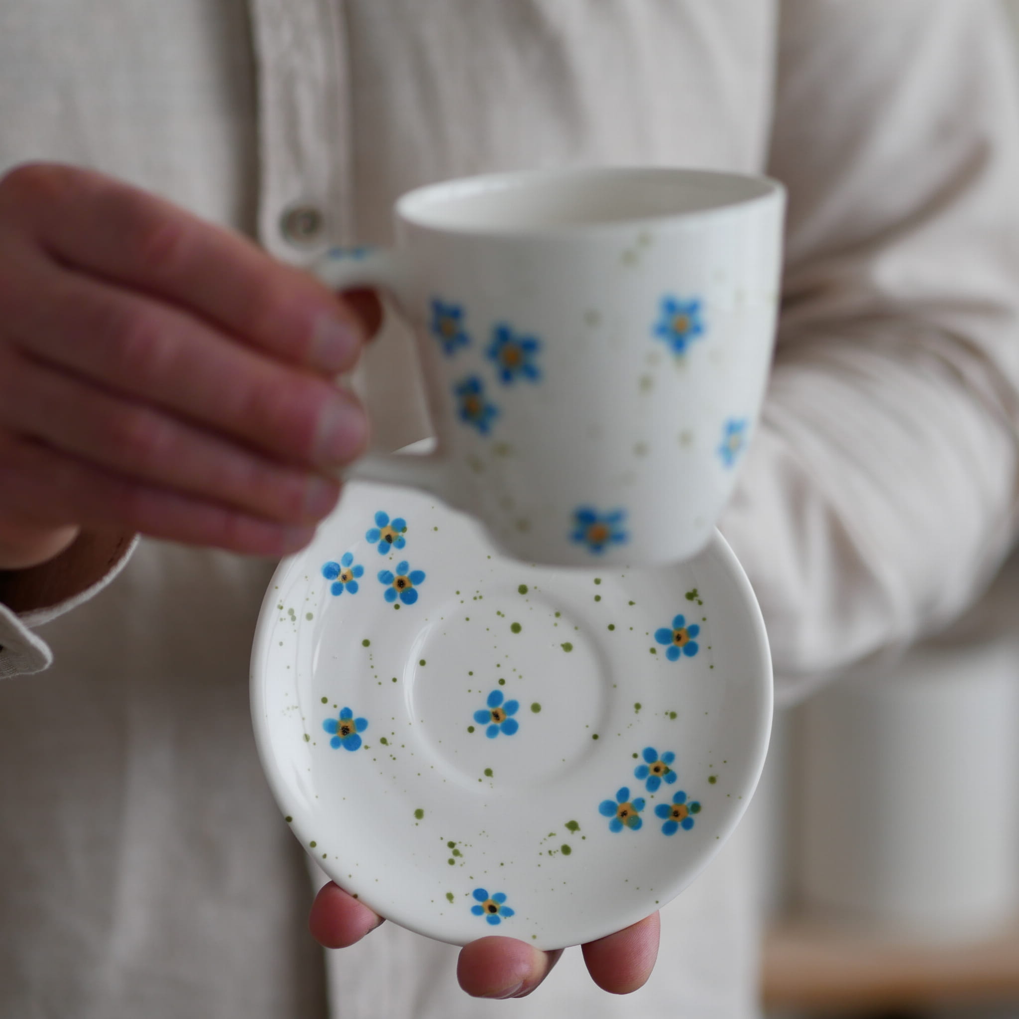 Zestaw : kubek + talerzyk z pięknymi niezapominajkami.