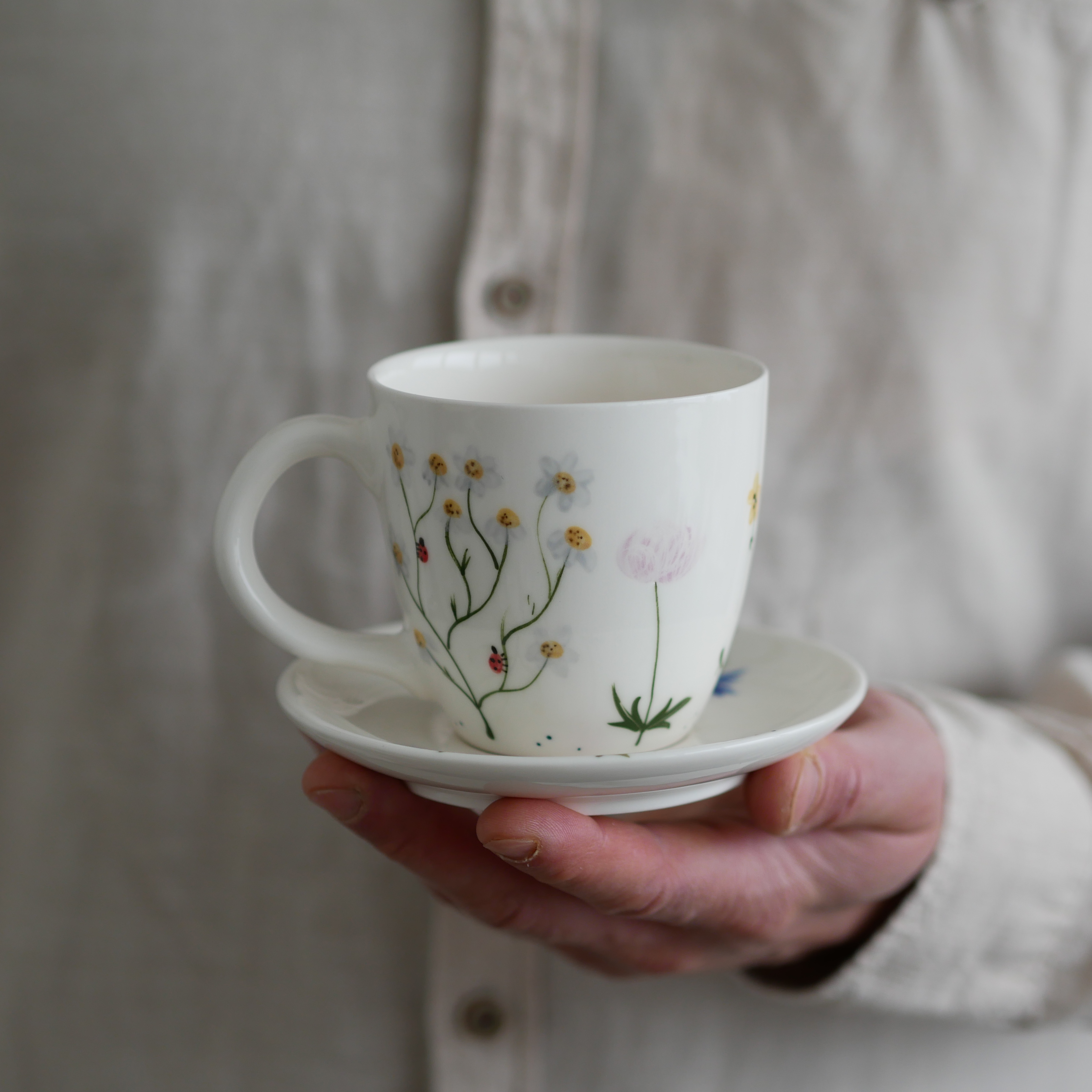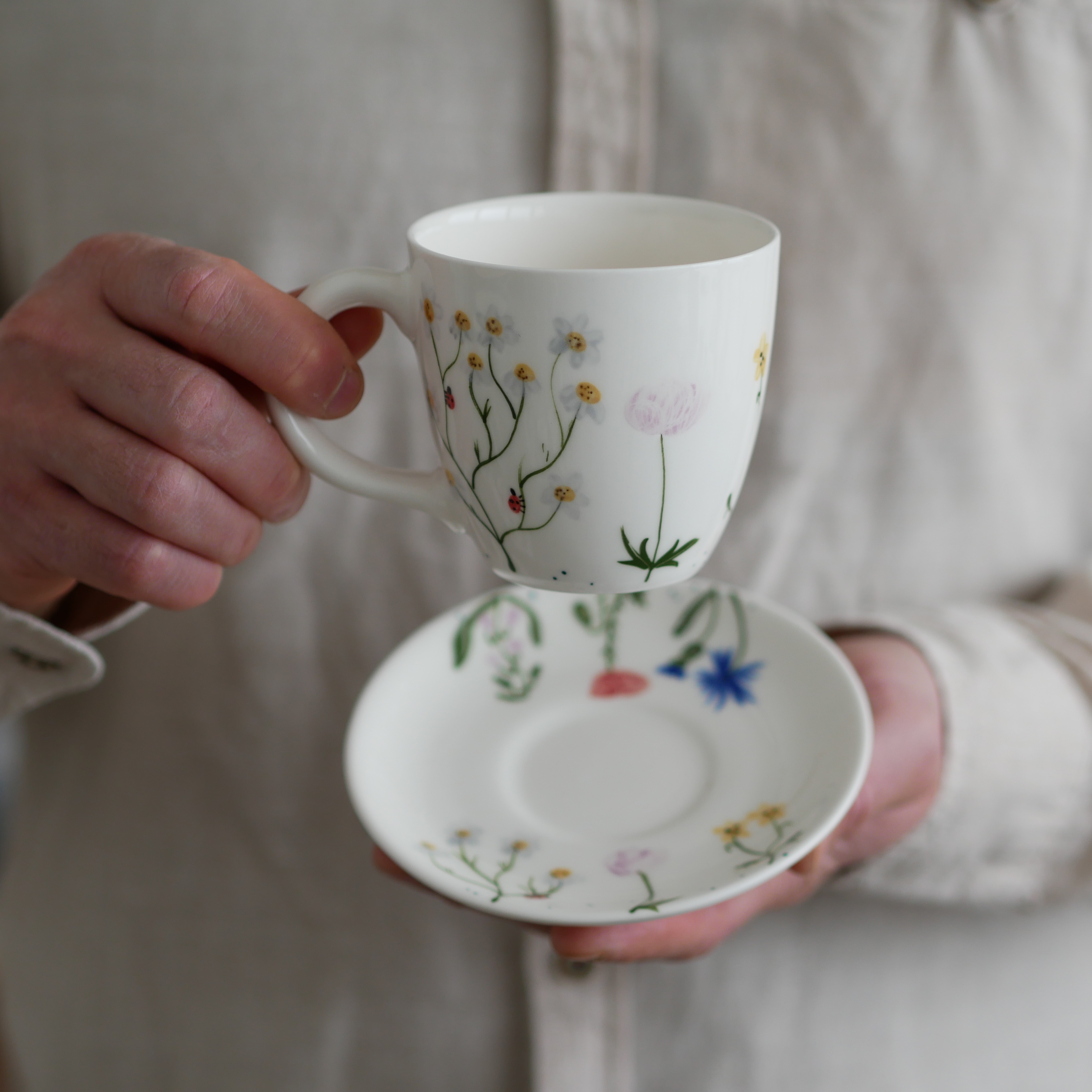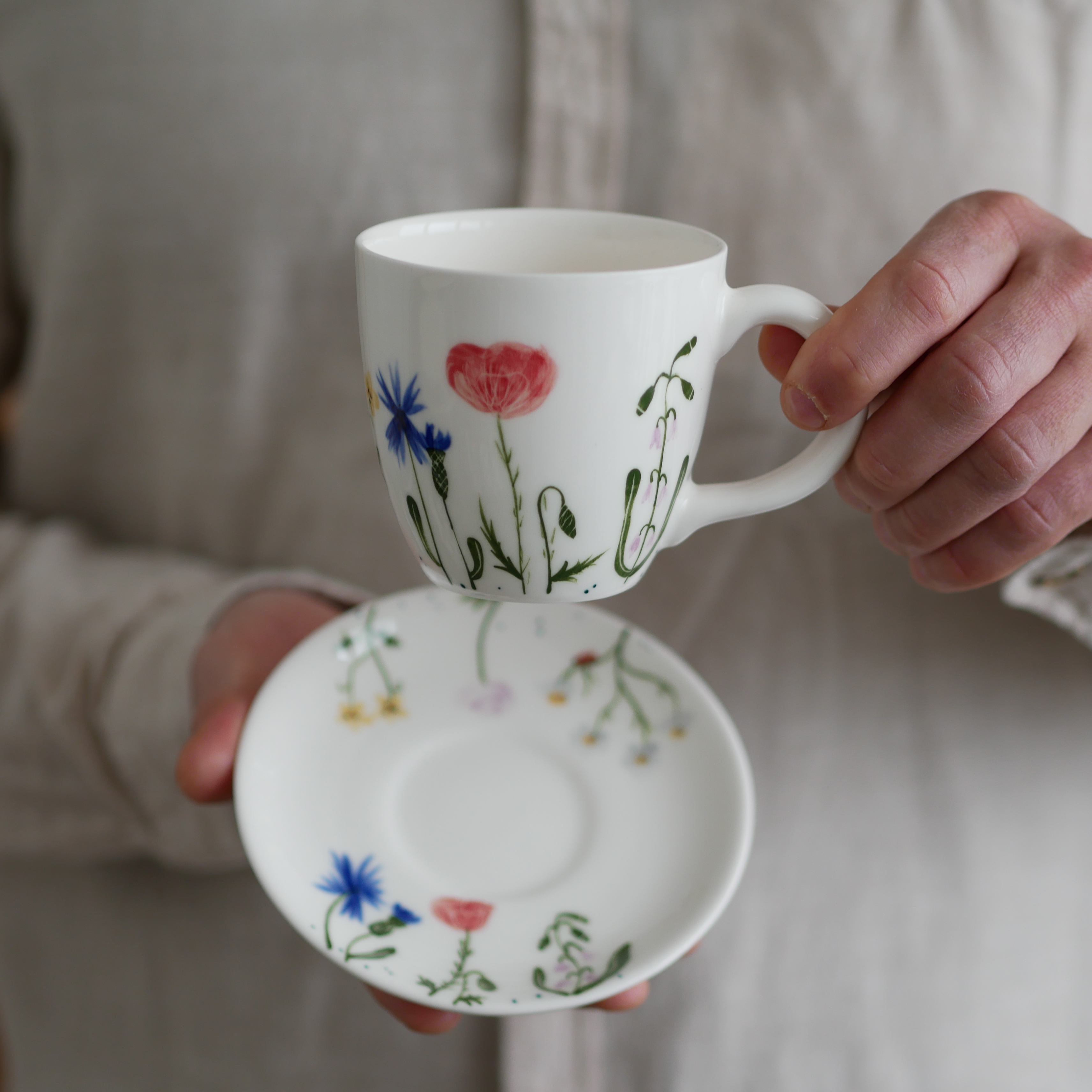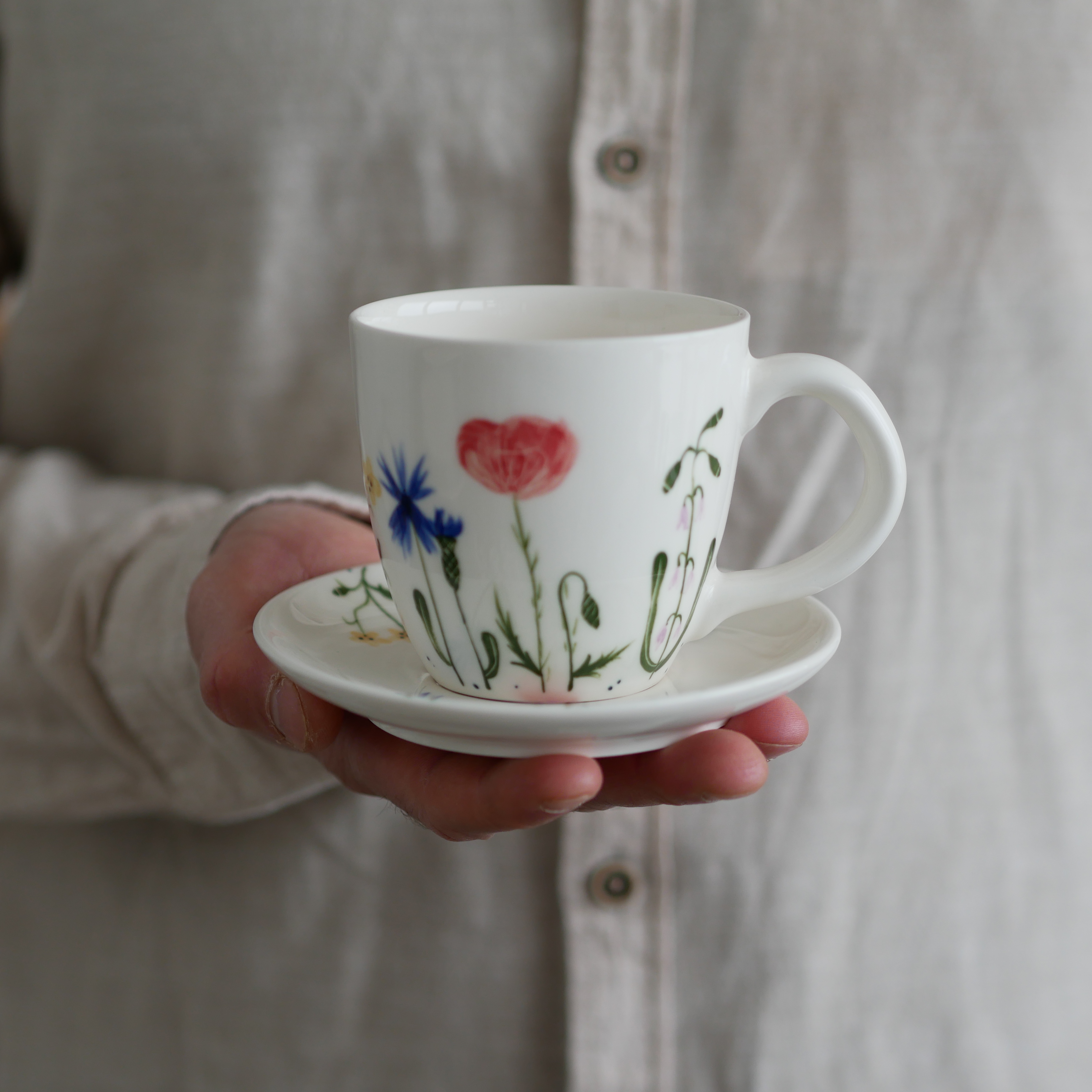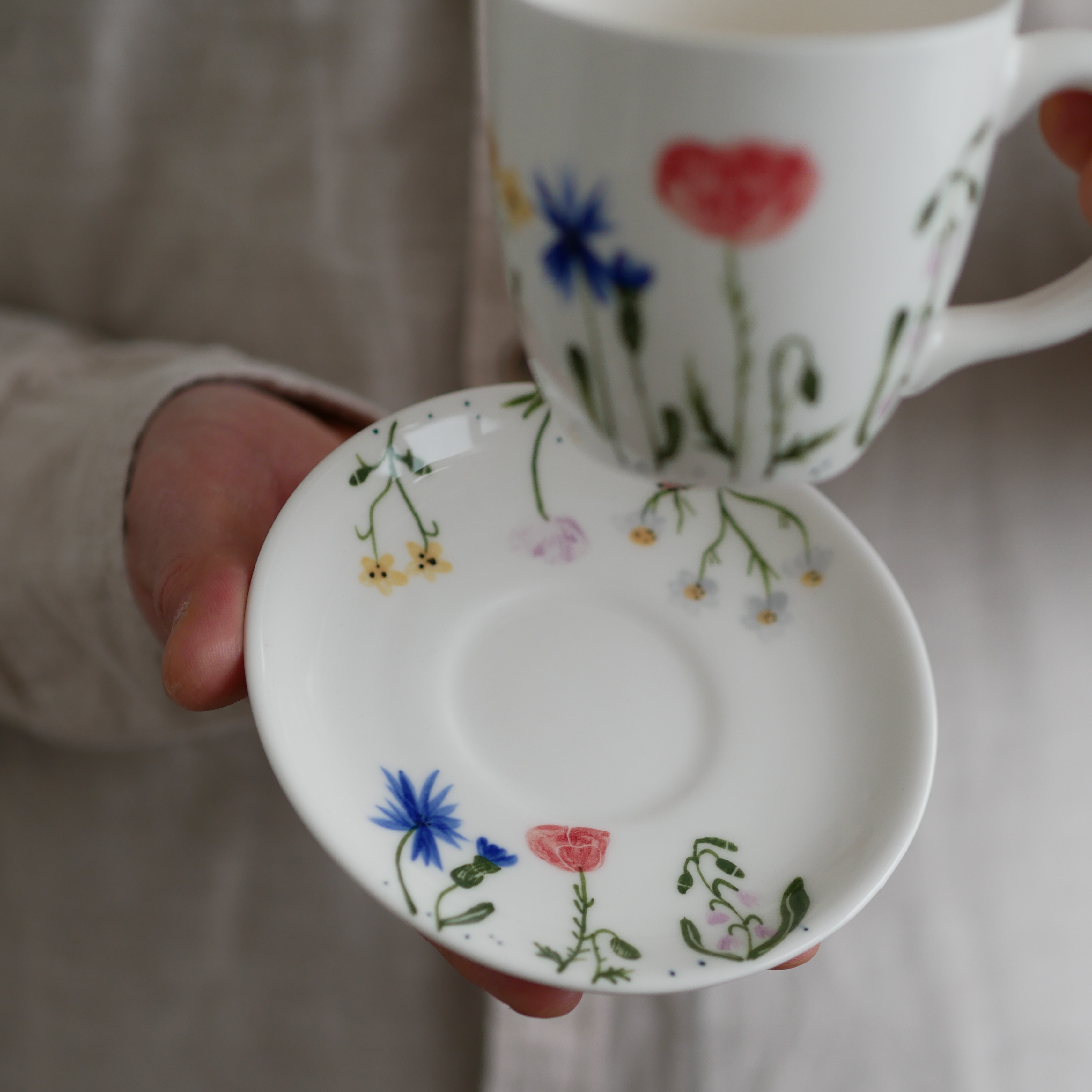 Kubek 220ml polne kwiaty z białym uszkiem + talerzyk 12,5cm