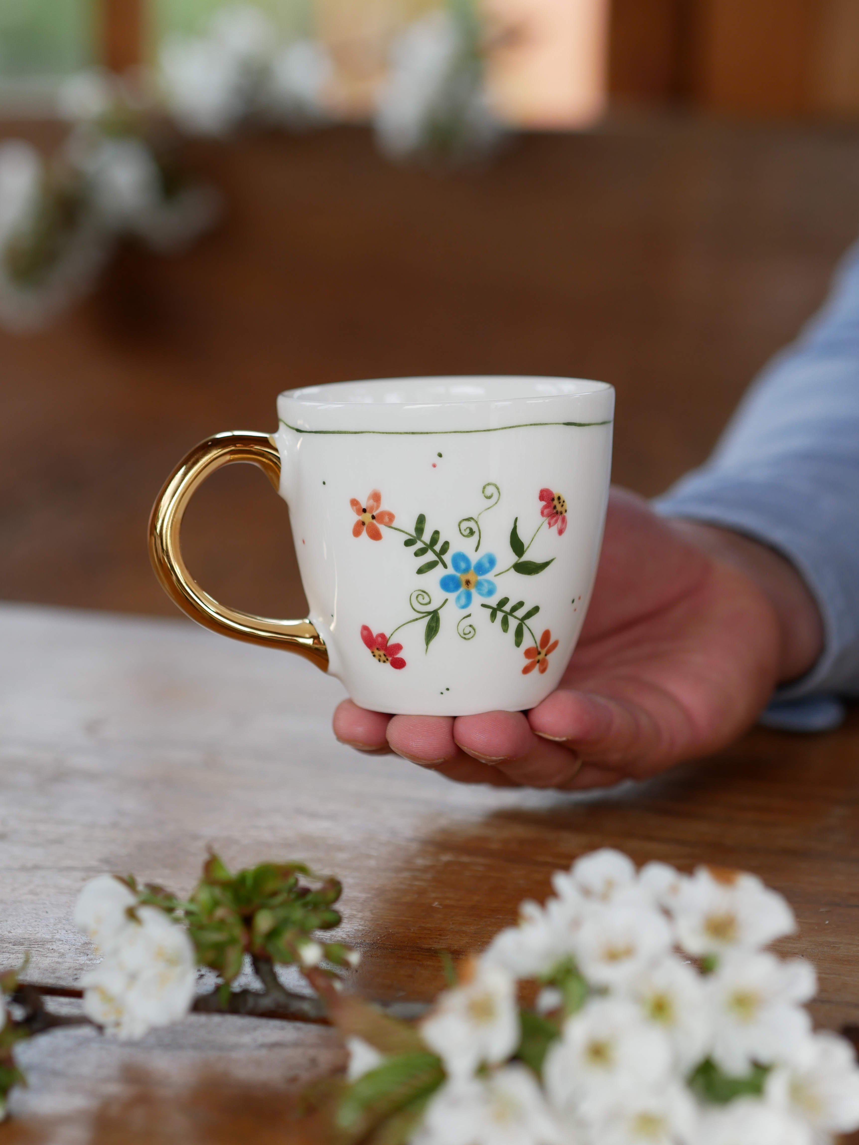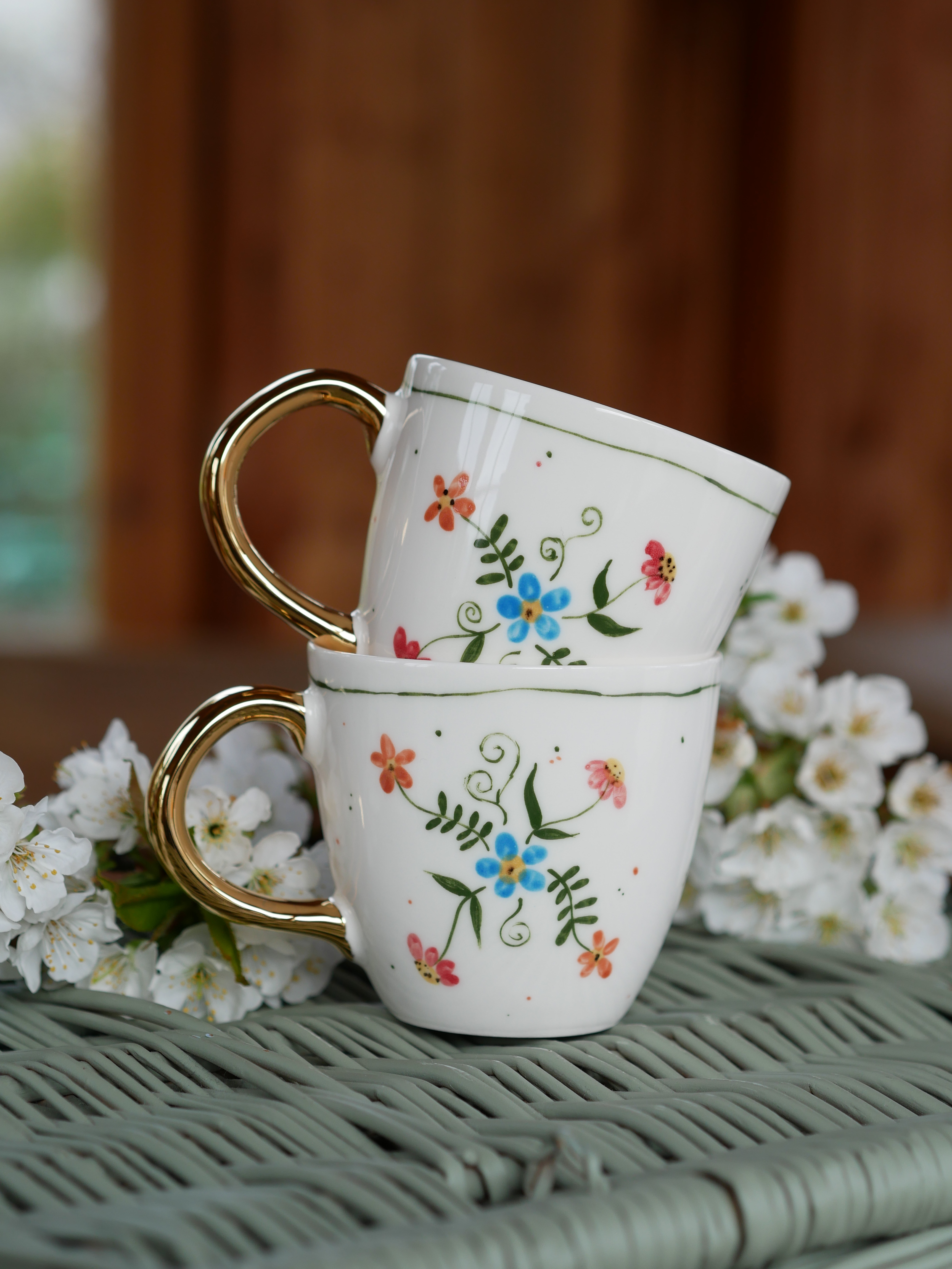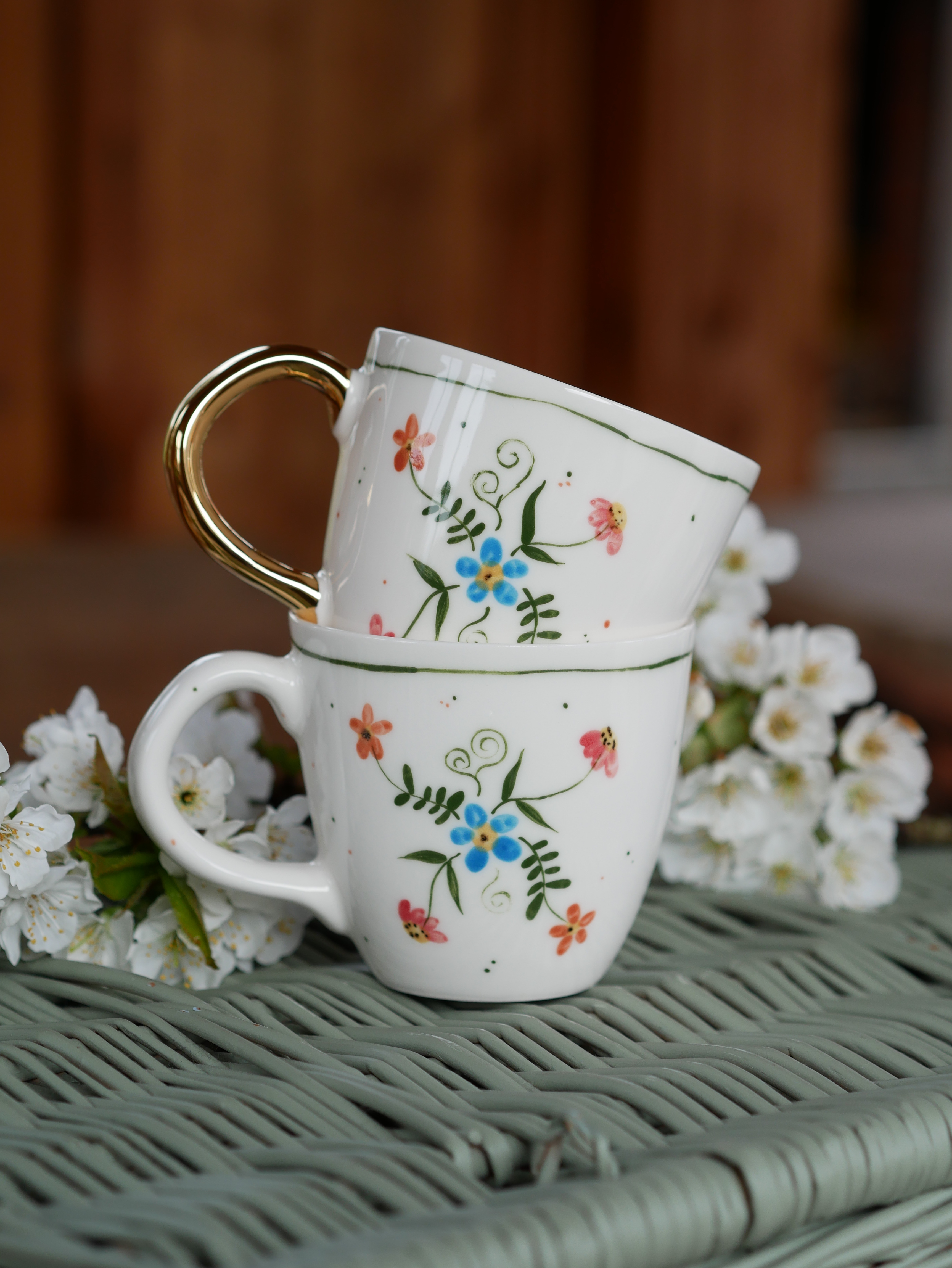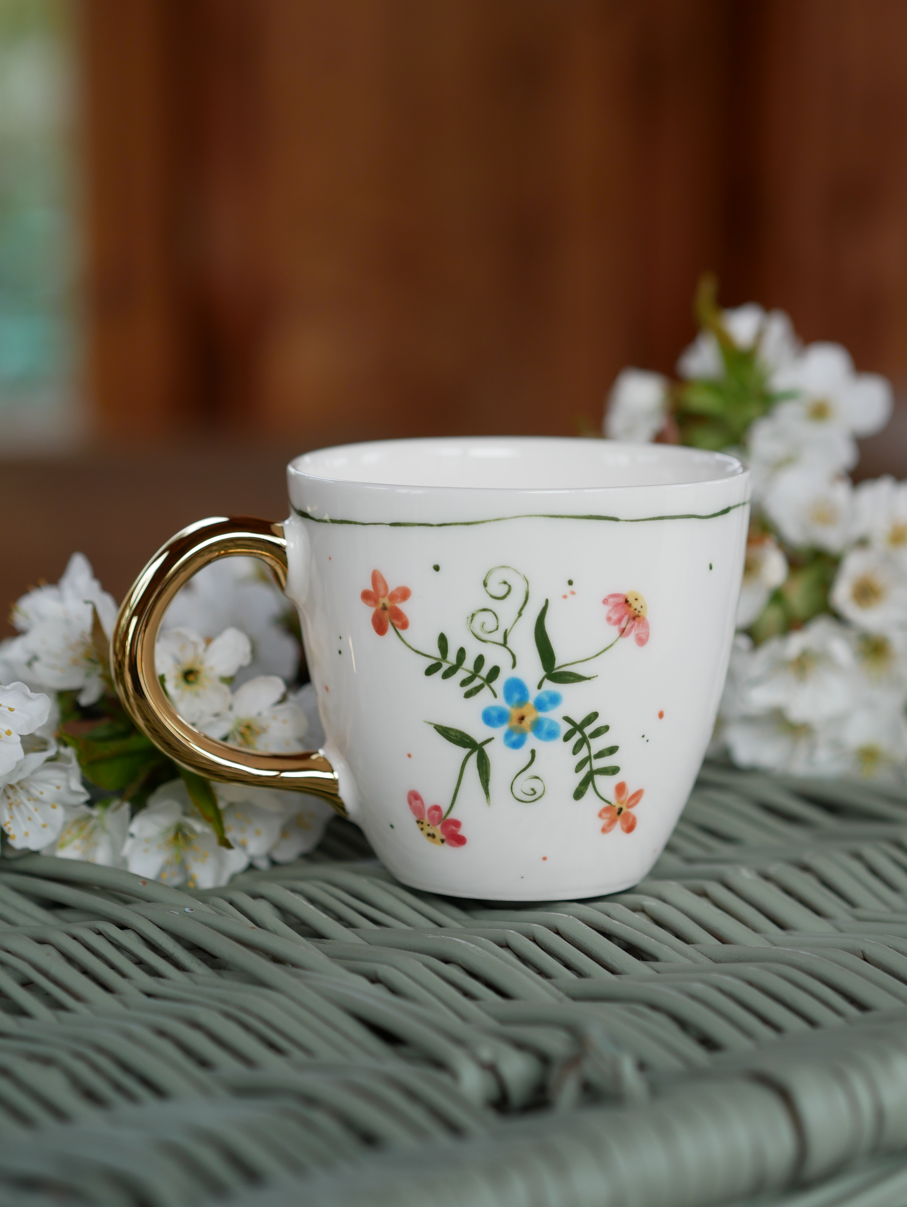 Kwiaty maluję ręcznie, dlatego na każdym kubku wzór będzie wyglądać inaczej - zdjęcie poglądowe.
