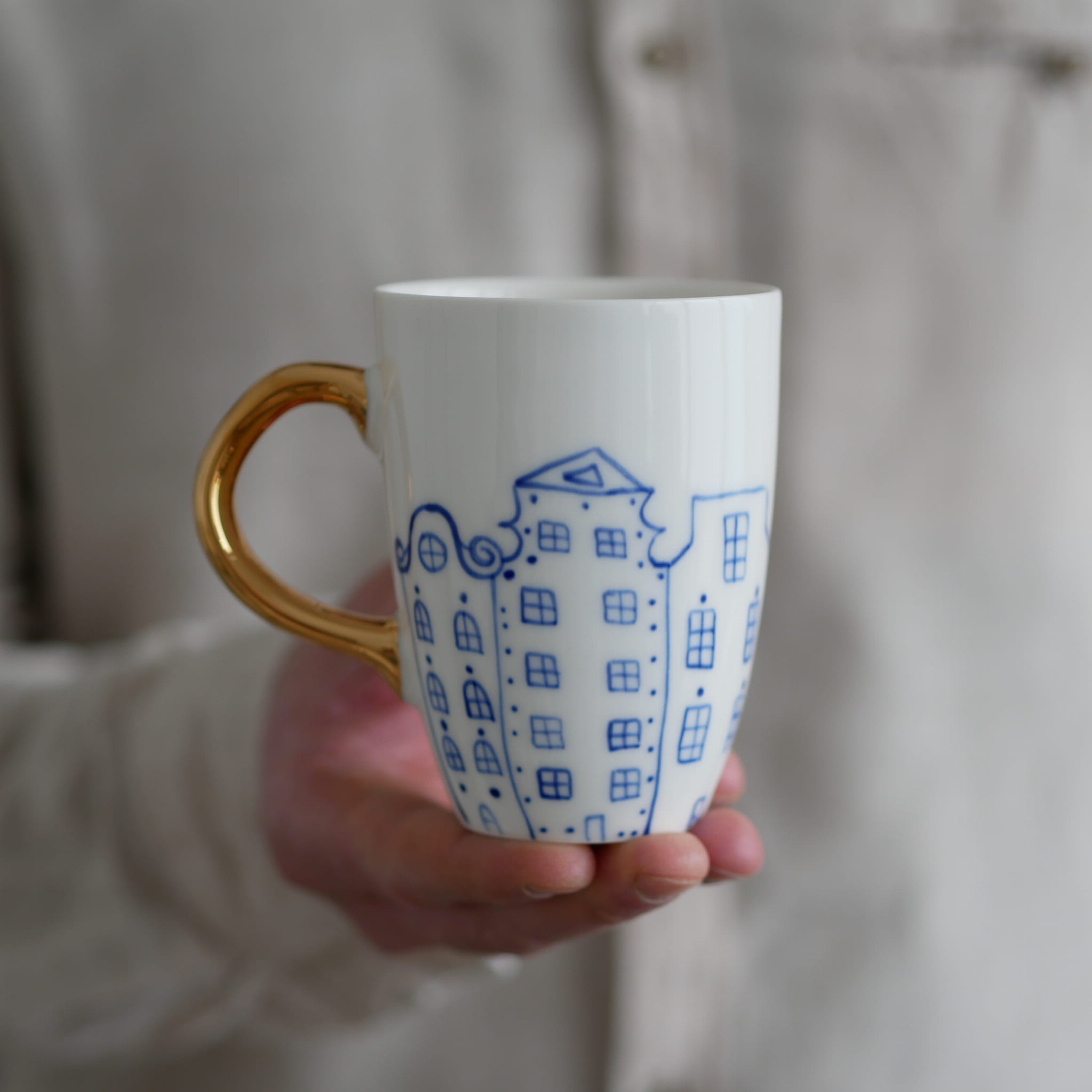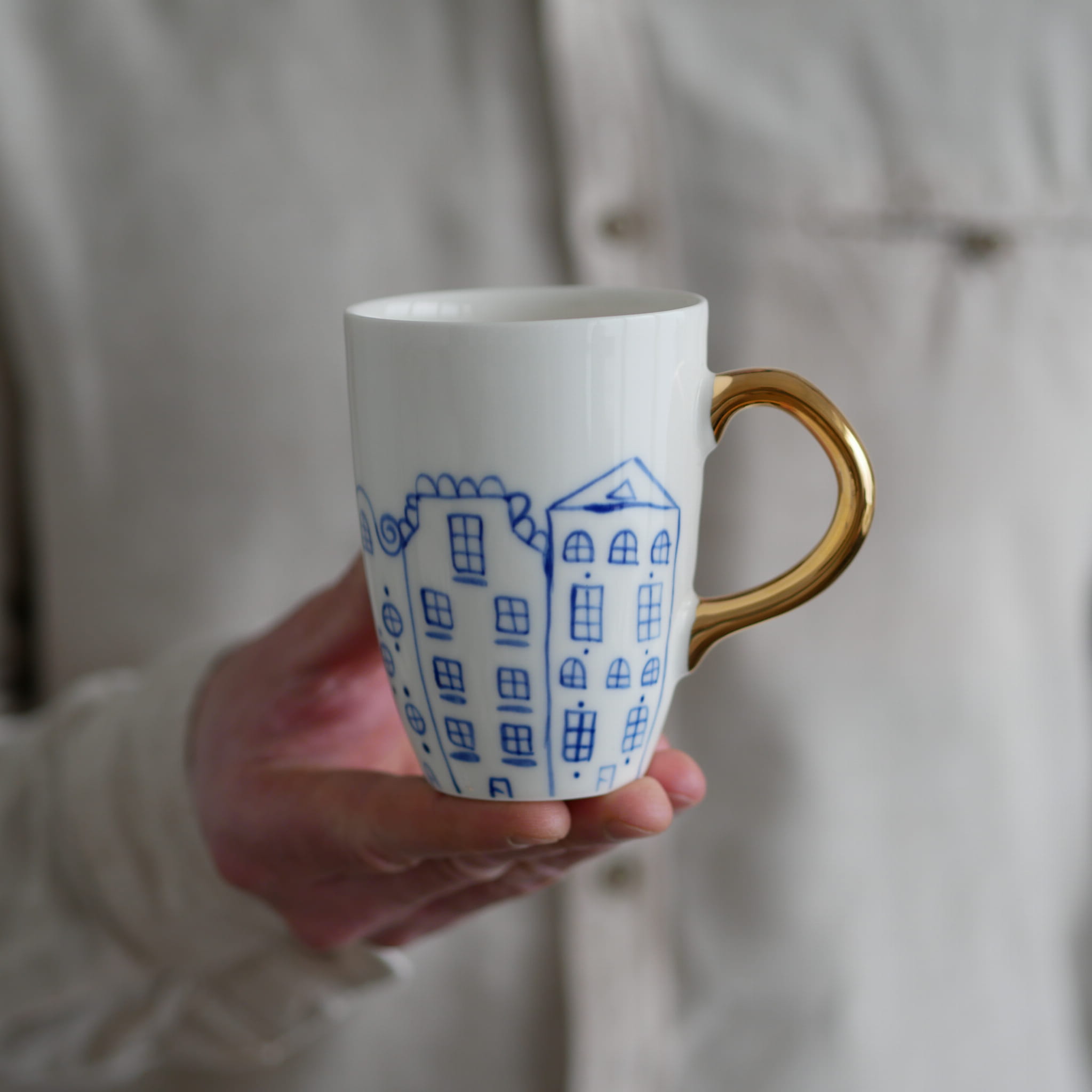 Kubek w kobaltowe kamienice ze złotym uszkiem.