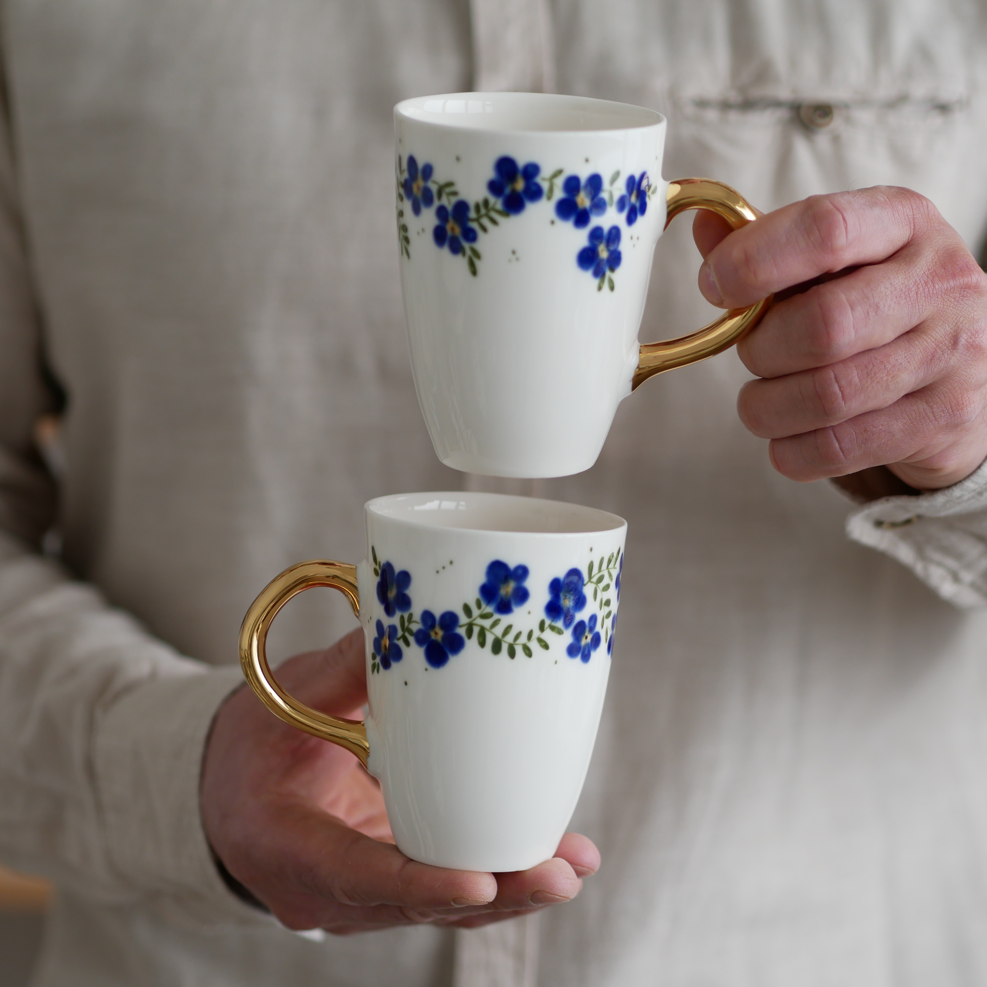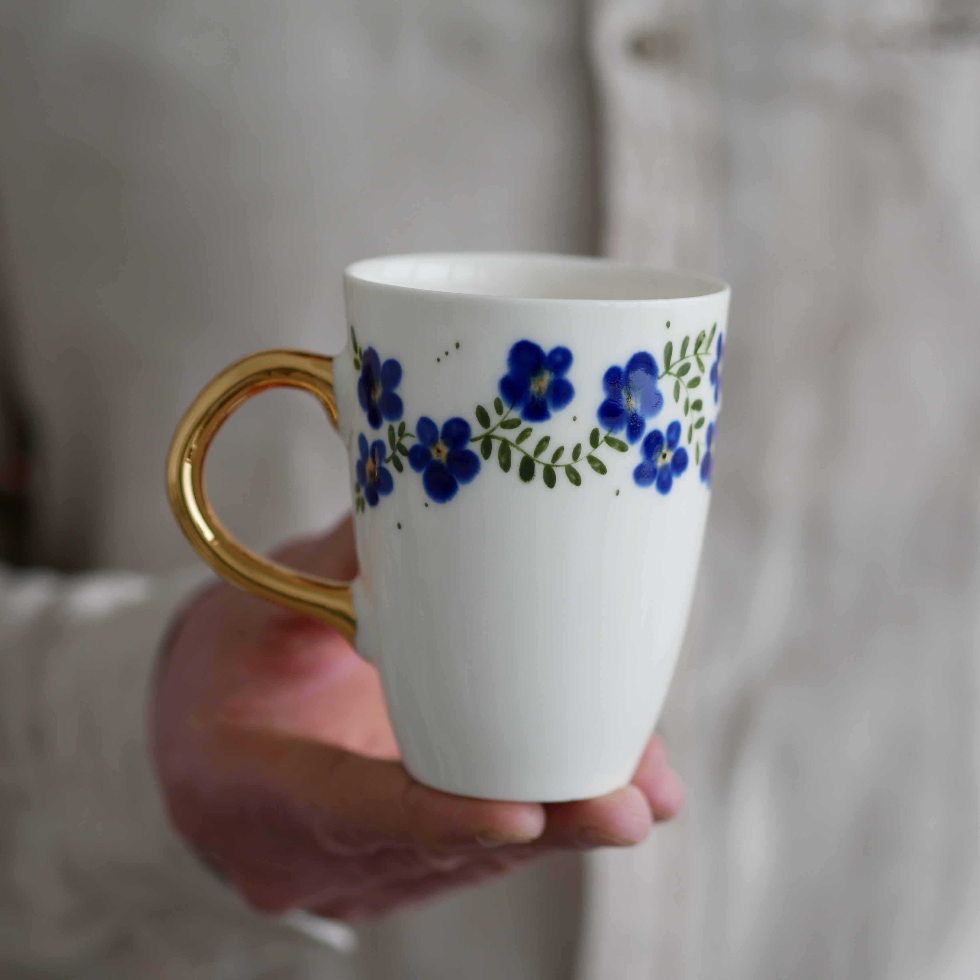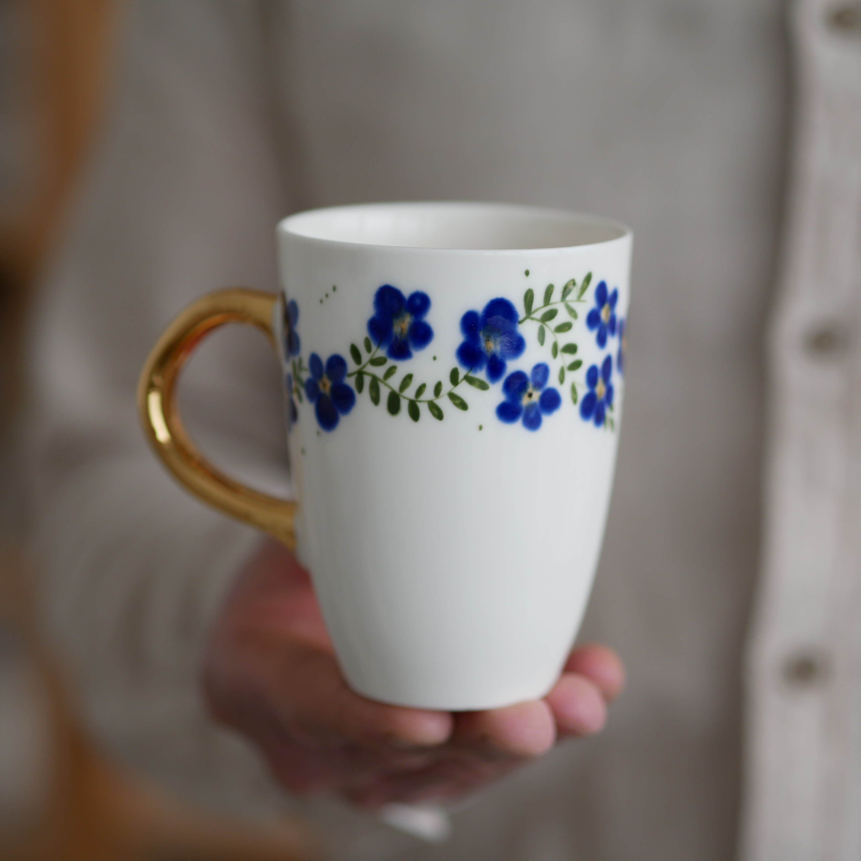 Kubek 250ml kwiaty wiejskie kobaltowe ze złotym uszkiem
