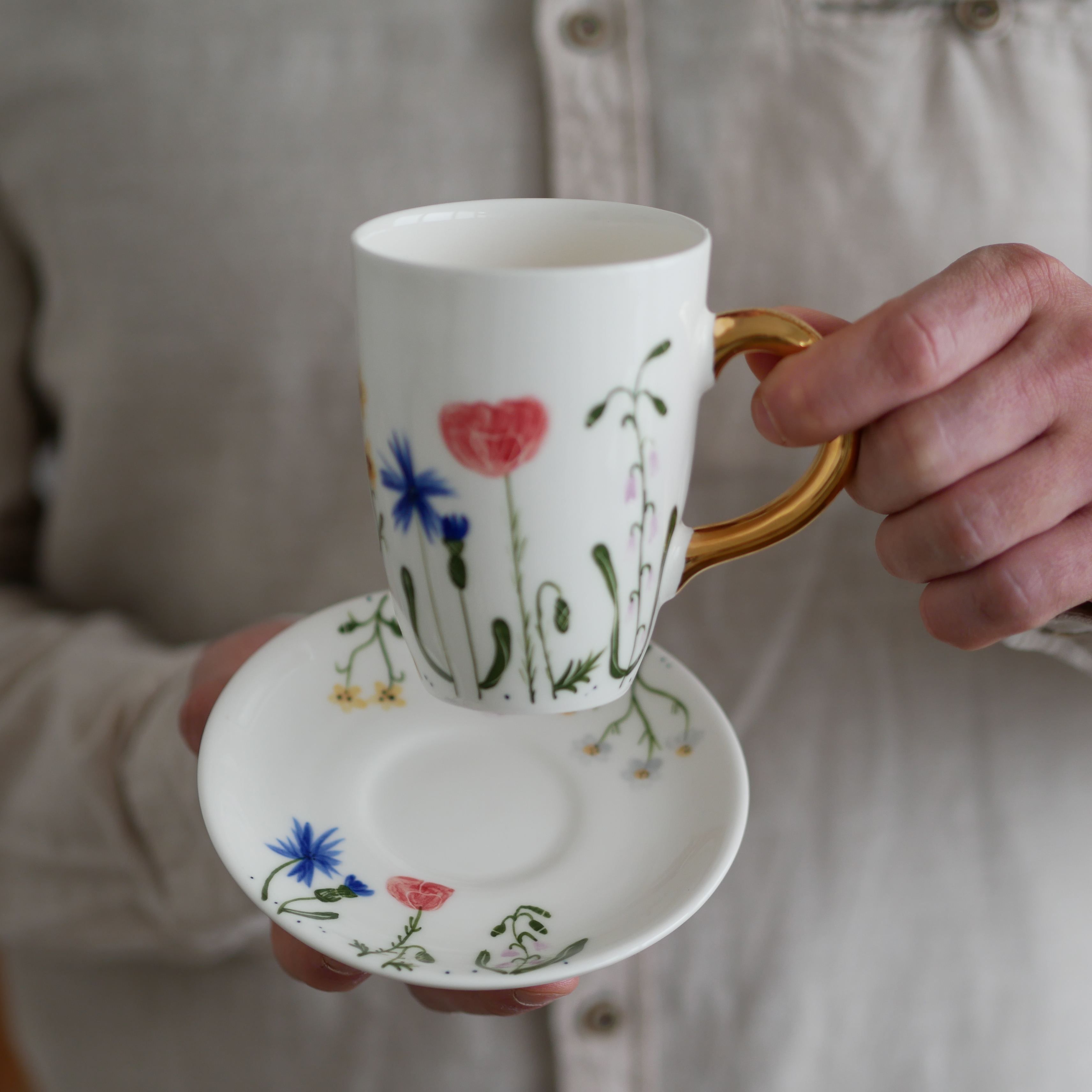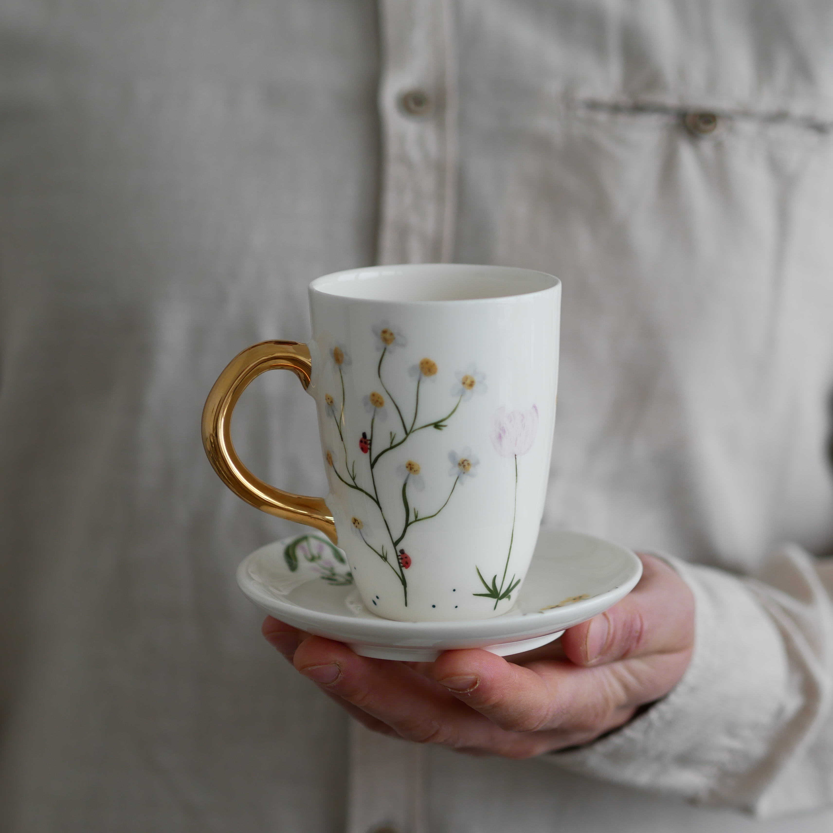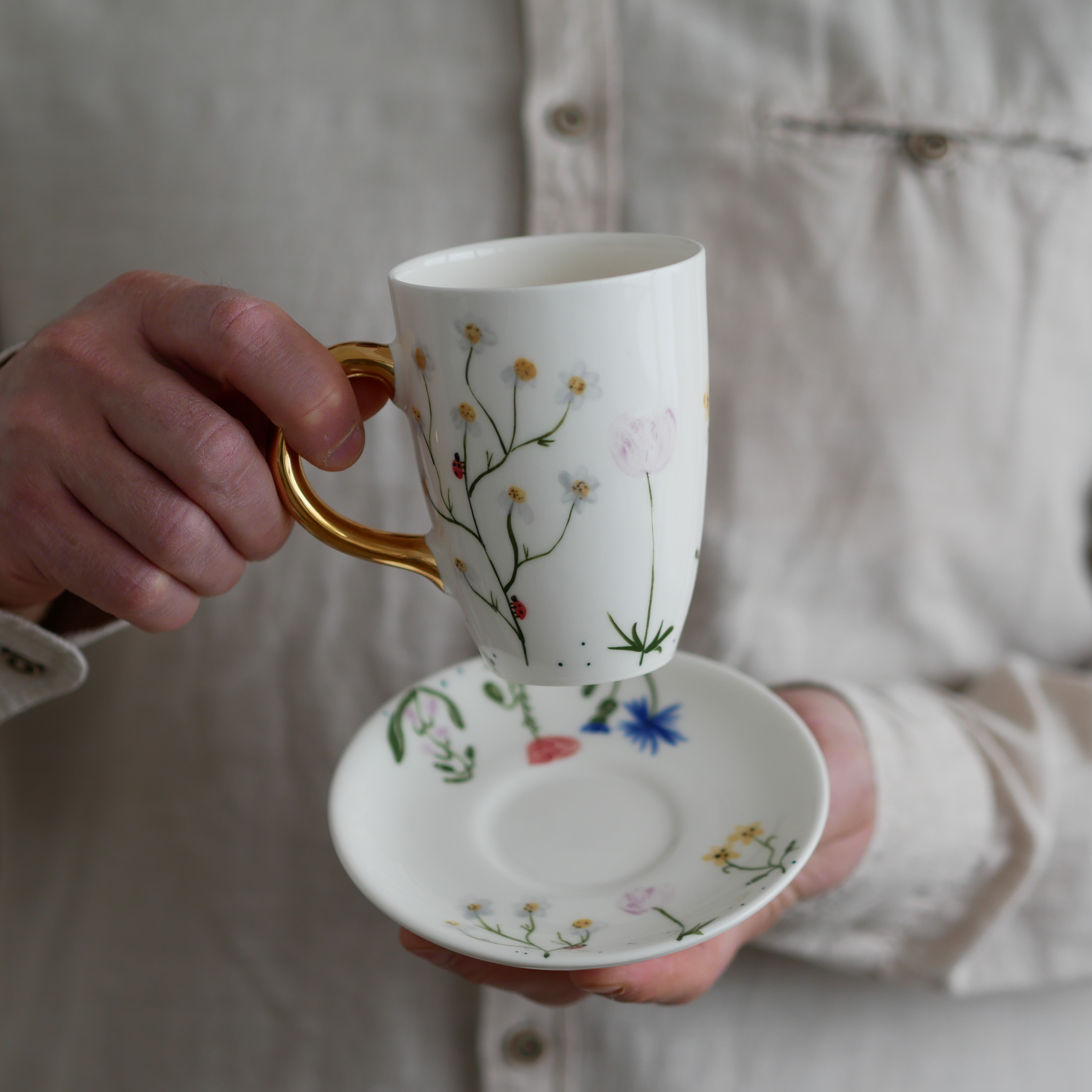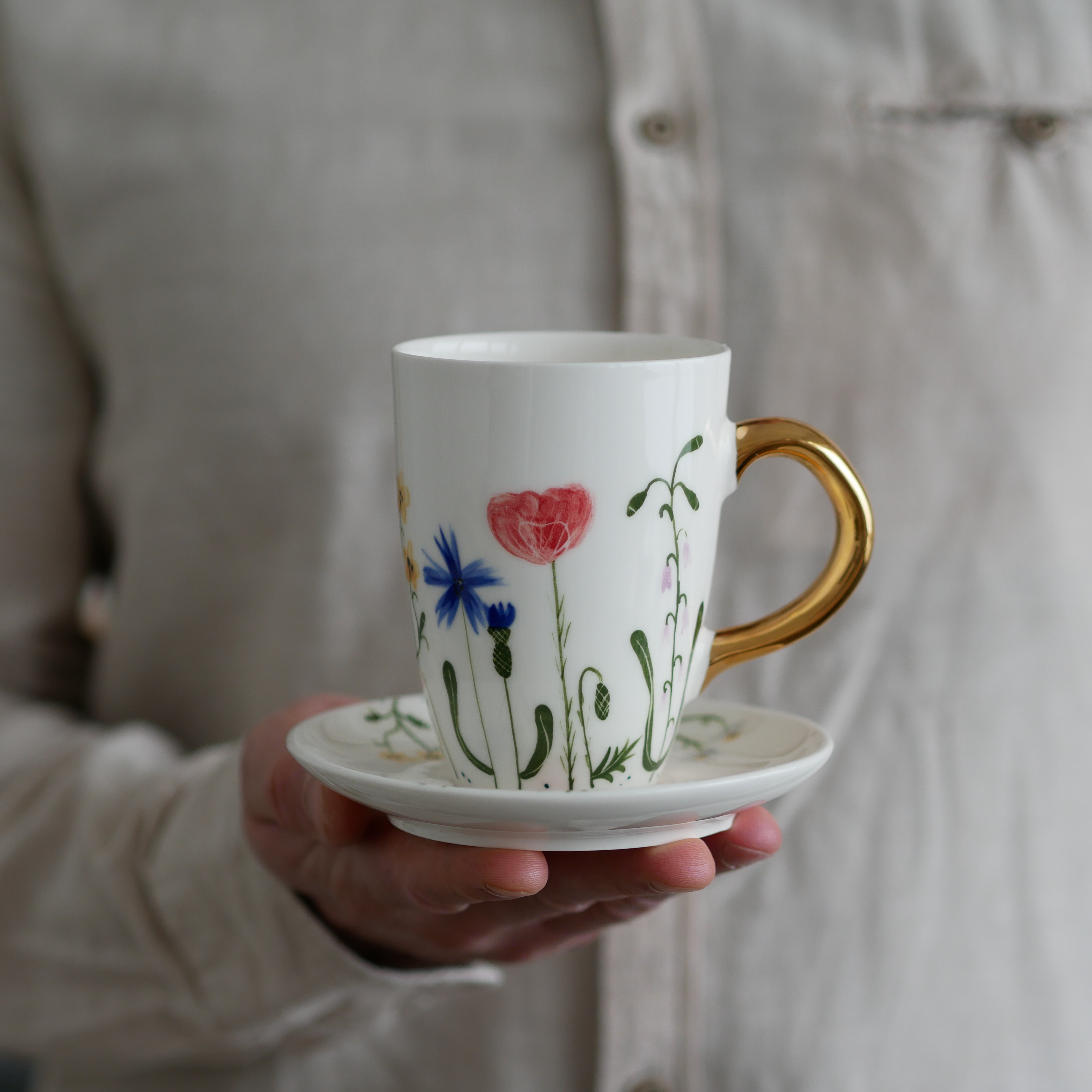 Kubek 250ml polne kwiaty ze złotym uszkiem + talerzyk 12,5cm
