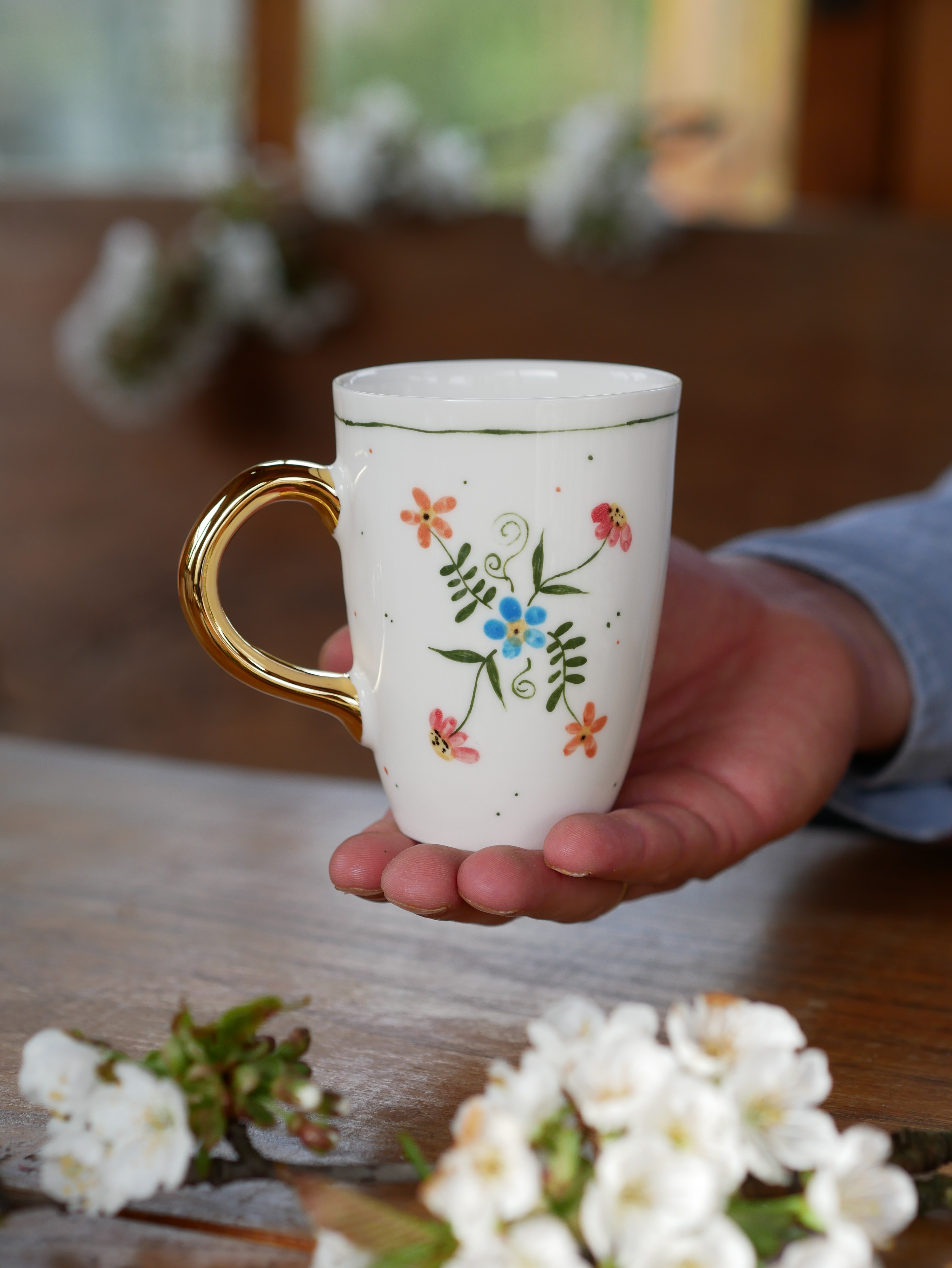 Kwiaty maluję ręcznie, dlatego na każdym kubku wzór będzie wyglądać inaczej - zdjęcie poglądowe.