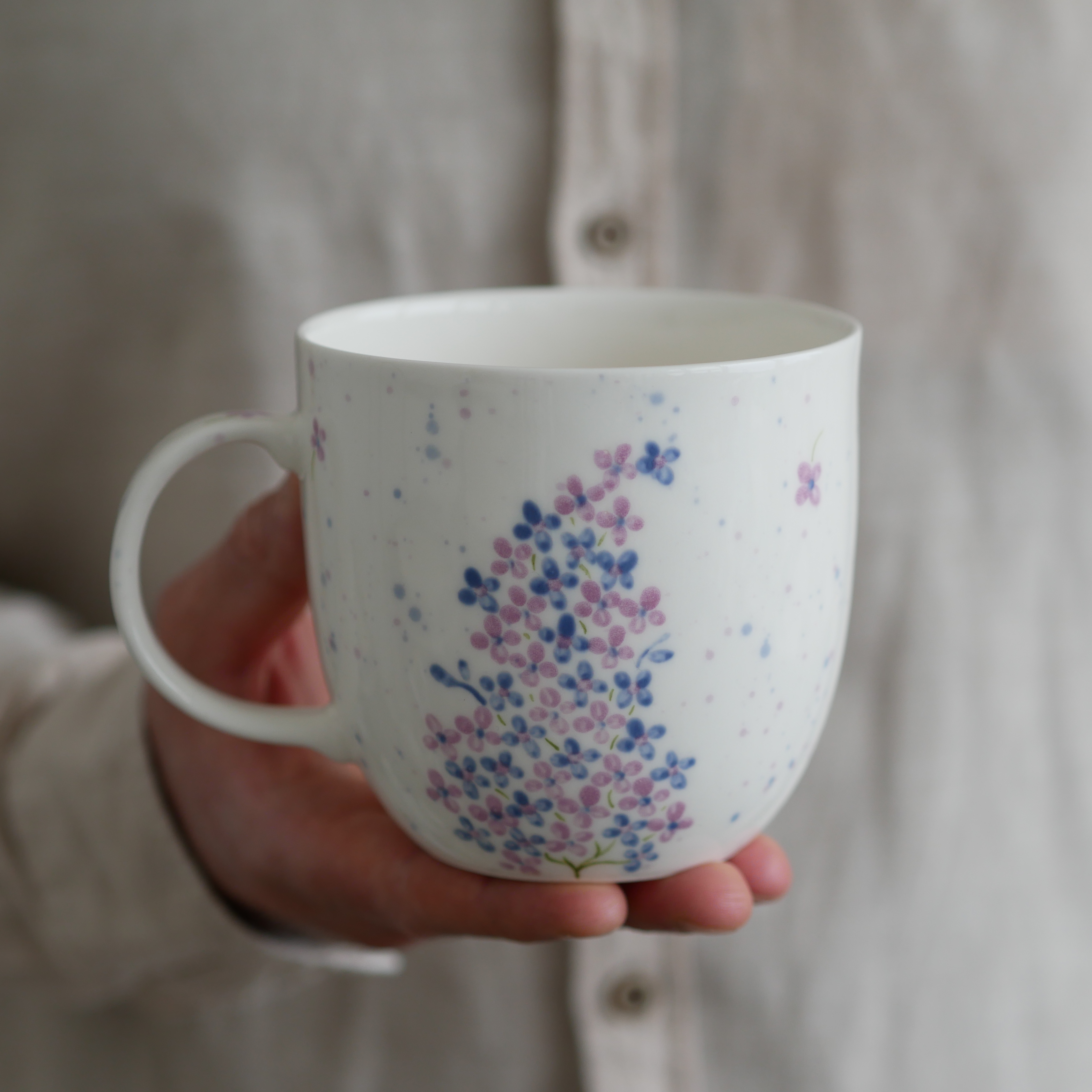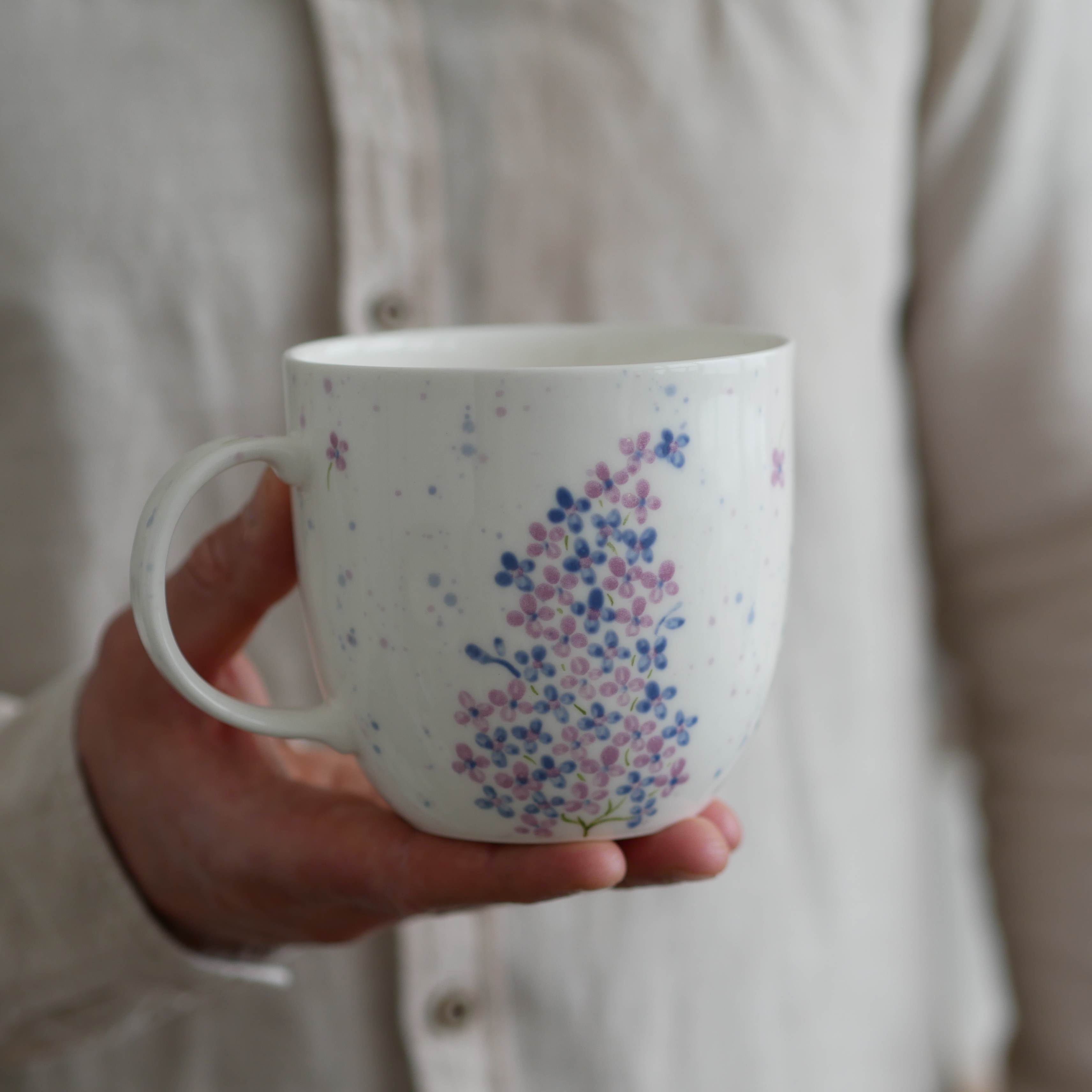 Kwiaty maluję ręcznie, dlatego na każdym kubku wzór będzie wyglądać inaczej - zdjęcie poglądowe.