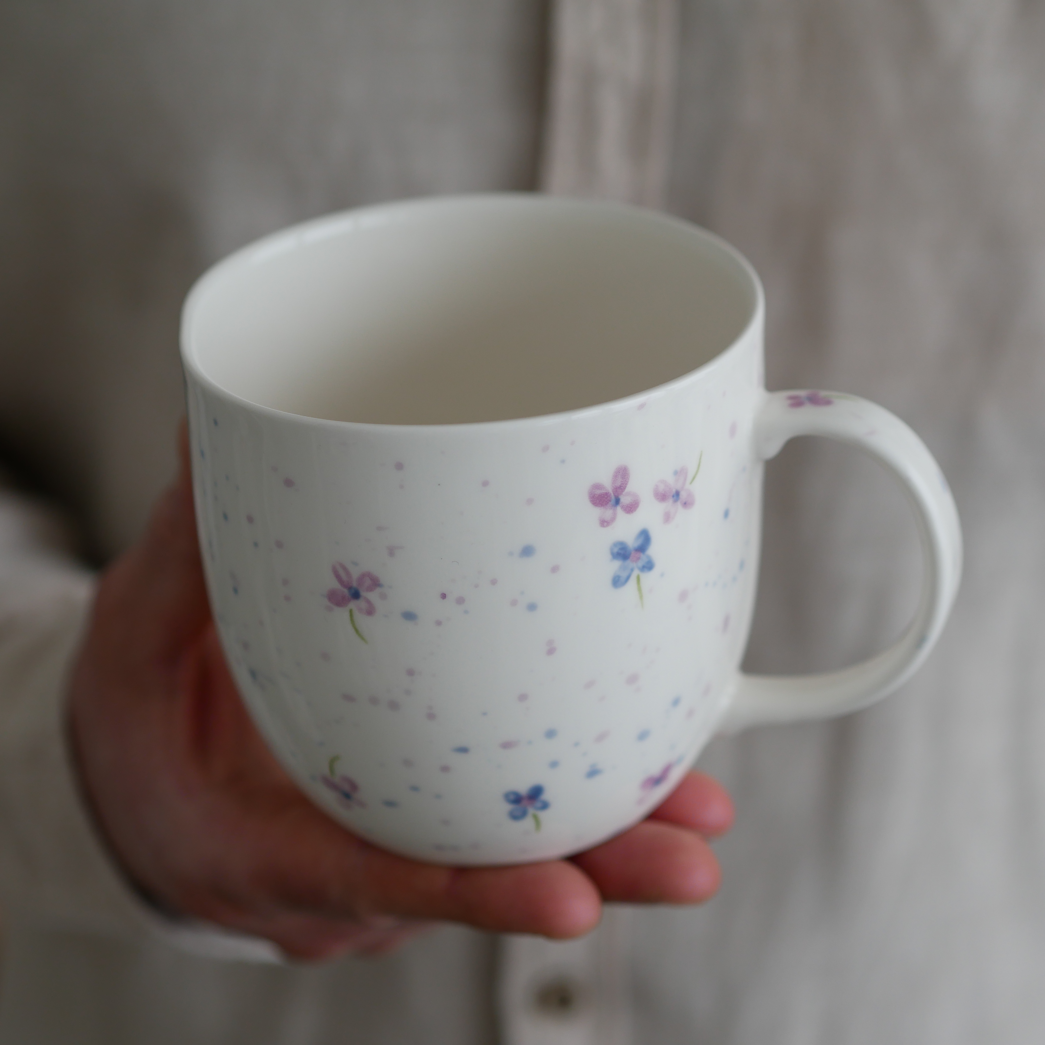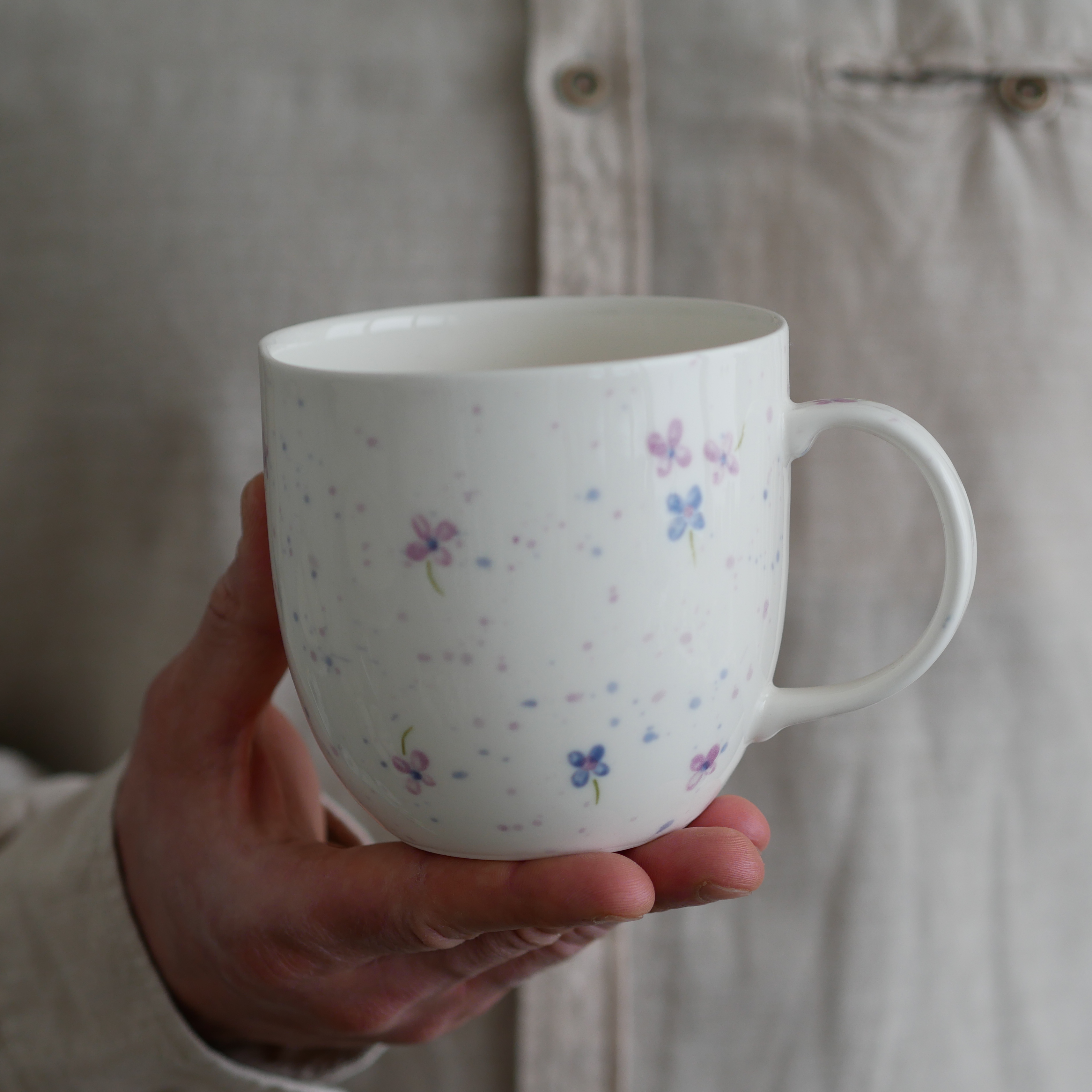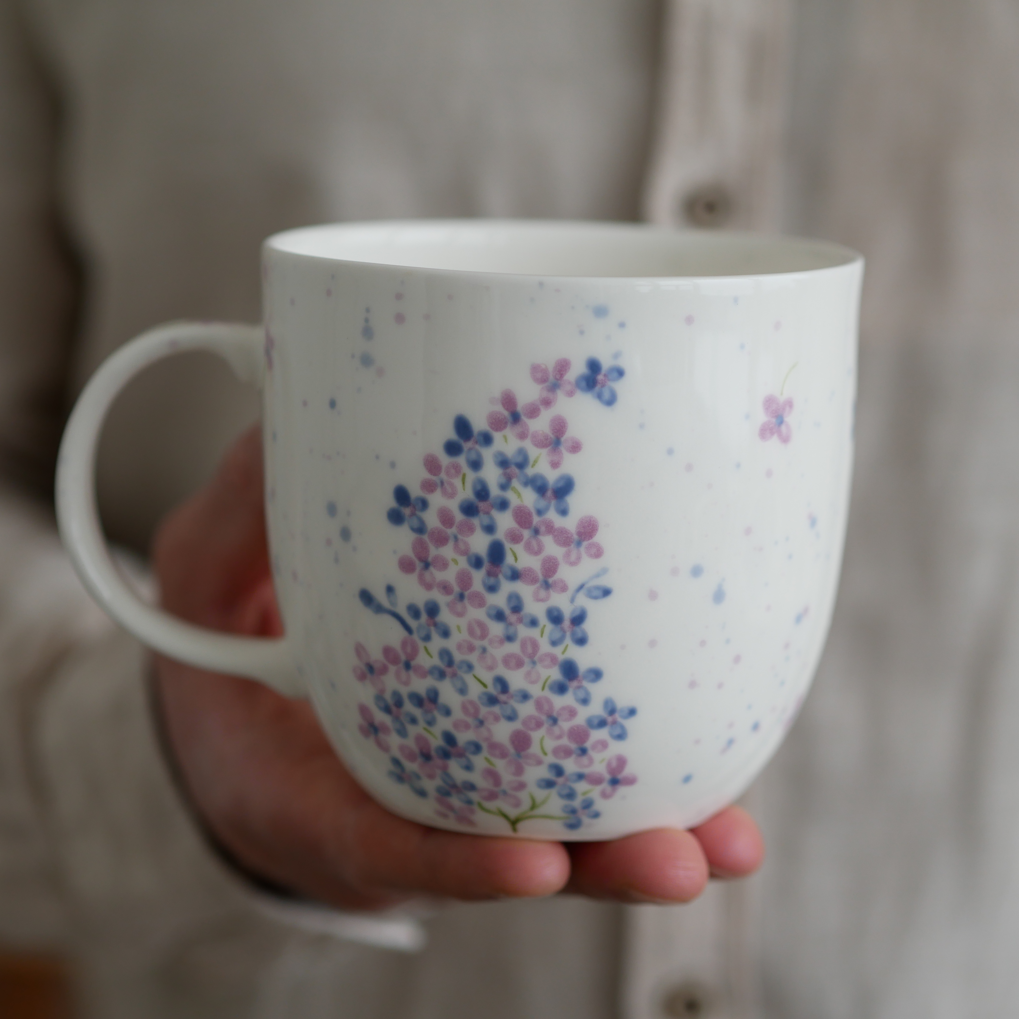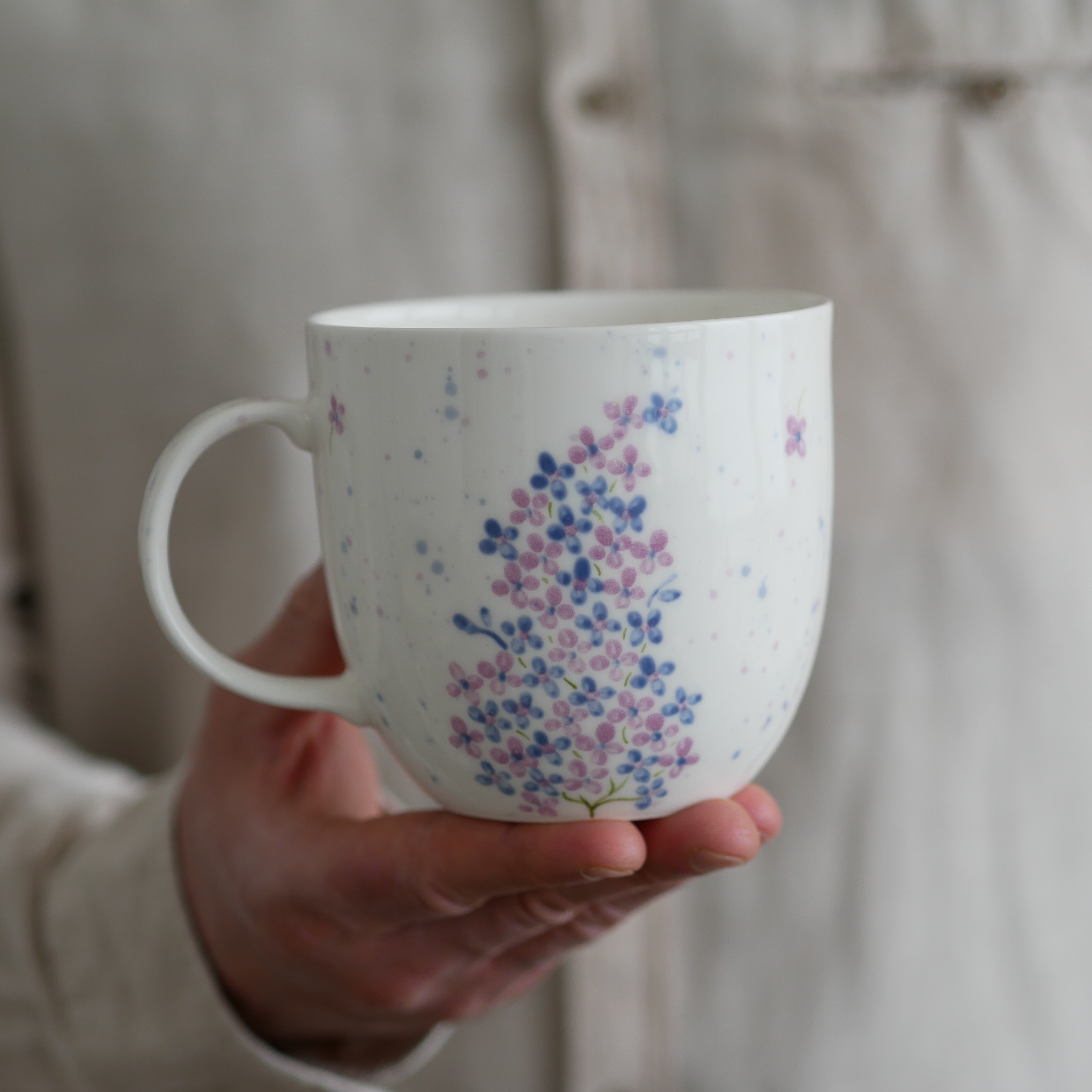 Kubek w fioletowe kwiatuszki.