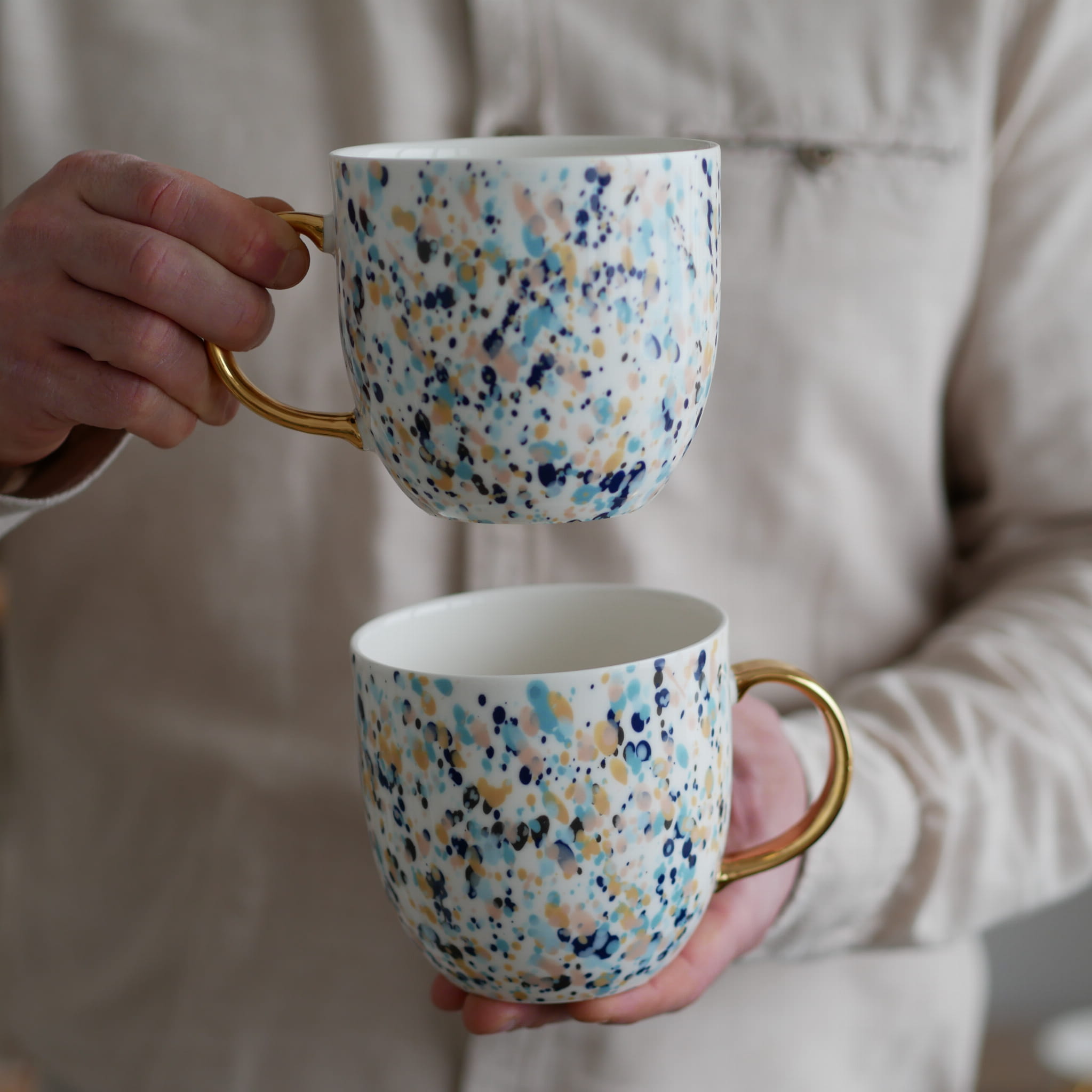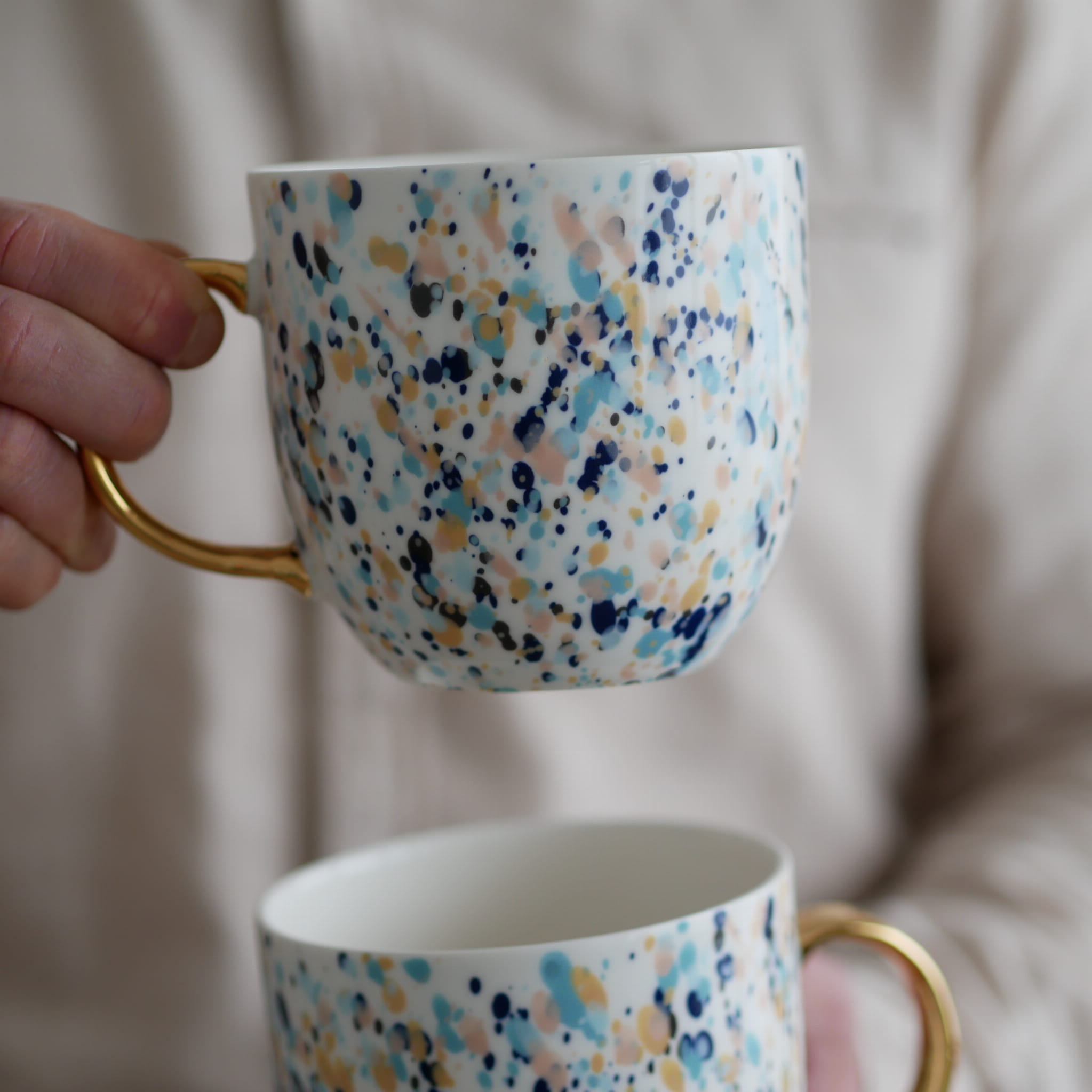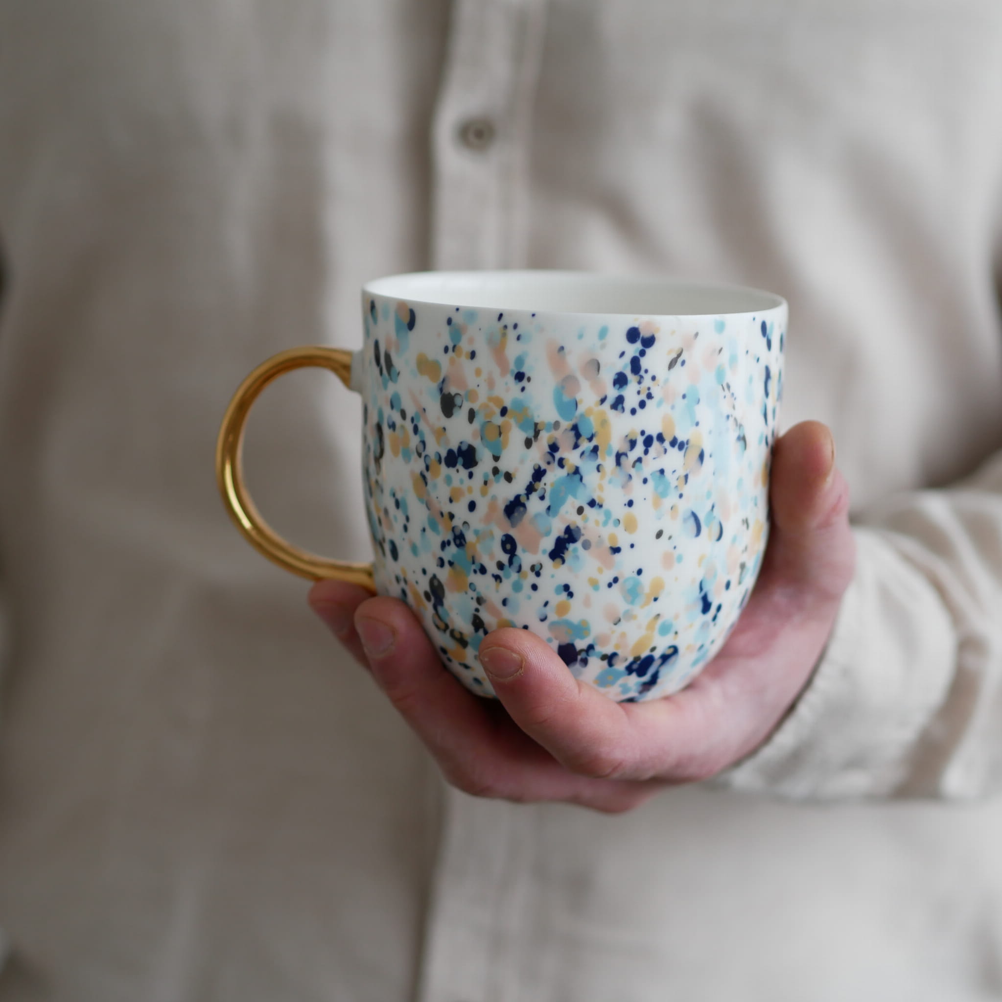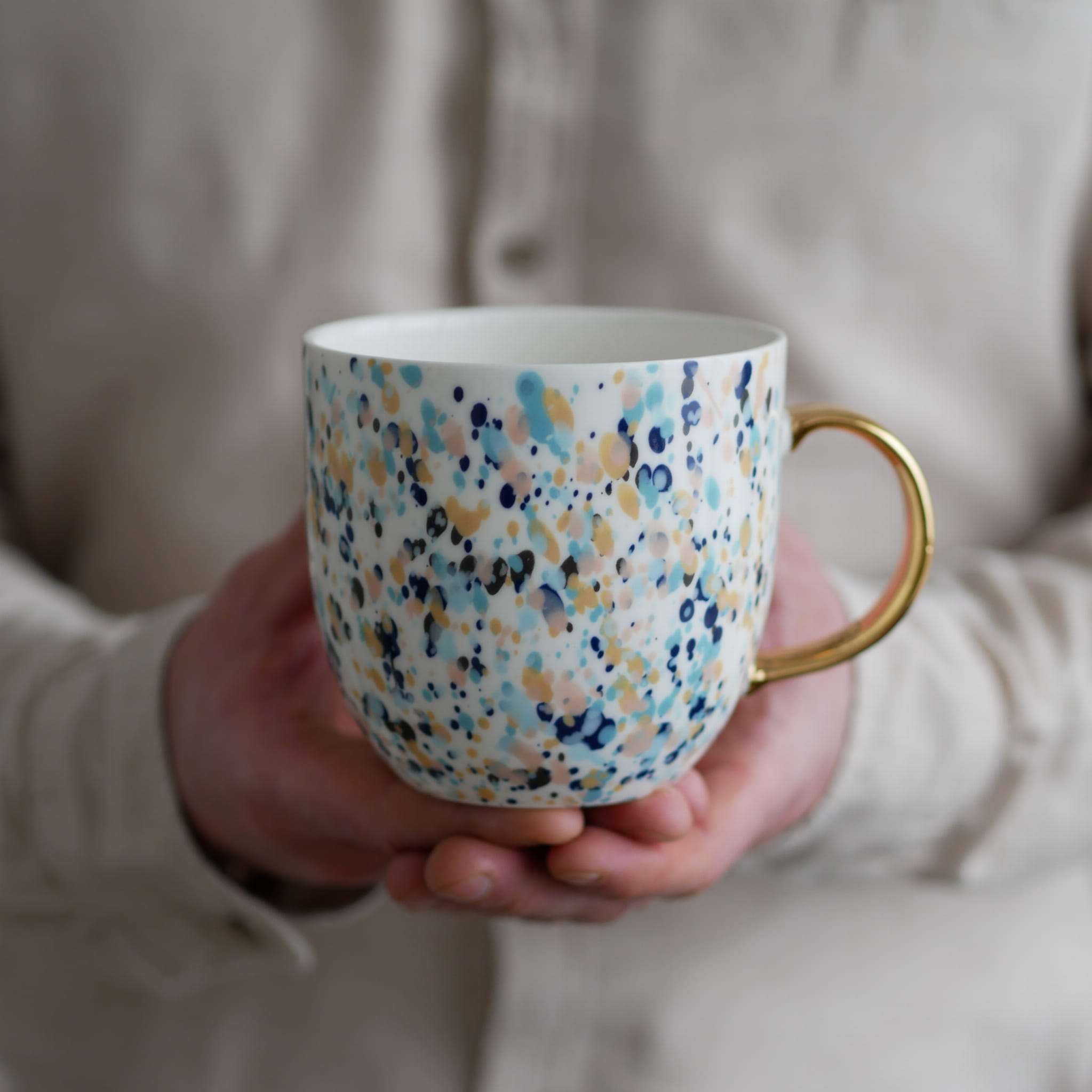 Duży kubek w kolorowe kropki ze złotym uszkiem.
