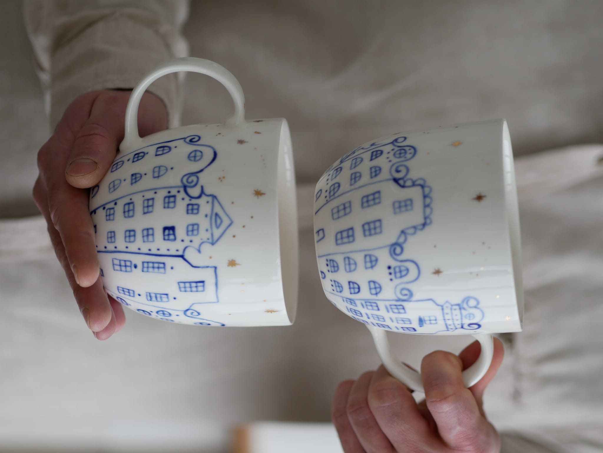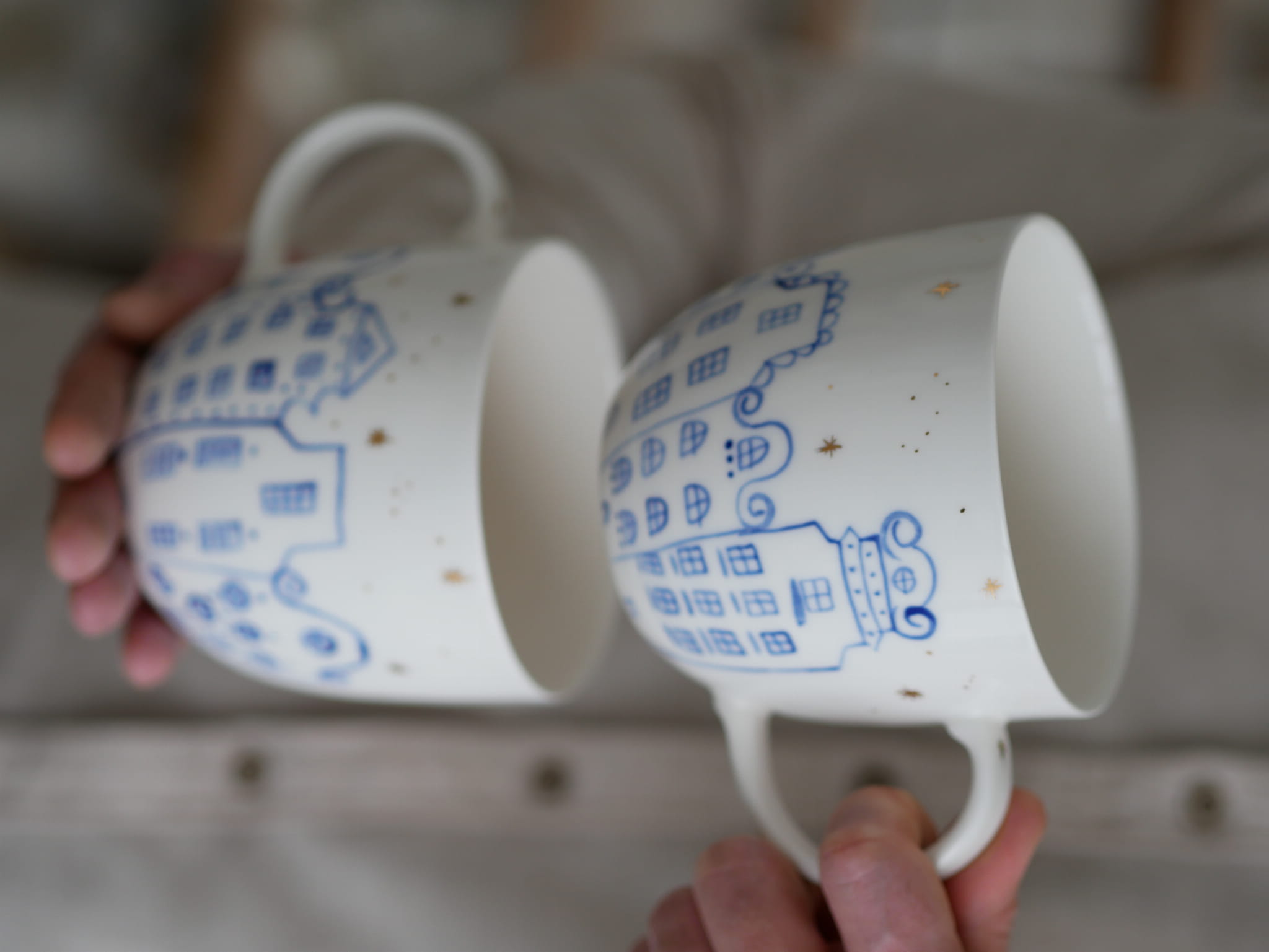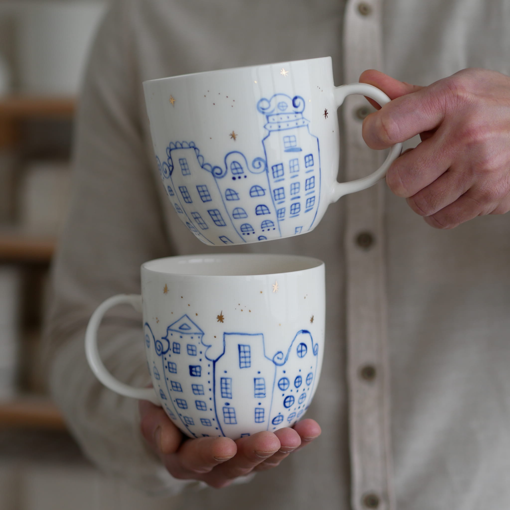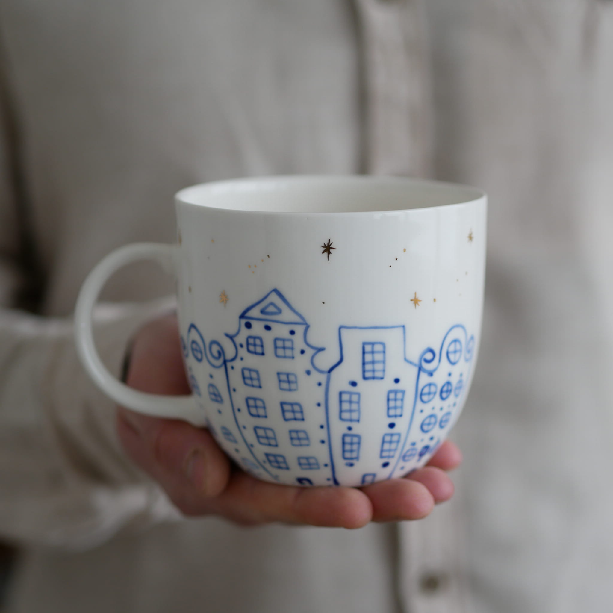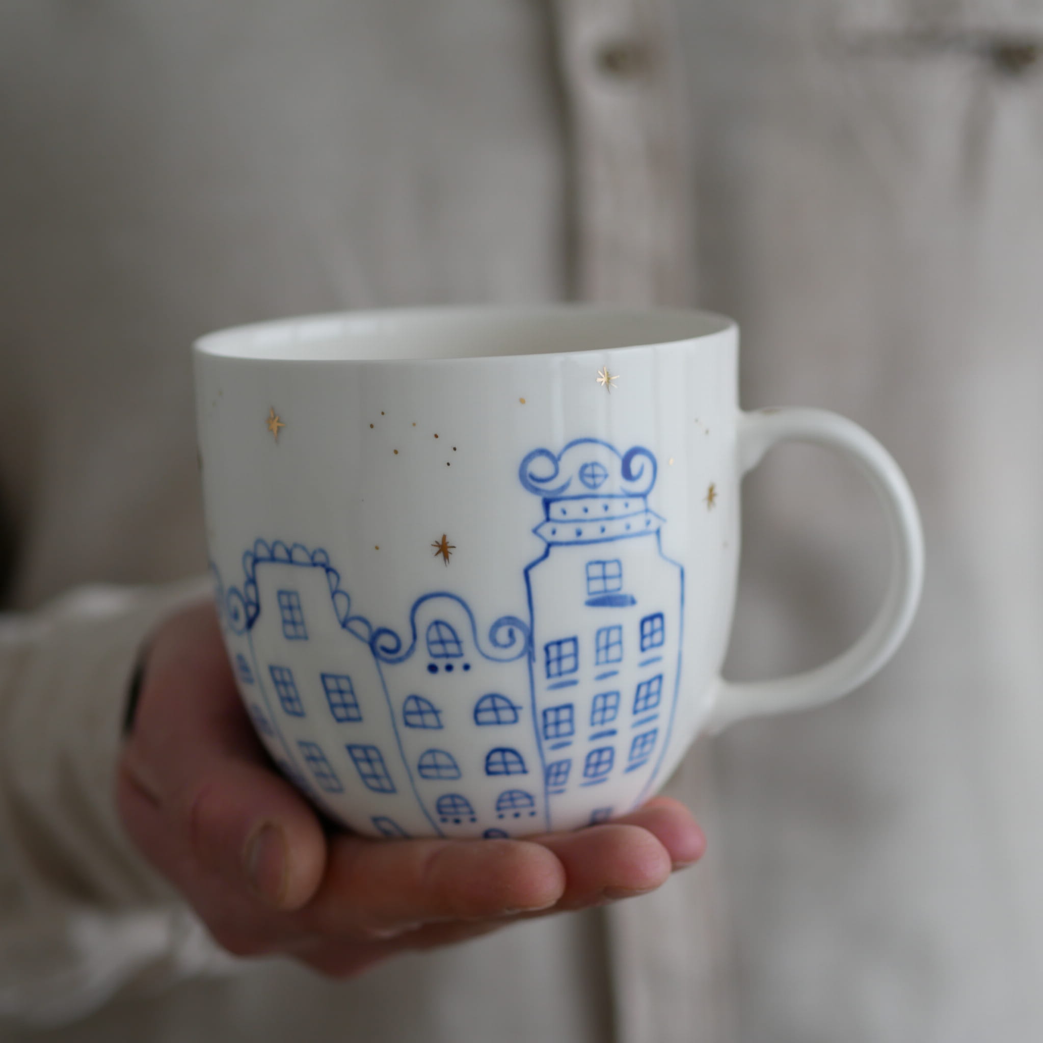 Kubek w kobaltowe kamienice ze złotymi gwiazdkami.
