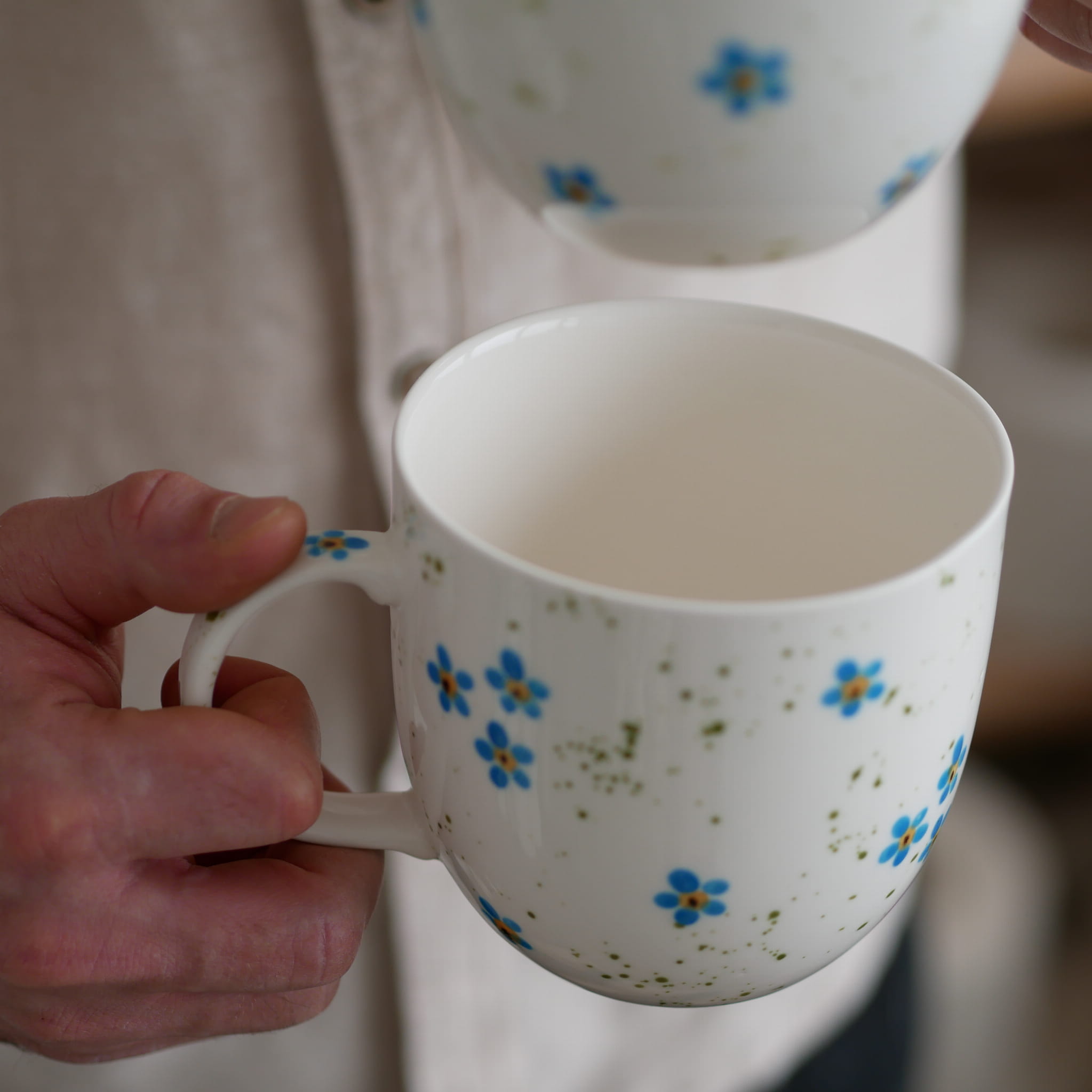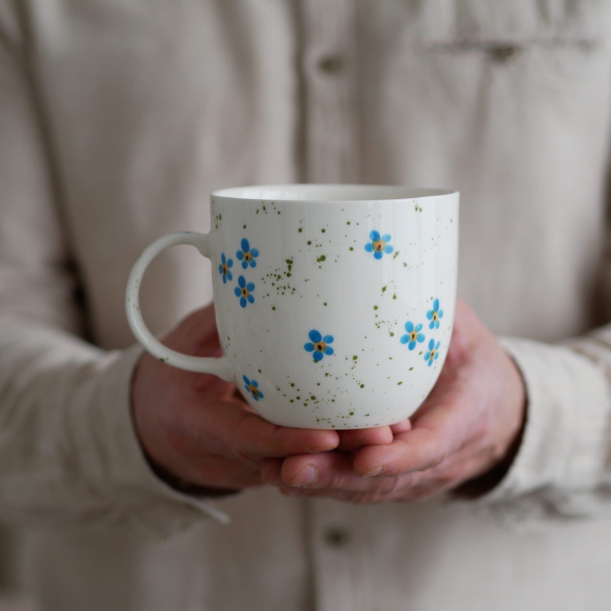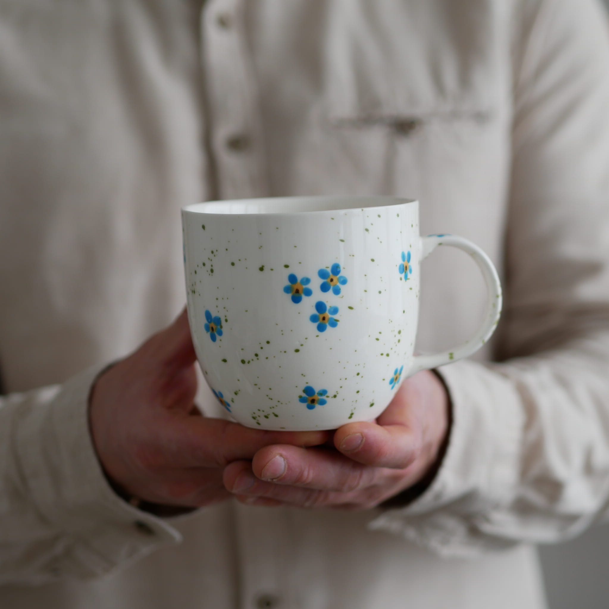 Duży kubek z pięknymi niezapominajkami.