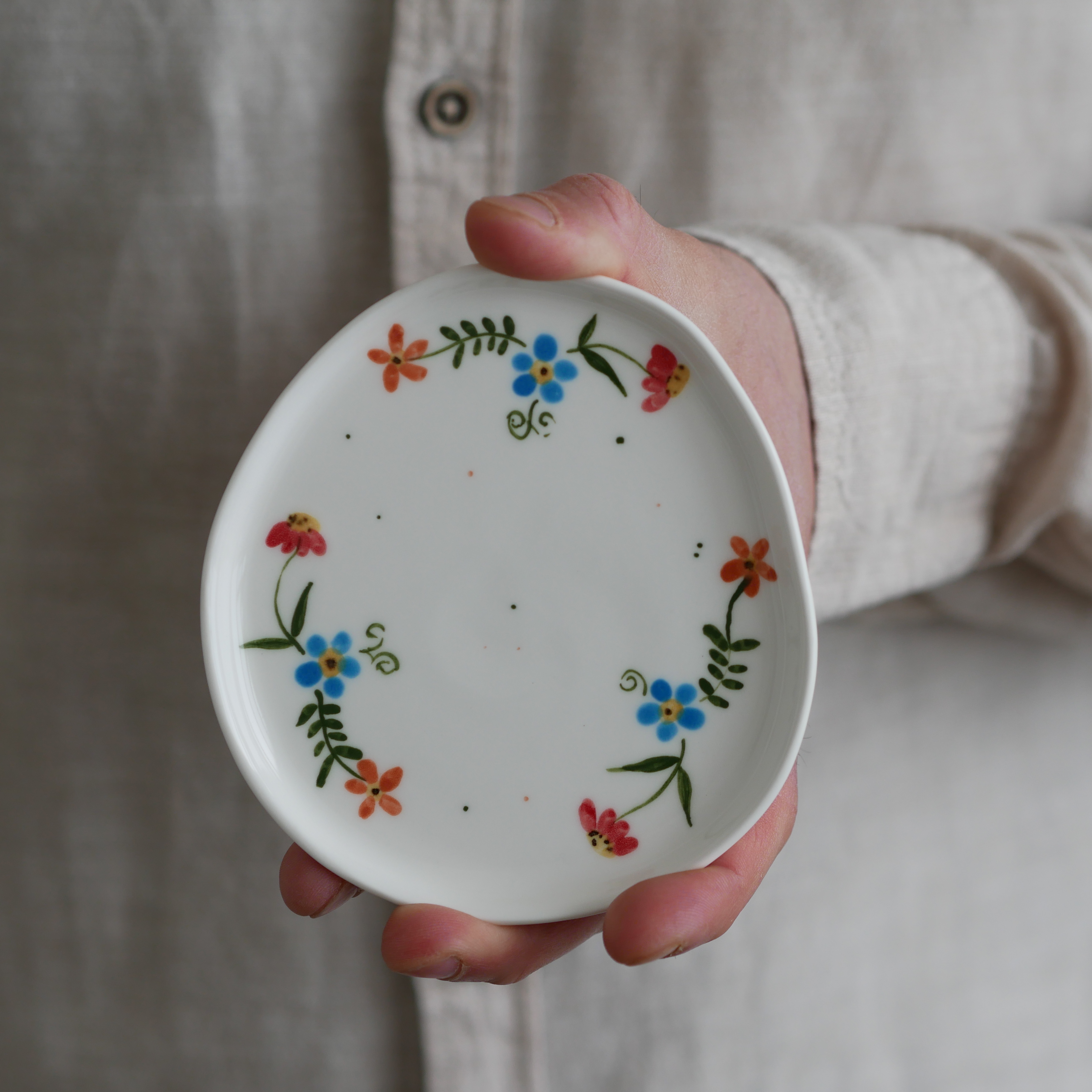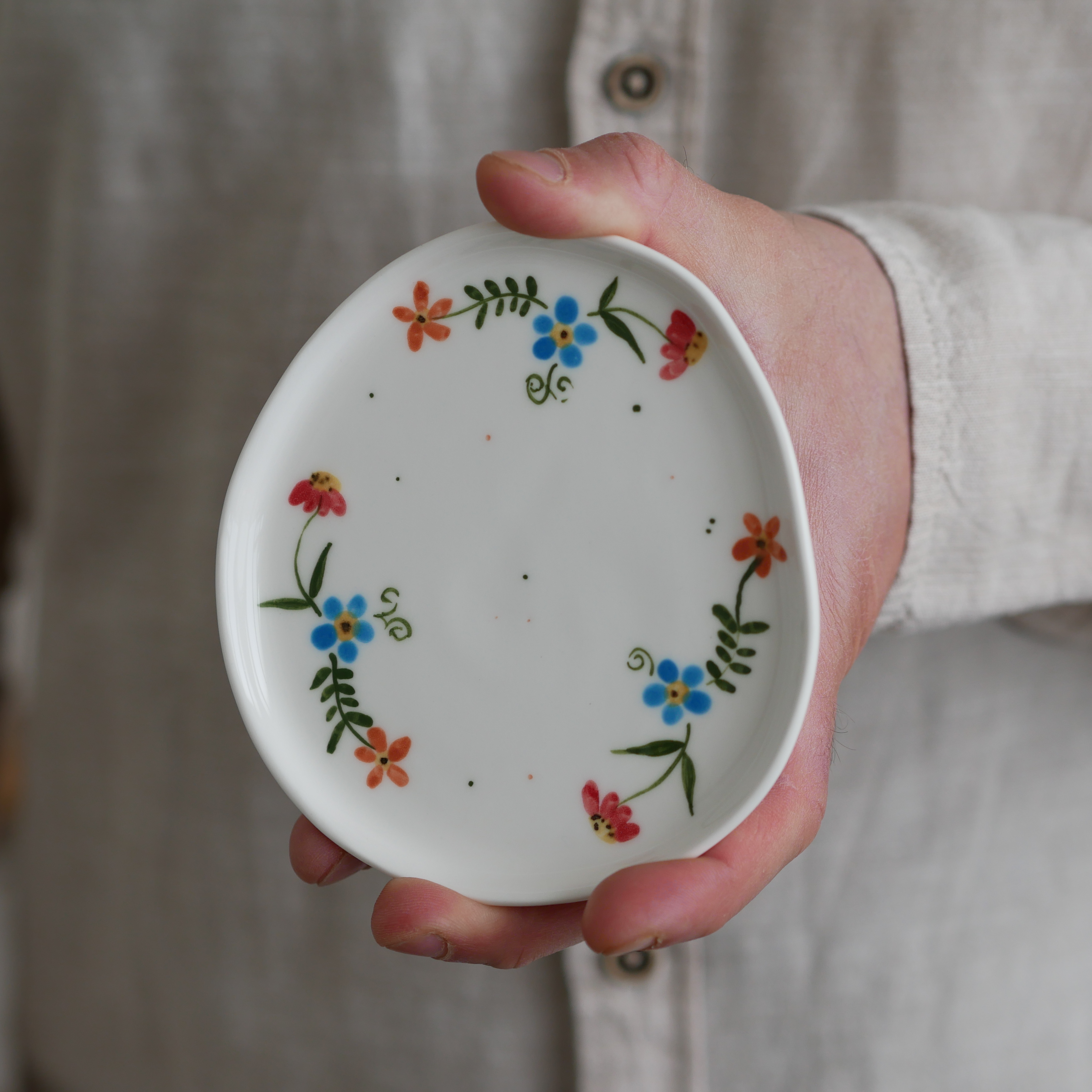 Kwiaty maluję ręcznie, dlatego na każdym talerzyku wzór będzie wyglądać inaczej - zdjęcie poglądowe.