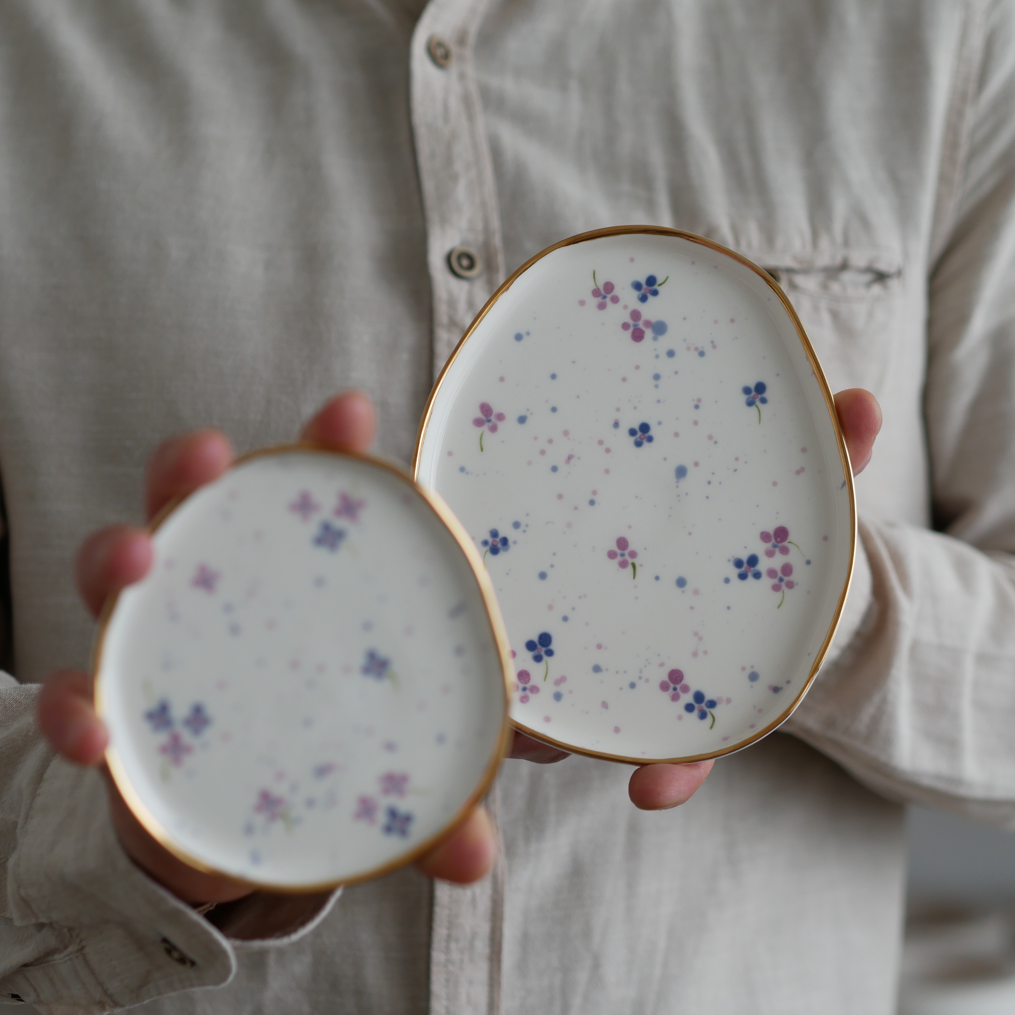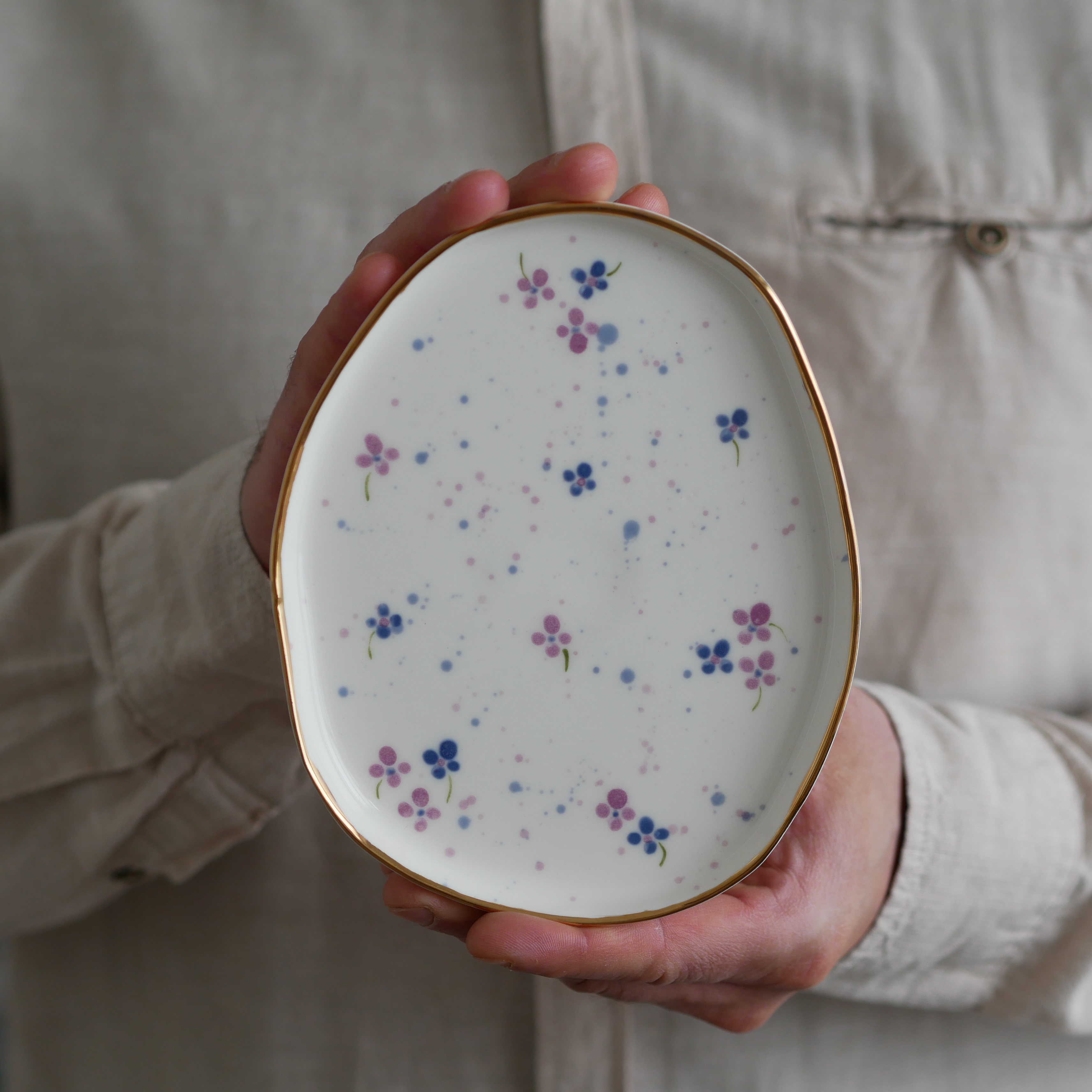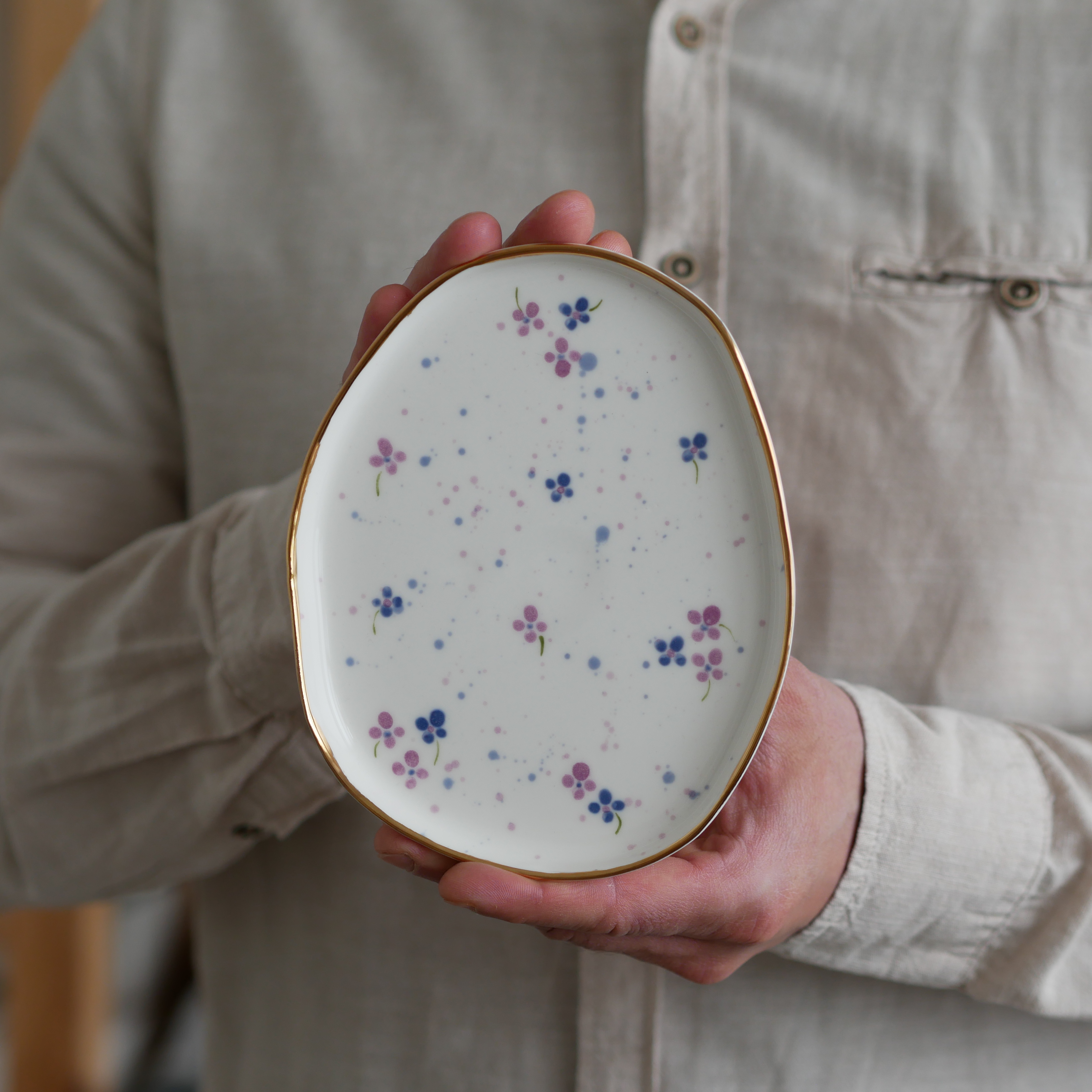 Talerzyk na drobiazgi biały w urocze fioletowe kwiatuszki - idealny na biżuterię!