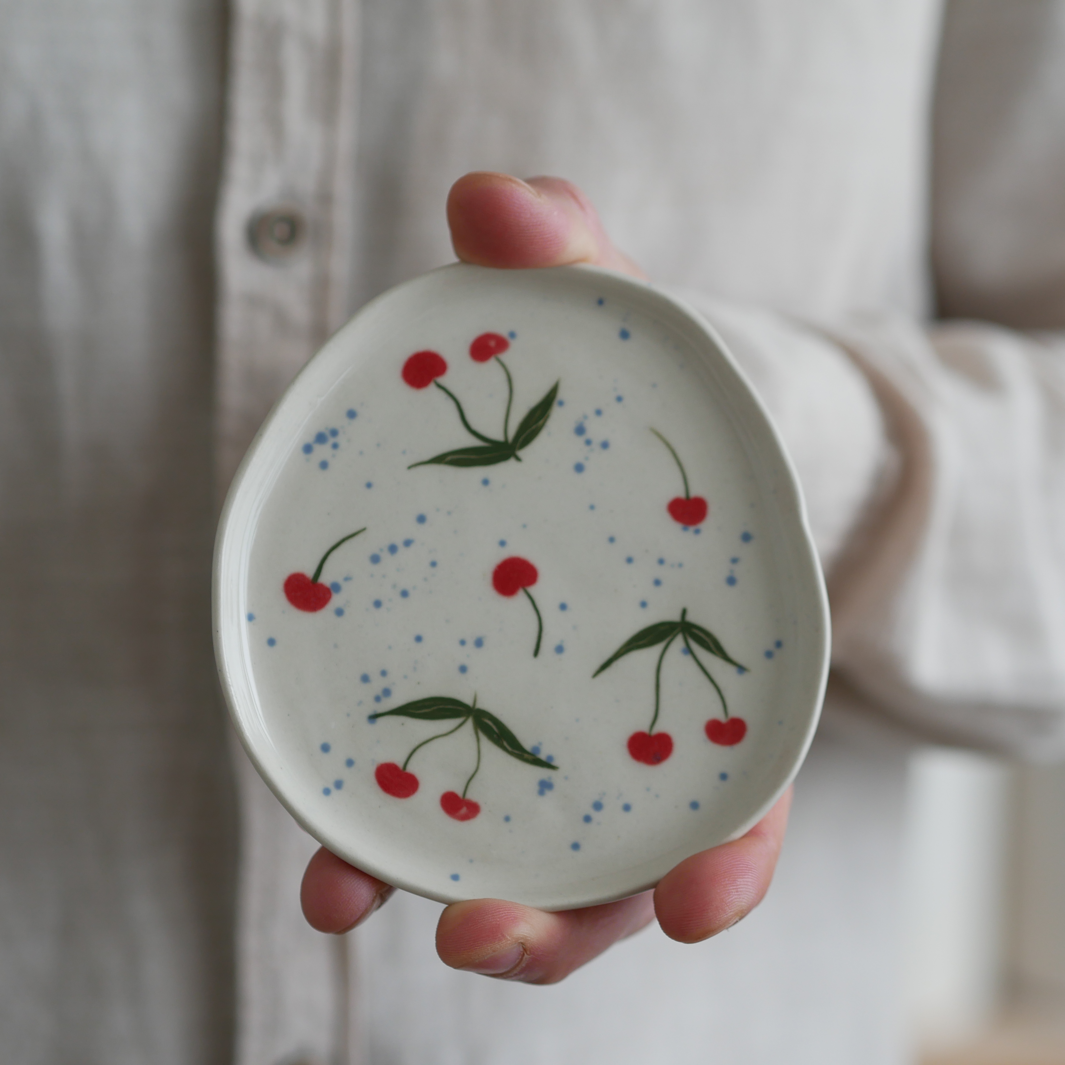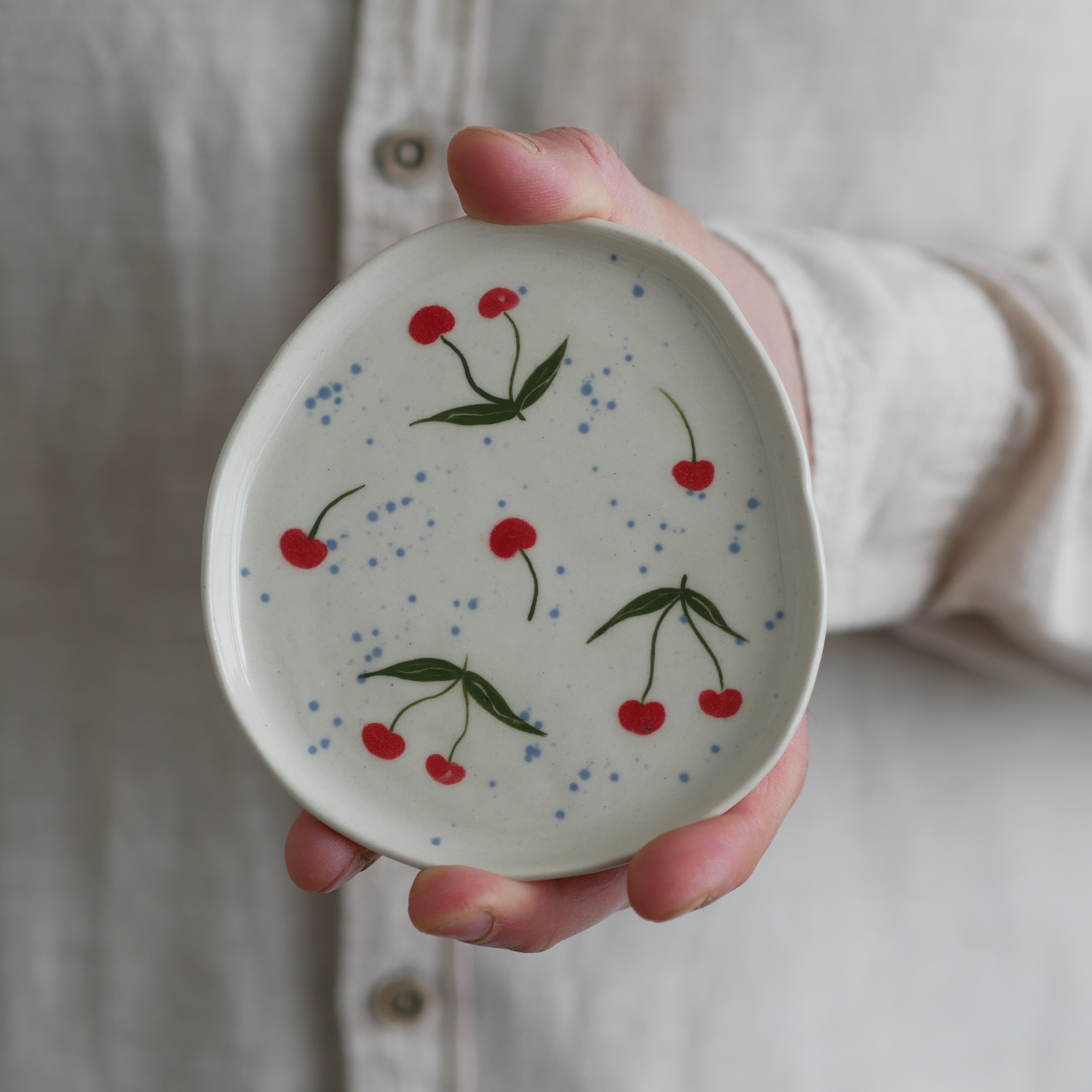Mały talerzyk na drobiazgi biały w uroczymi wisienkami - idealny na biżuterię!