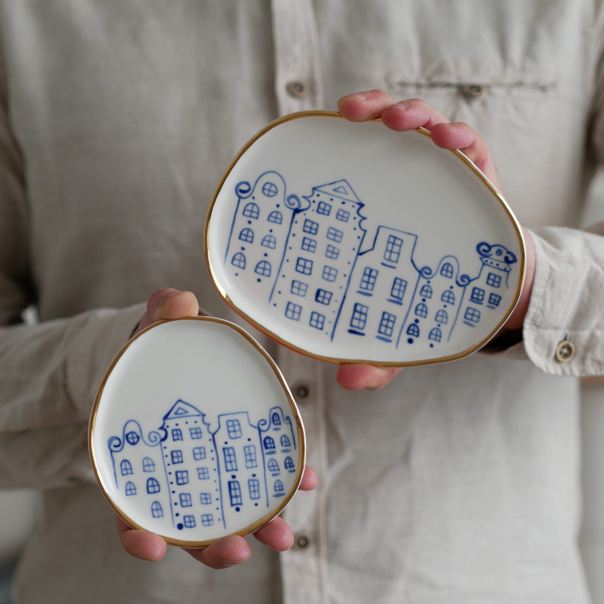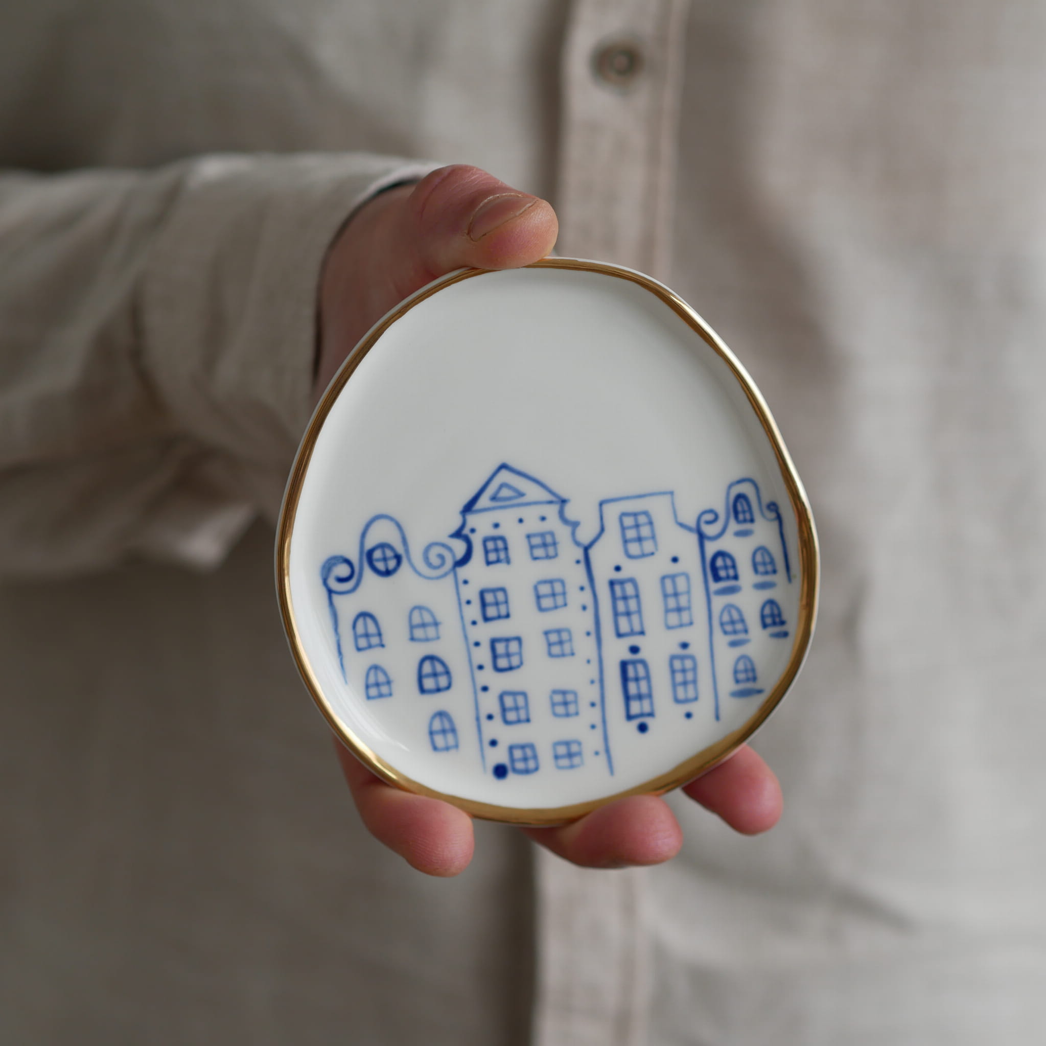 Talerzyk na drobiazgi kamienice 11x9cm (S) ze złotym rantem