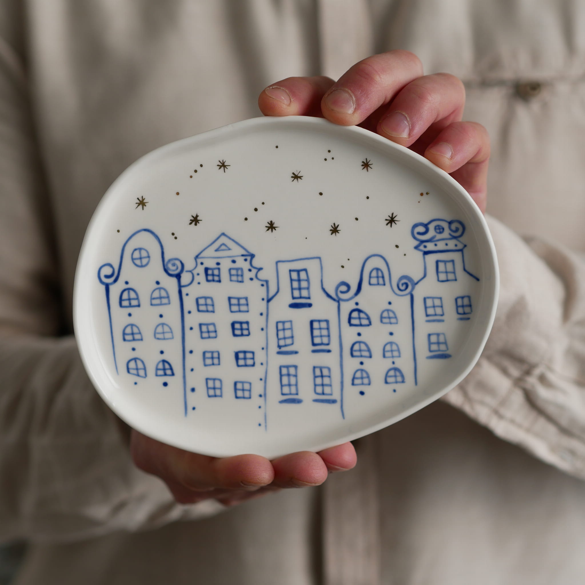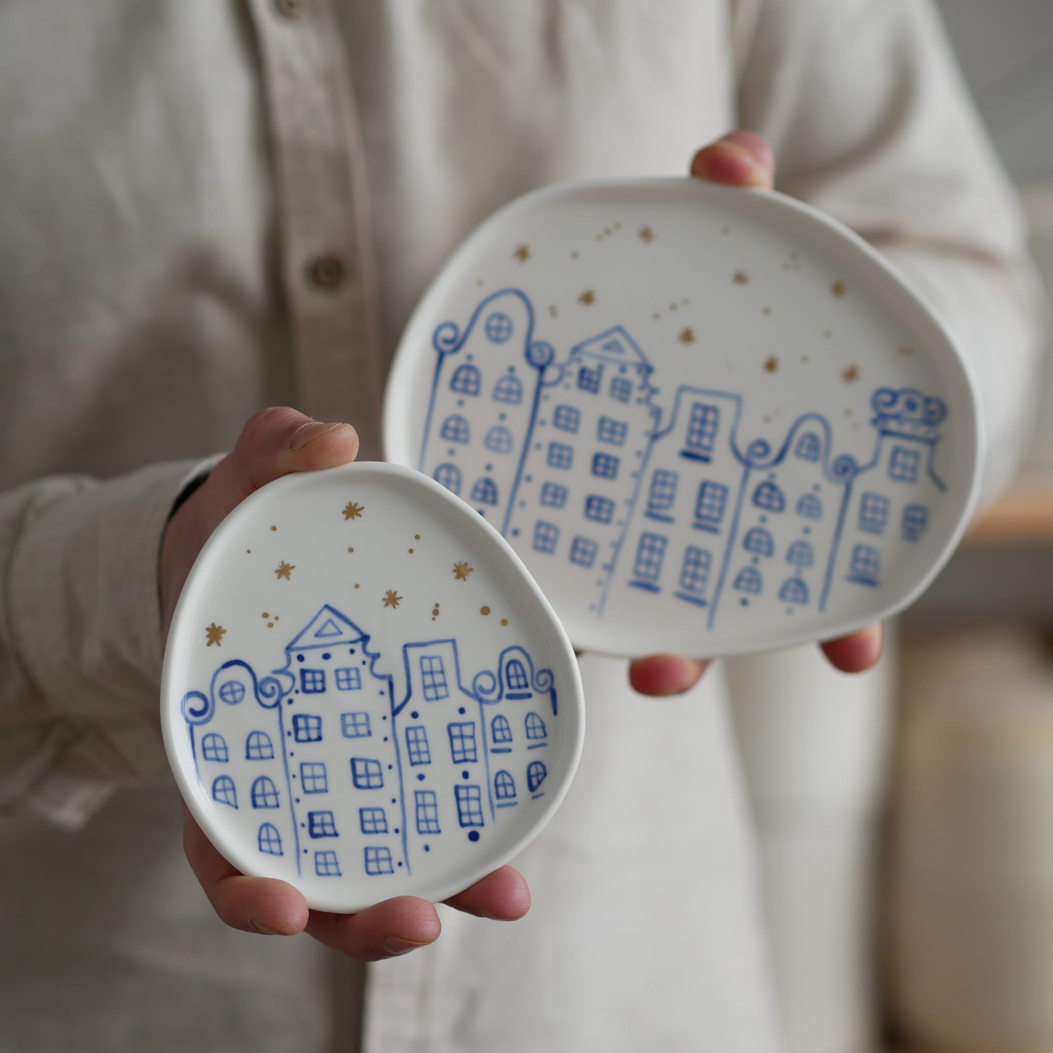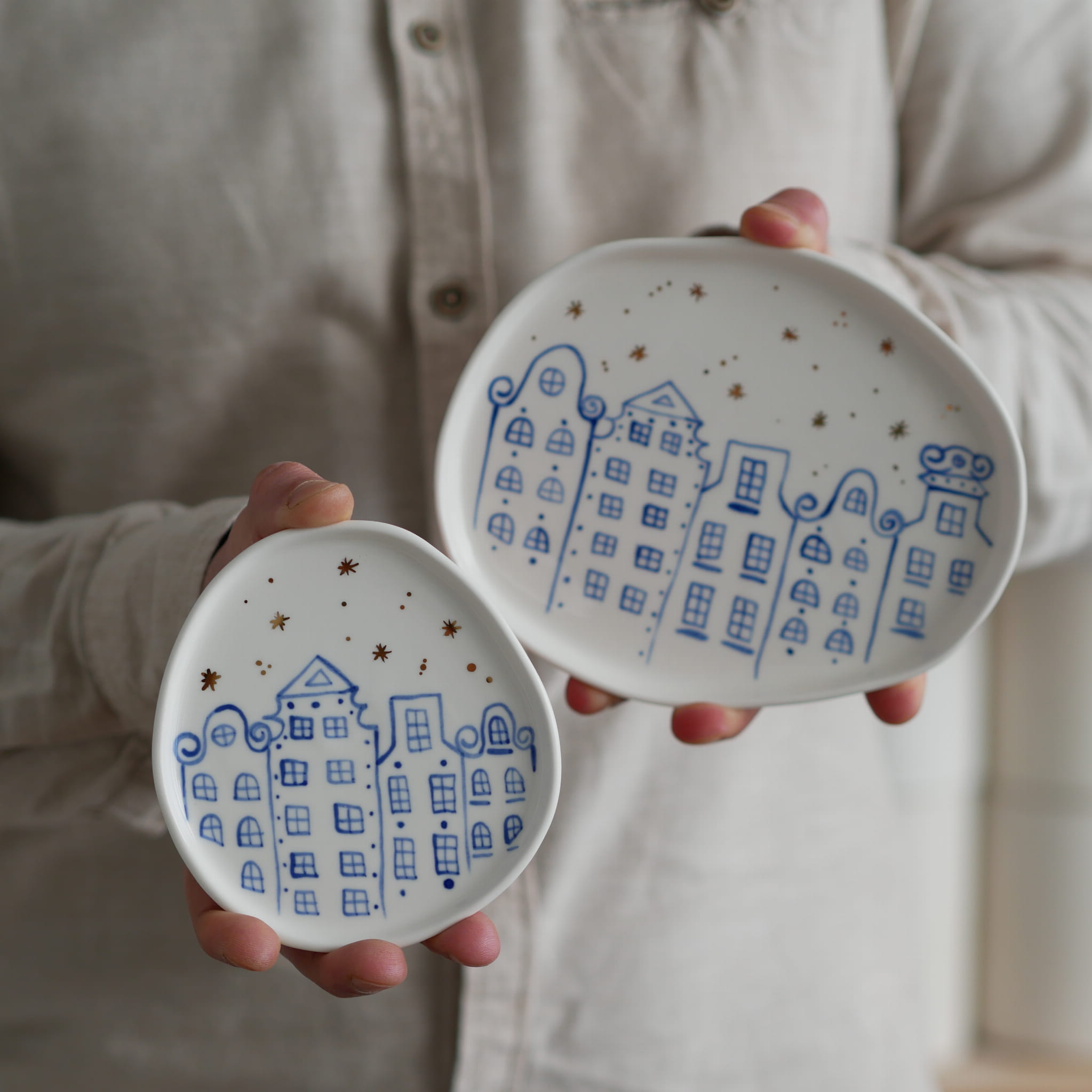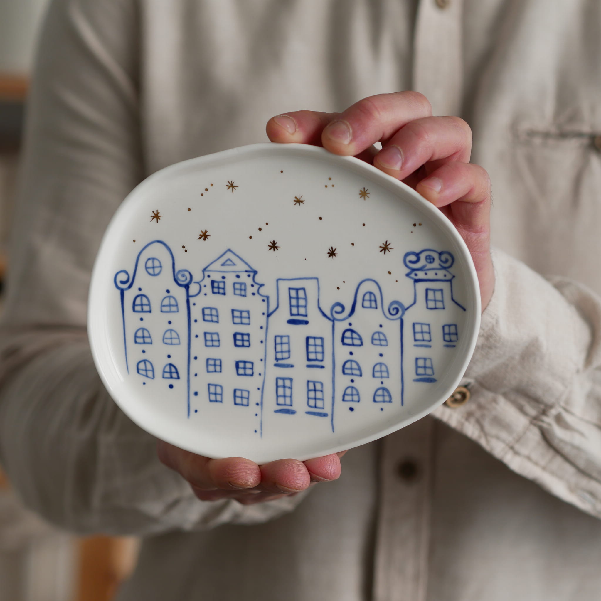 Talerzyk na drobiazgi biały w kobaltowe kamienice - idealny na biżuterię!