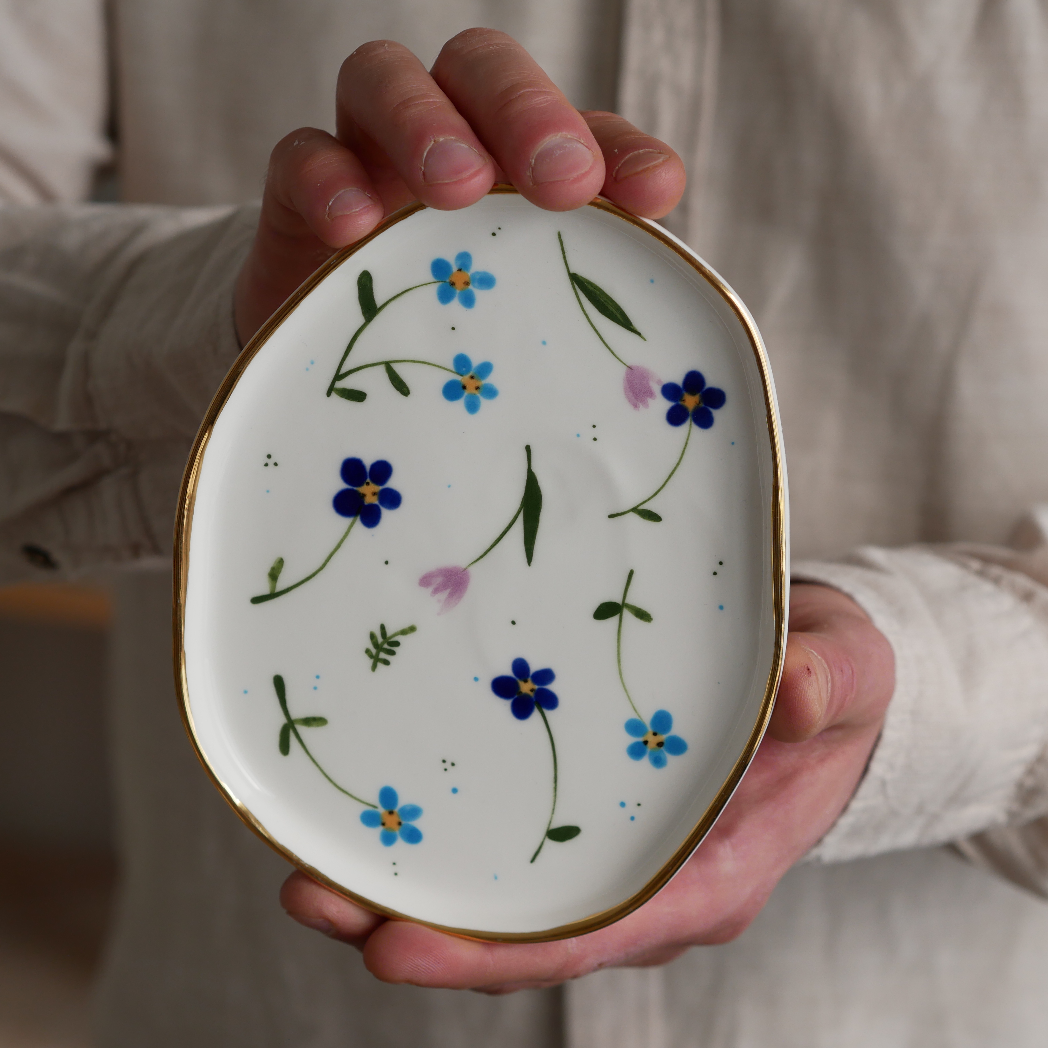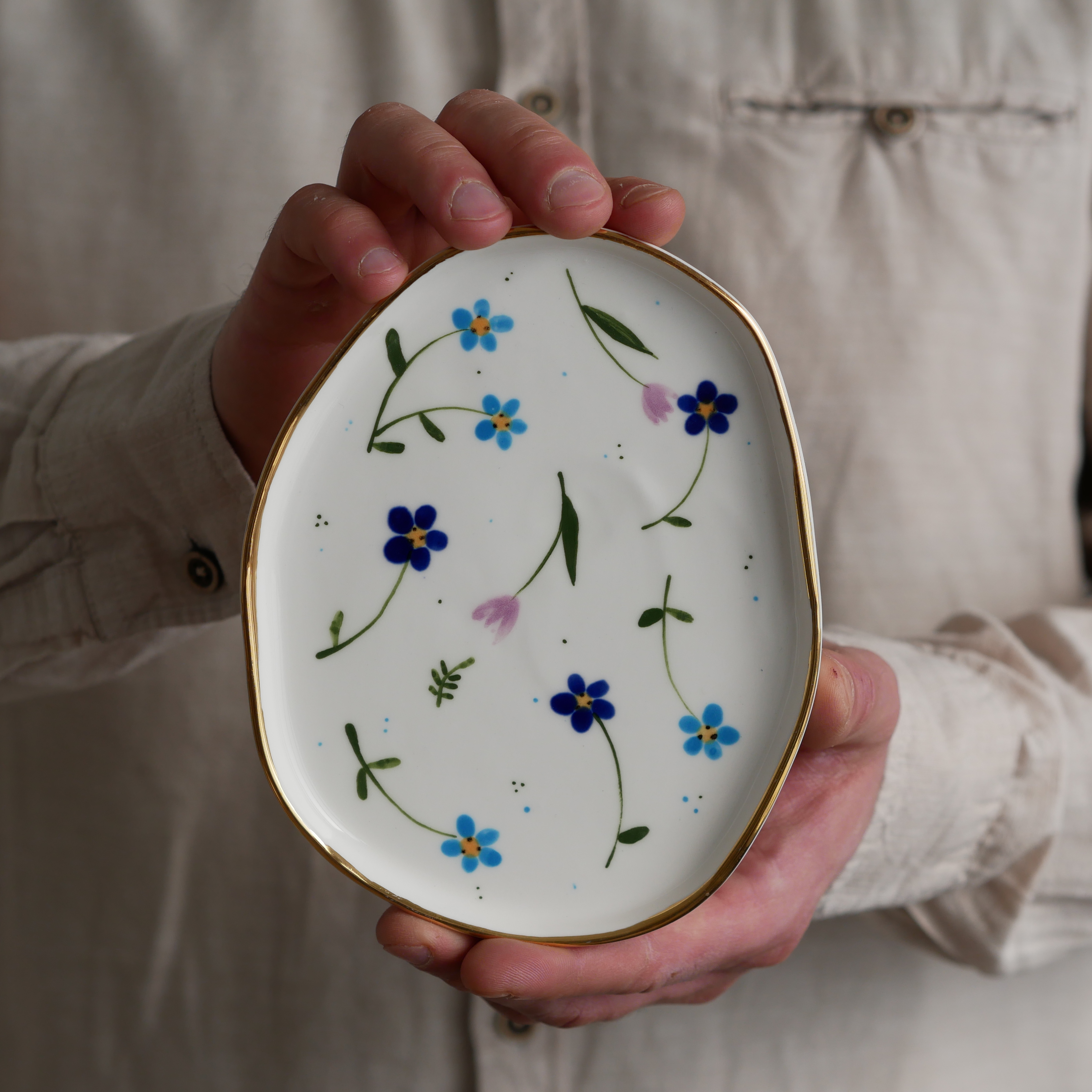 Talerzyk na drobiazgi podmuchy niebieskie ze złotym rantem 13x16,5cm (M)
