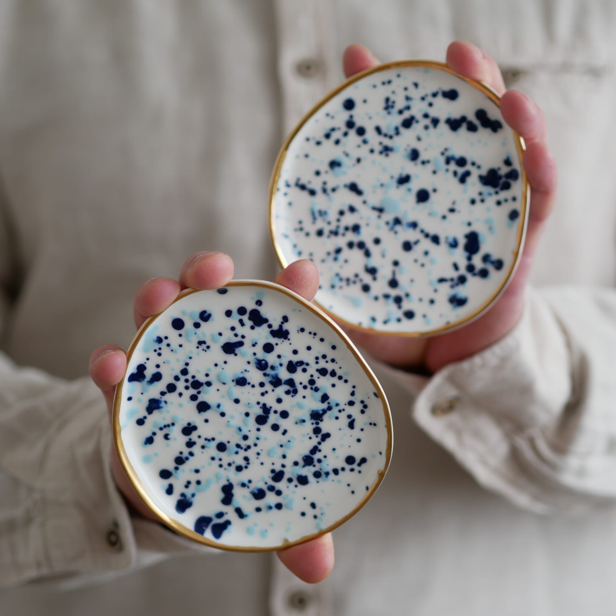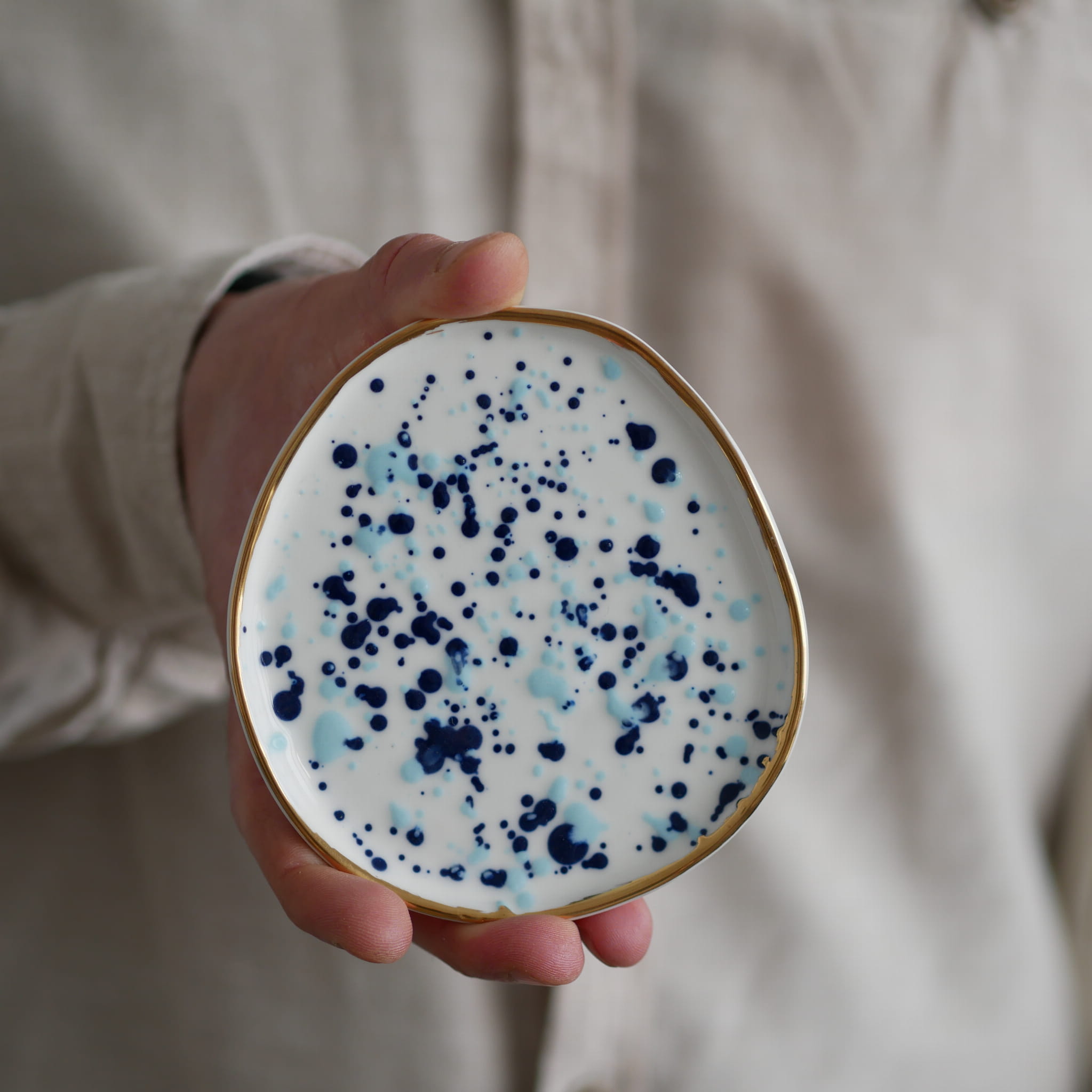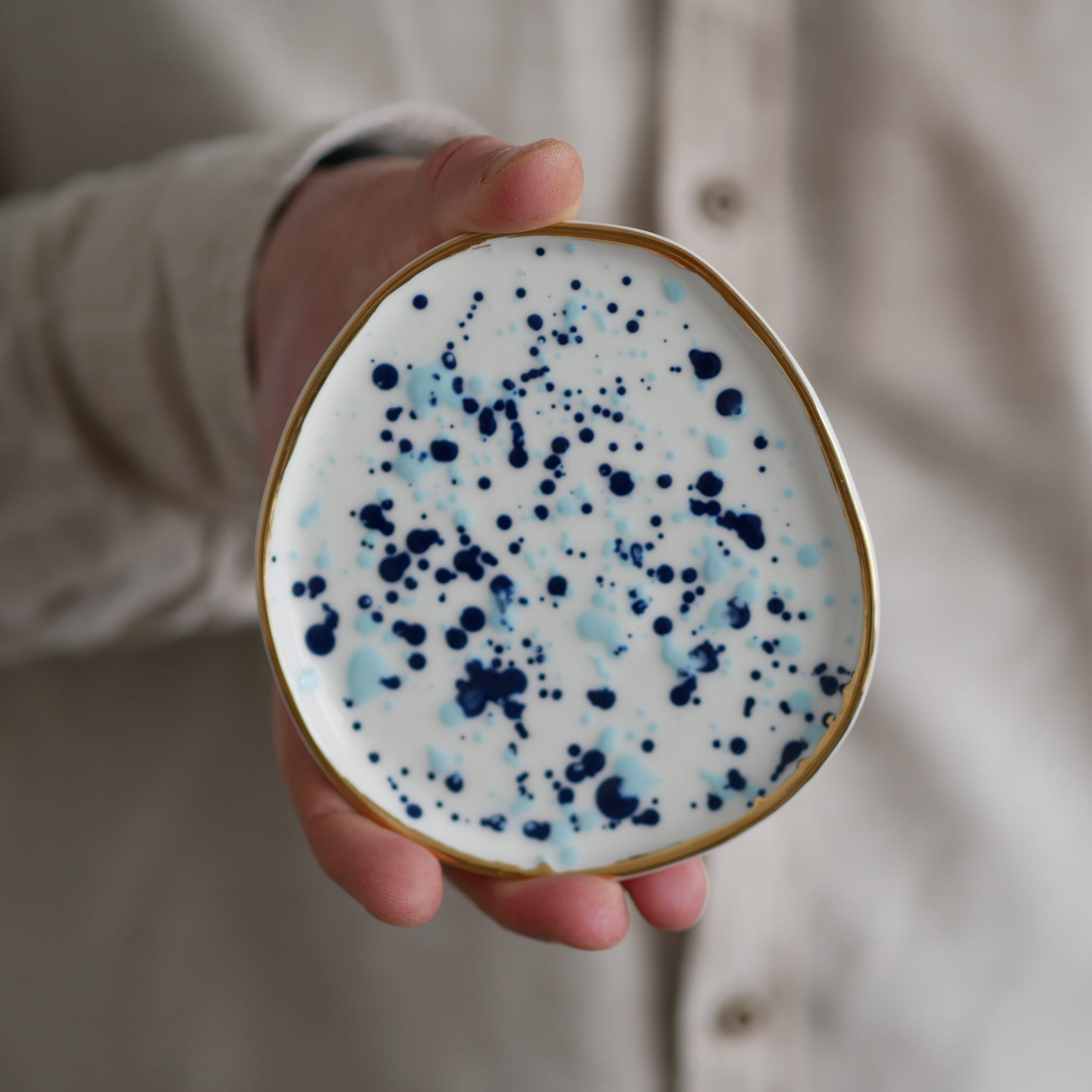Talerzyk na drobiazgi w kobaltowo niebieskie kropki ze złotym rantem 11x9cm (S)